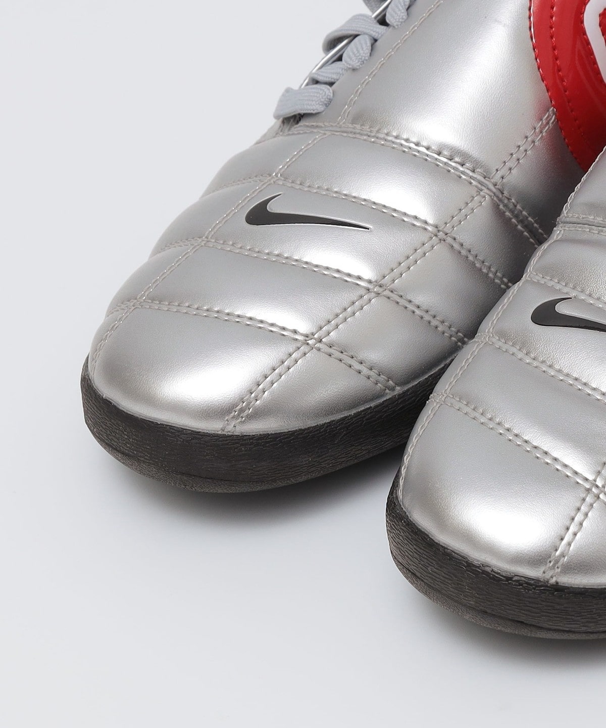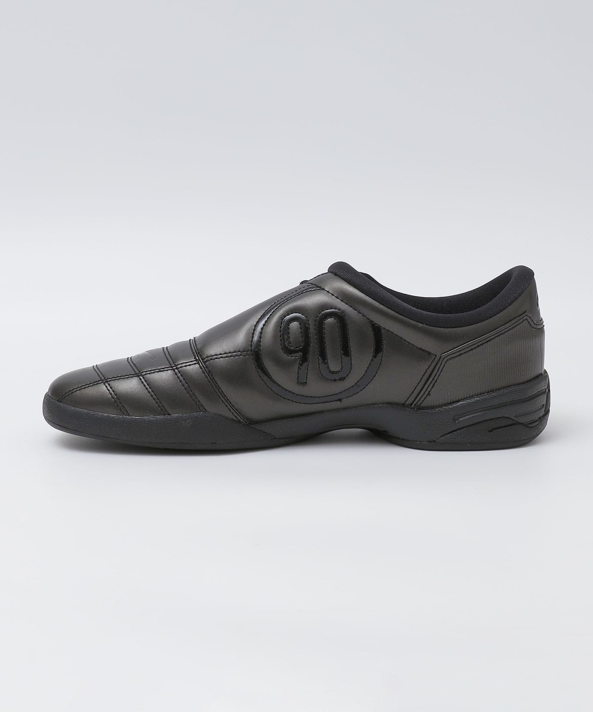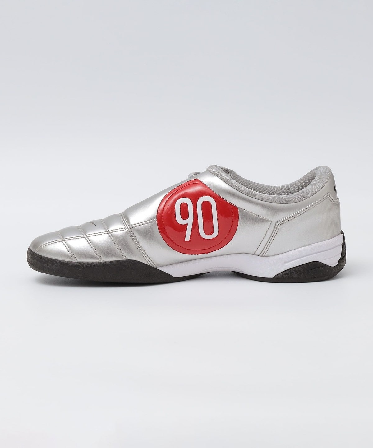 オールブラックのカラーと光沢仕上げのメタリックシルバーにアイコニックなレッドで描かれた90の文字との2色展開で、目を惹く1足に仕上がっております。