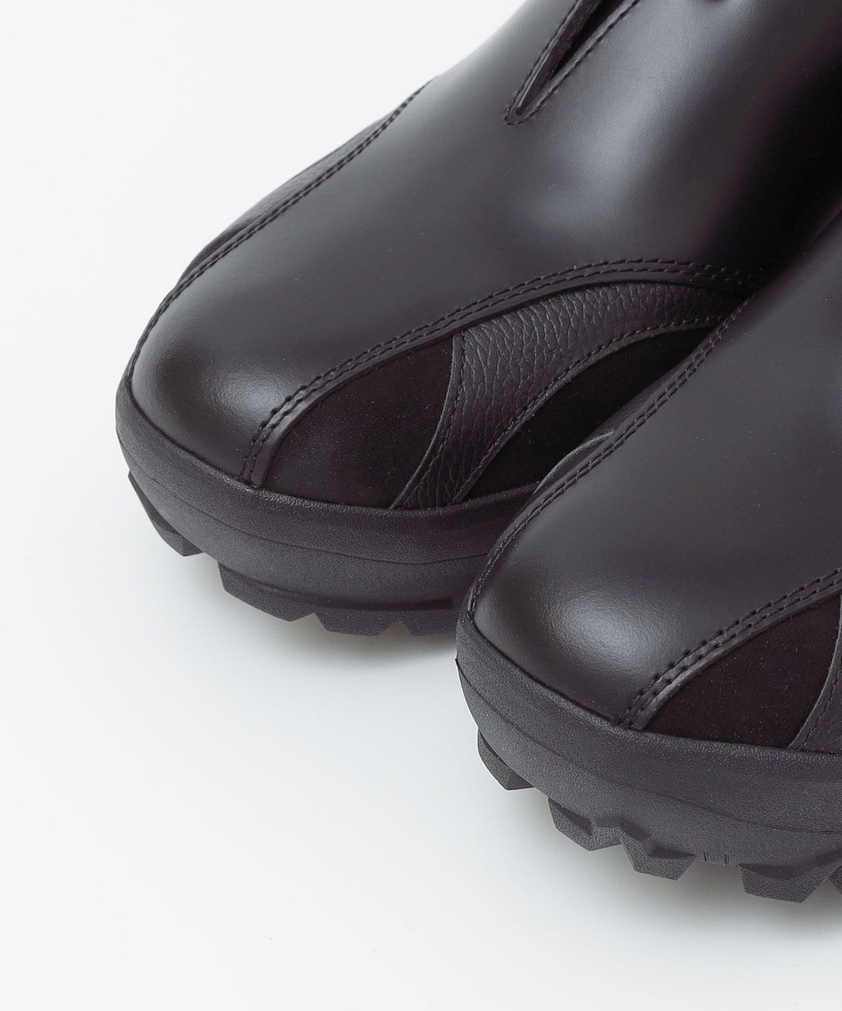アッパー全体は重厚感のある3本のレザーカーブで構成され、見る角度でラインがねじれ、動きの軌跡を描くイメージ。