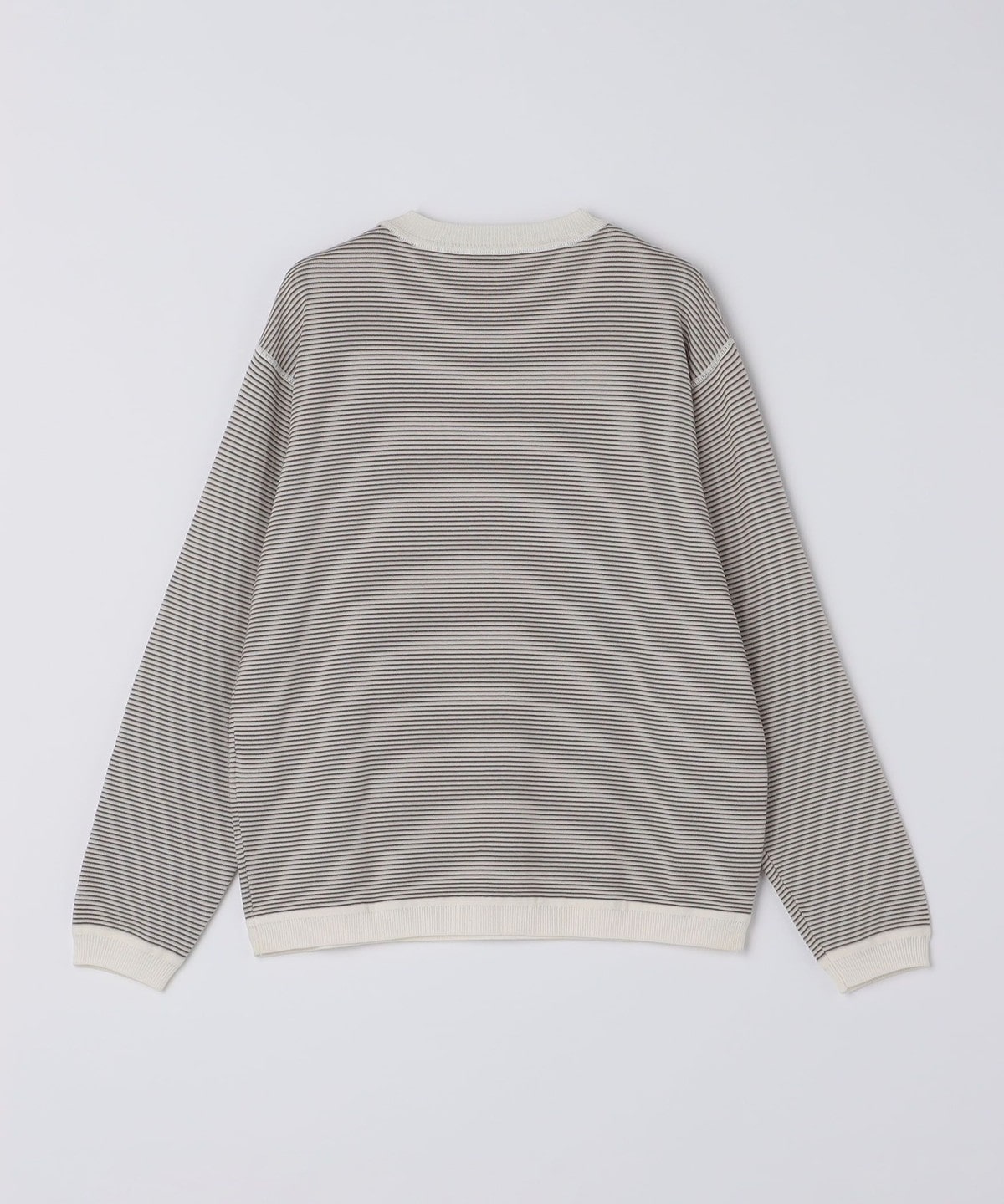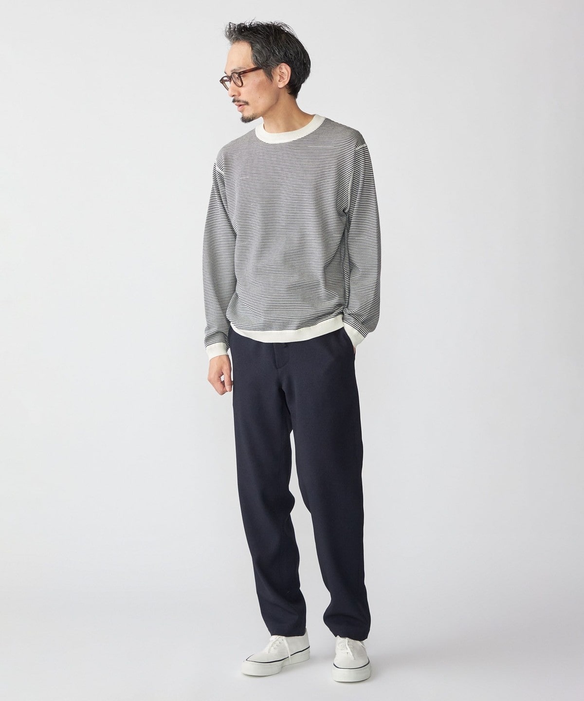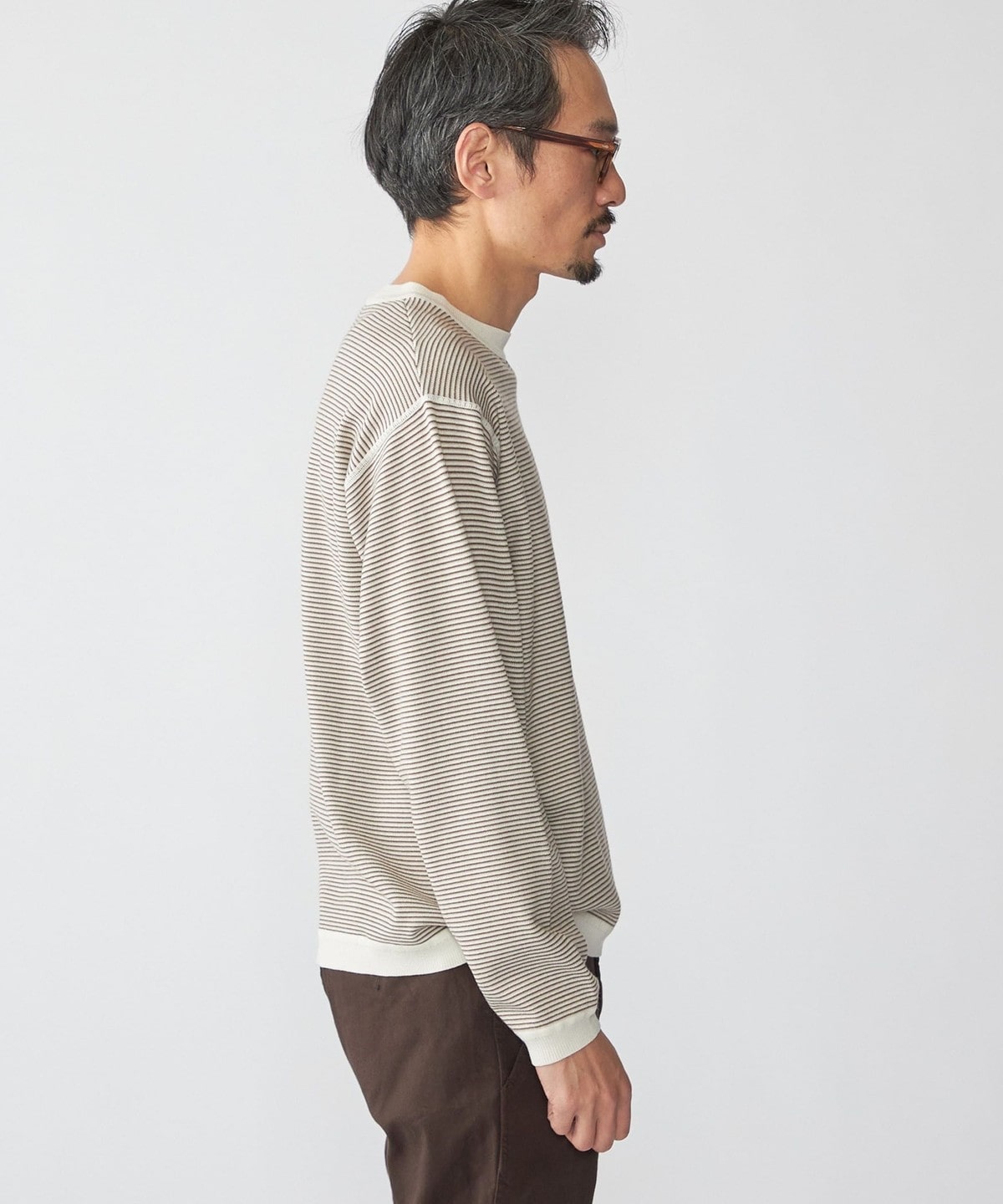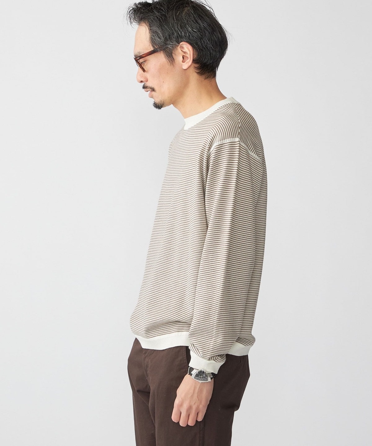 【デザイン】リラクシーな程よくゆとりのあるシルエットのマイクロボーダークルーネックプルオーバー。