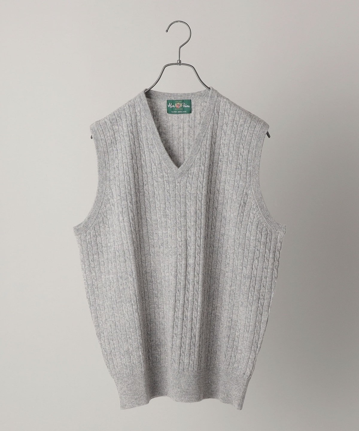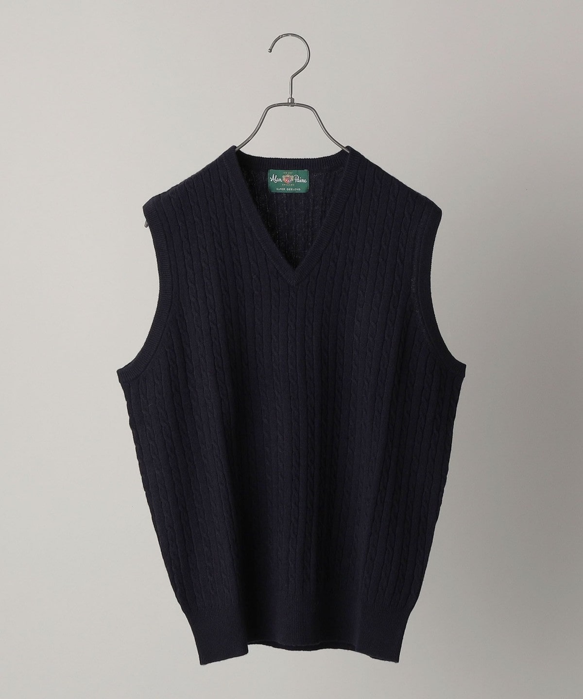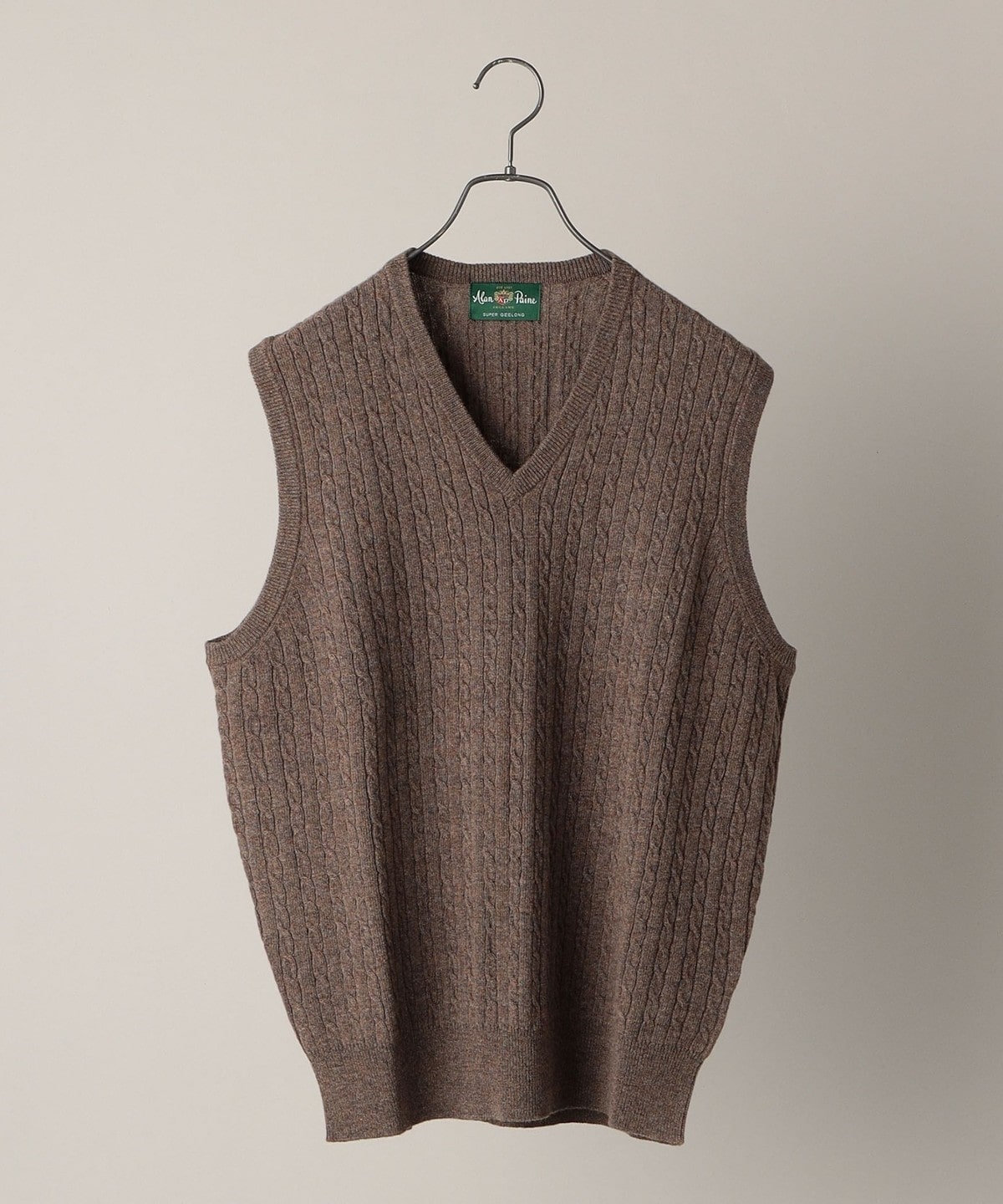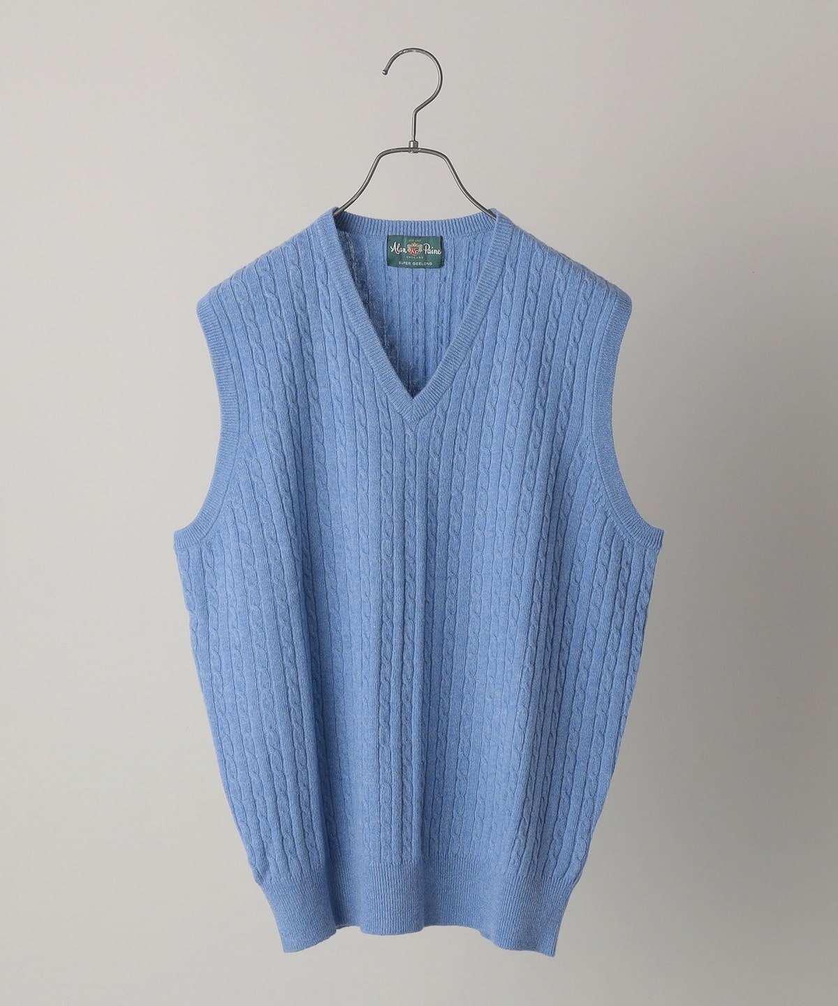 ALAN PAINE: 12ゲージ ジーロンラム ケーブル編み Vネック ニットベスト