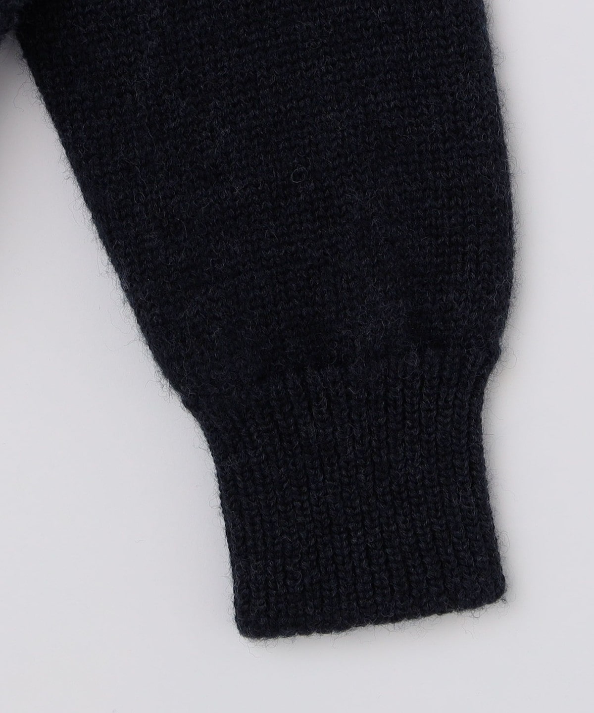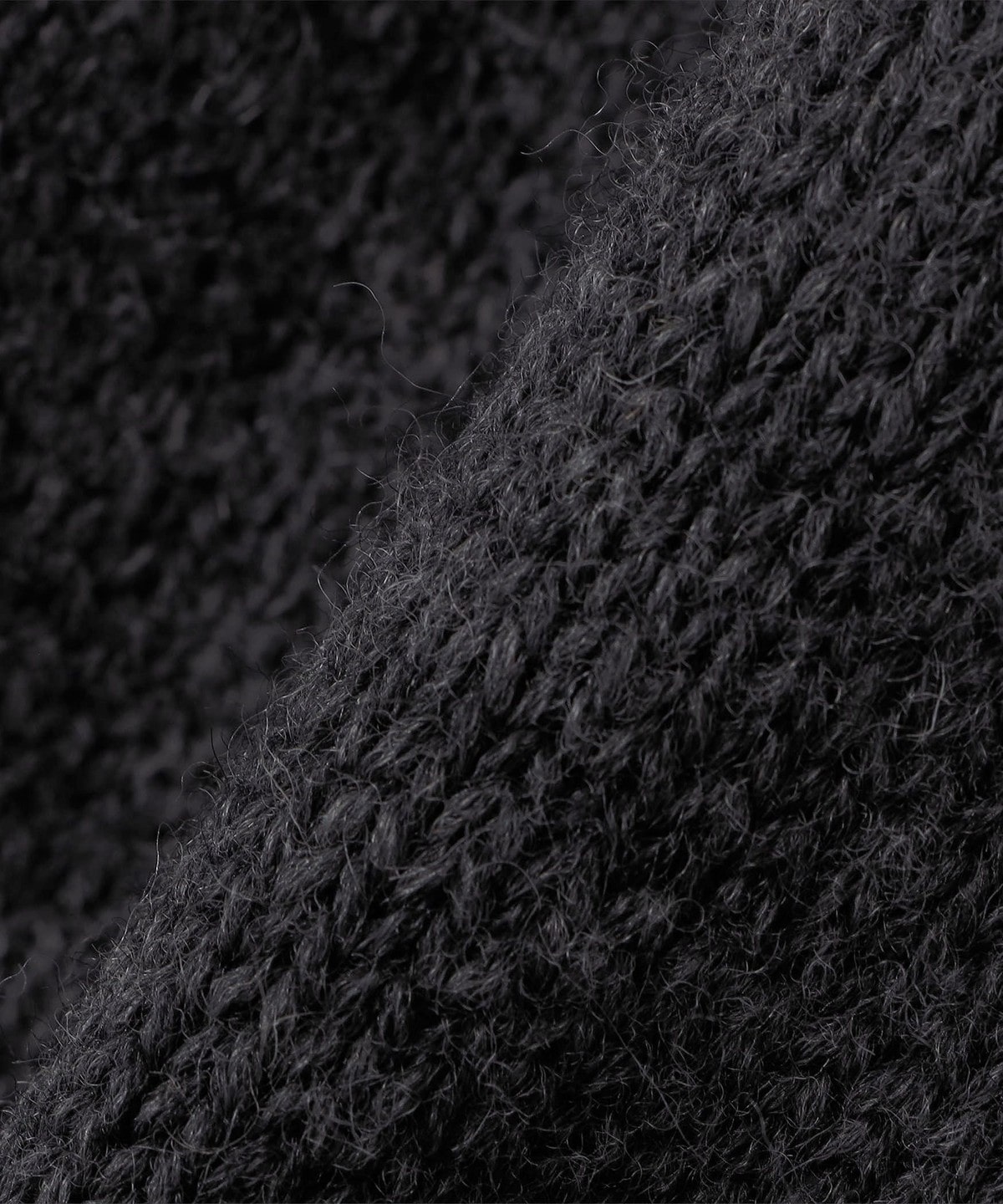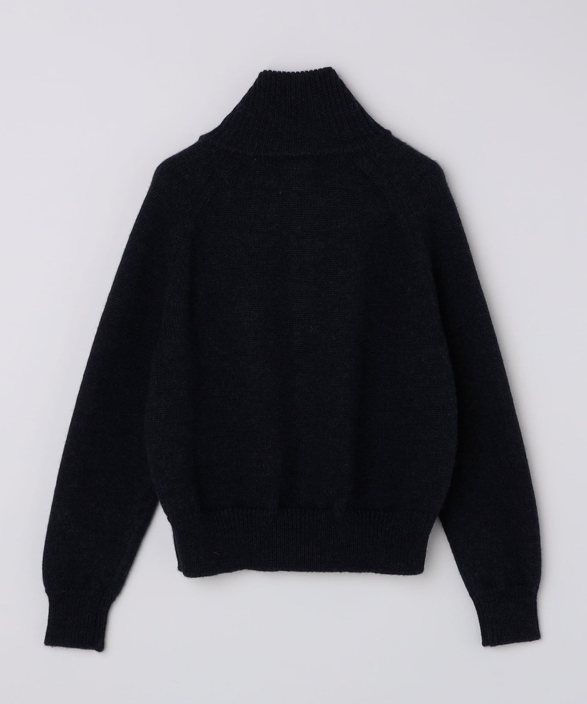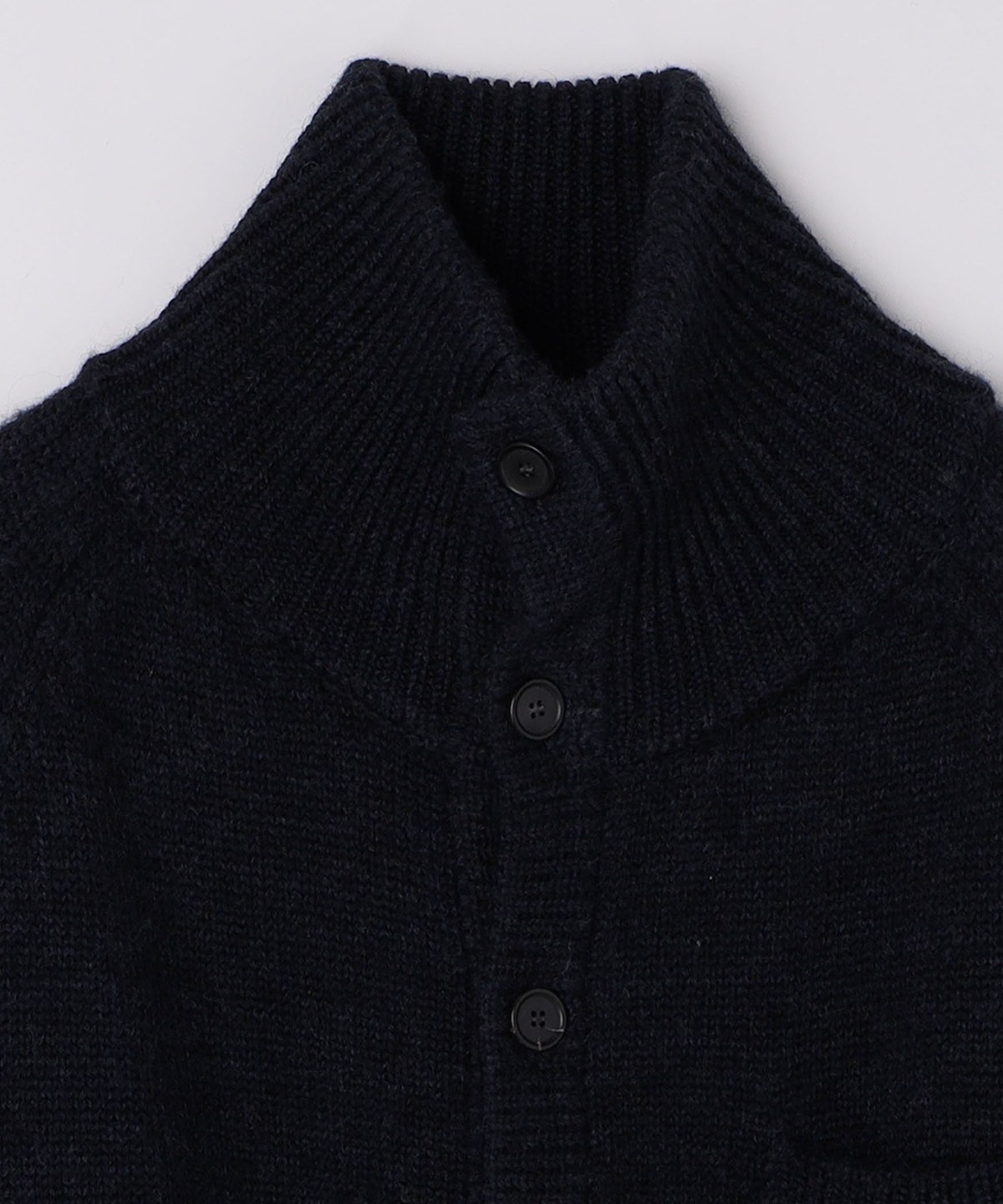 度目の詰まったヴァージンウールを使用し編み立てたスタンドカラーのカバーオール型ニットジャケット。