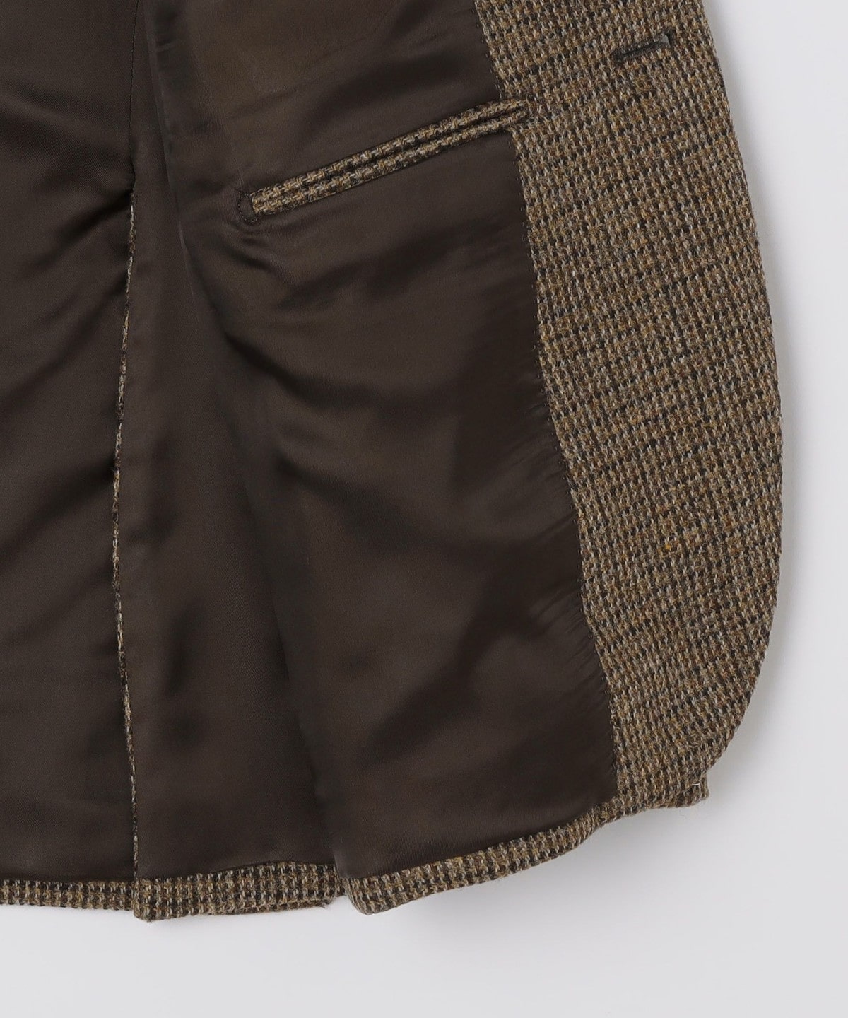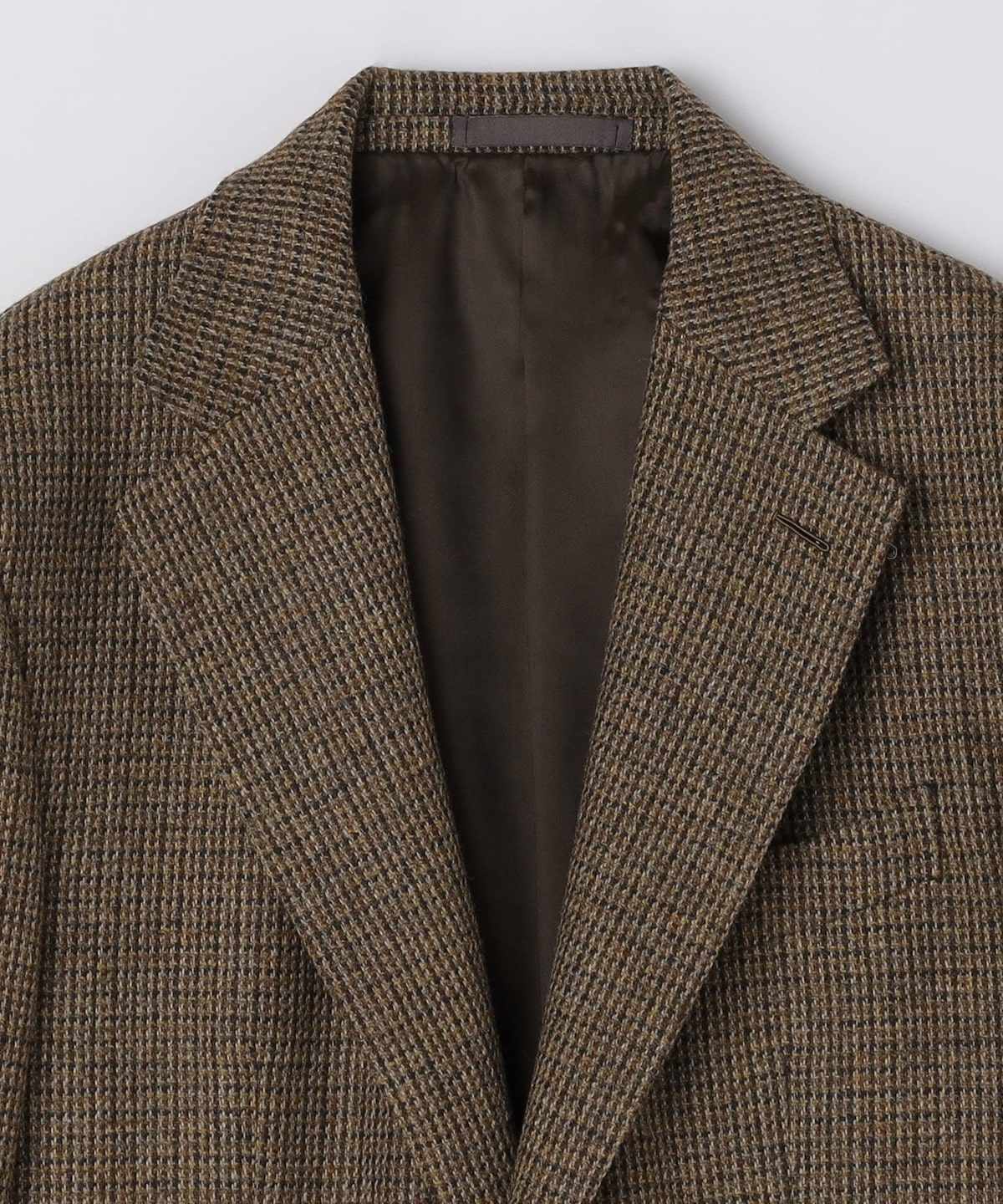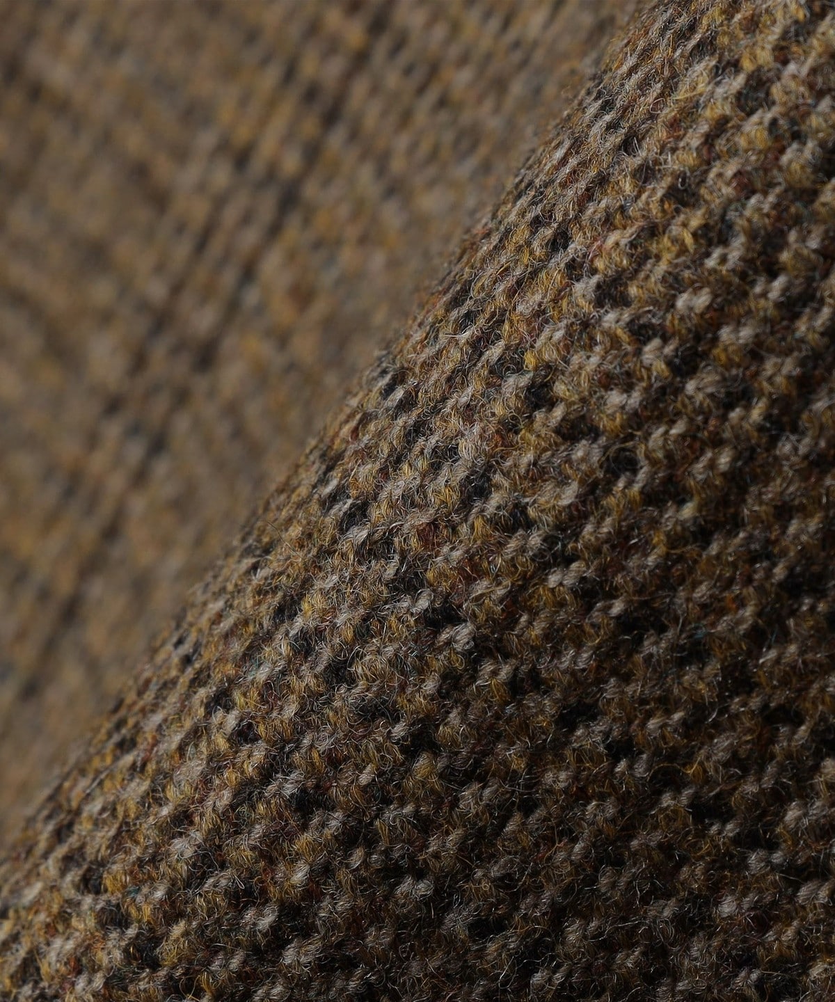 ブラウン系のハウンドトゥース柄の生地は落ち着いた印象ではありますが、複数の色糸が絡み合った奥行きのある表情です。