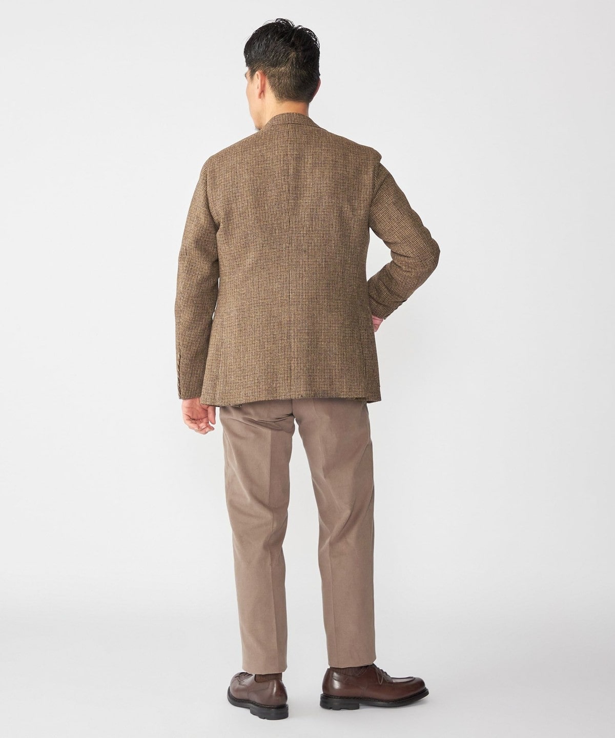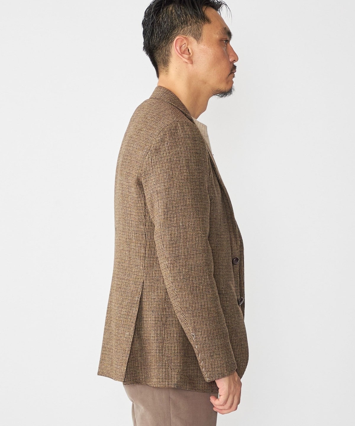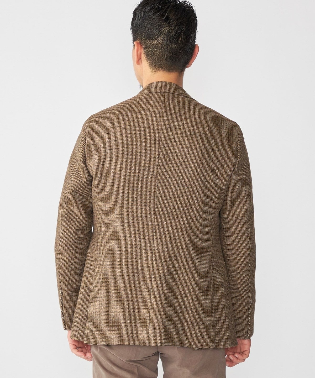 ブラウン系のハウンドトゥース柄の生地は落ち着いた印象ではありますが、複数の色糸が絡み合った奥行きのある表情です。