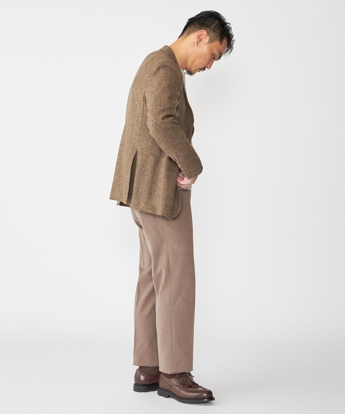 ウールのネクタイやツイードのスラックスを合わせた柔らかなカントリーテイストがおすすめです。