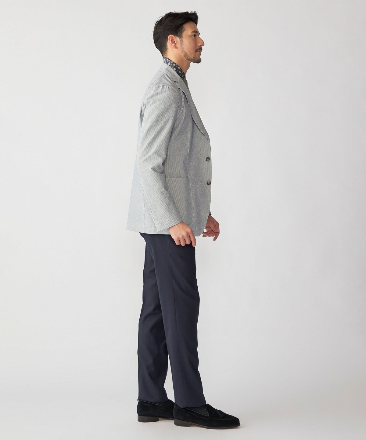 胸ポケットを省いたデザイン、身幅にもややゆとりを与えたカジュアルな印象の一着です。