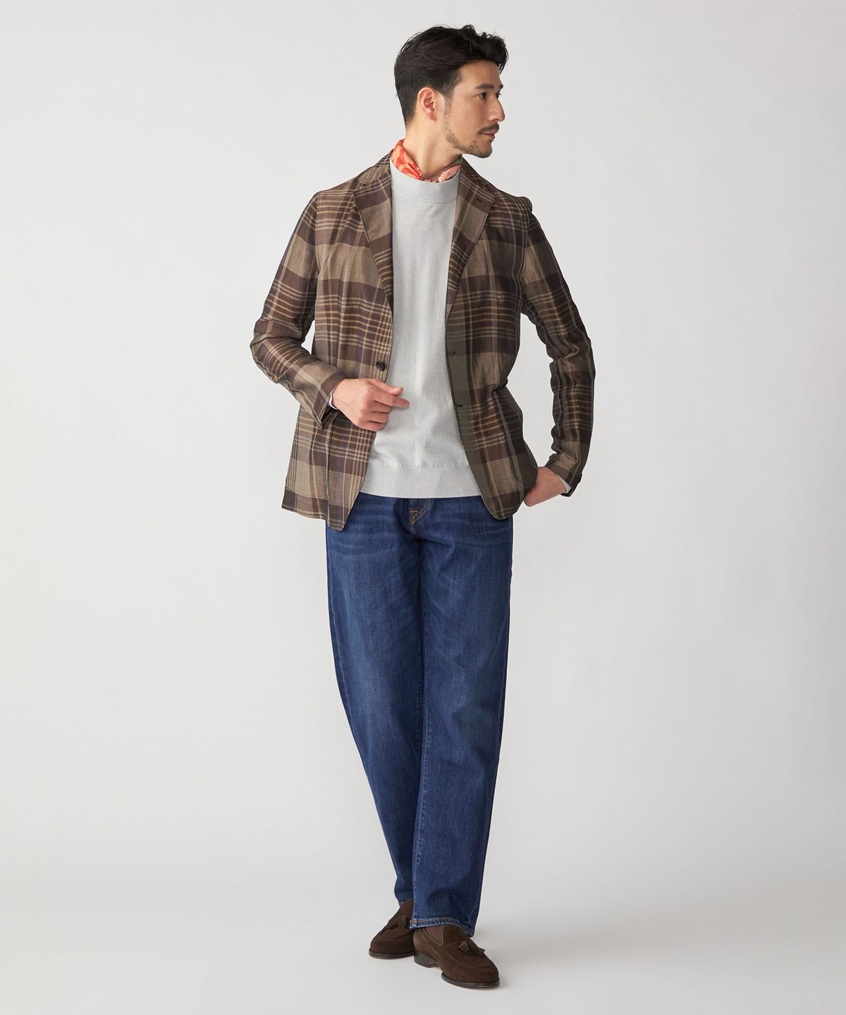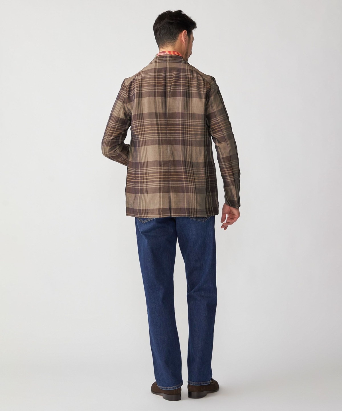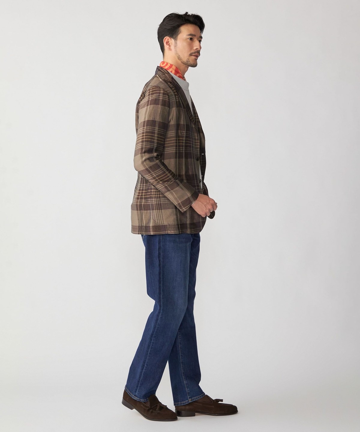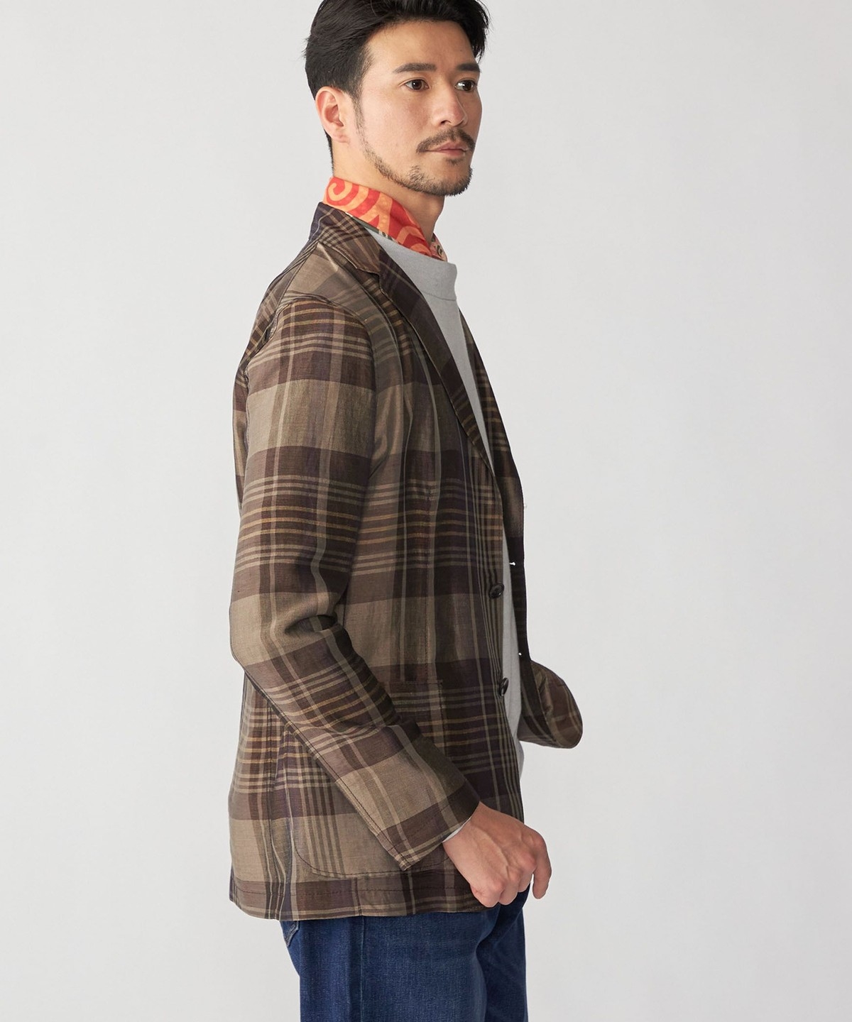 胸ポケットを省いたデザイン、身幅にもややゆとりを与えたカジュアルな印象の一着です。