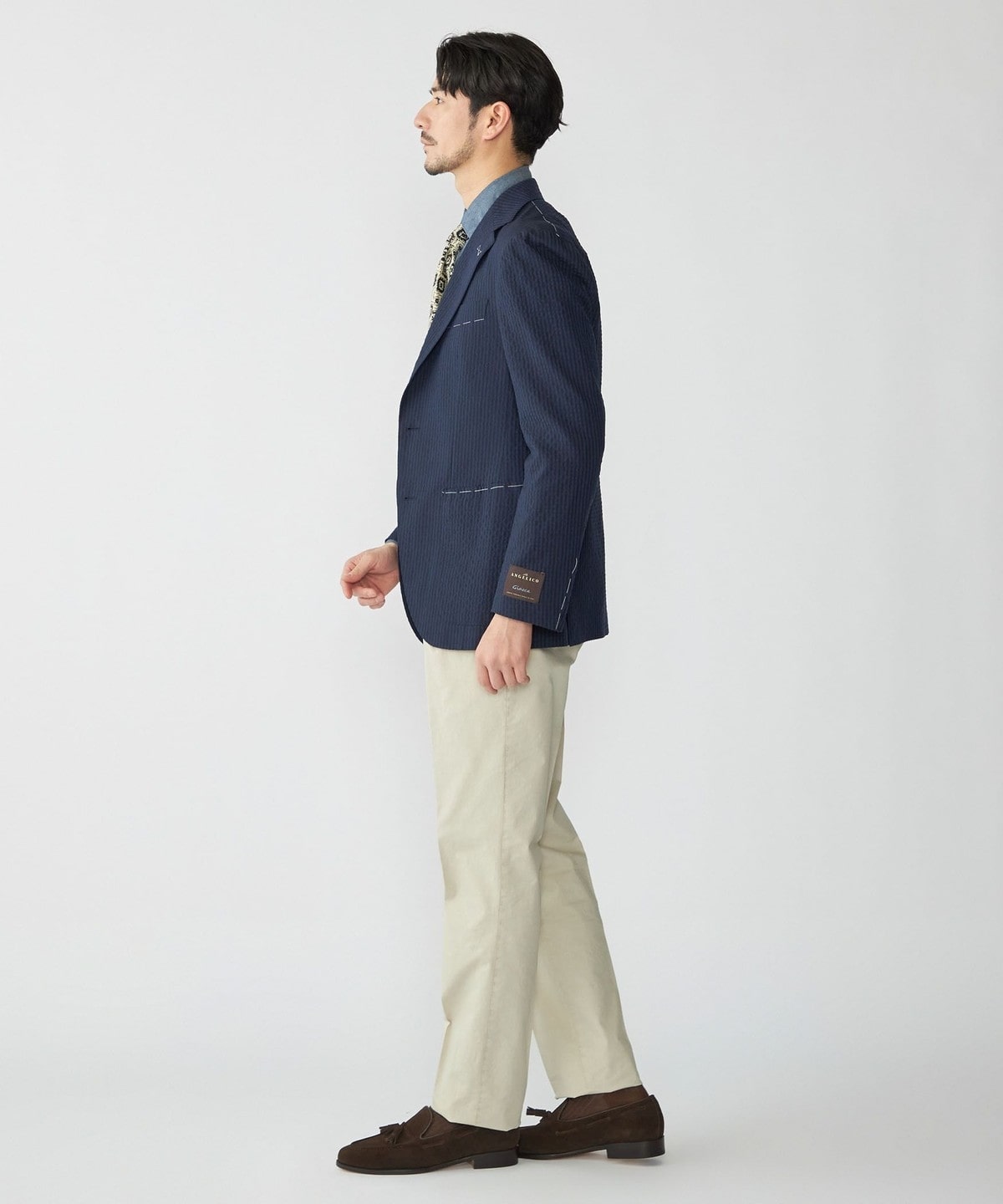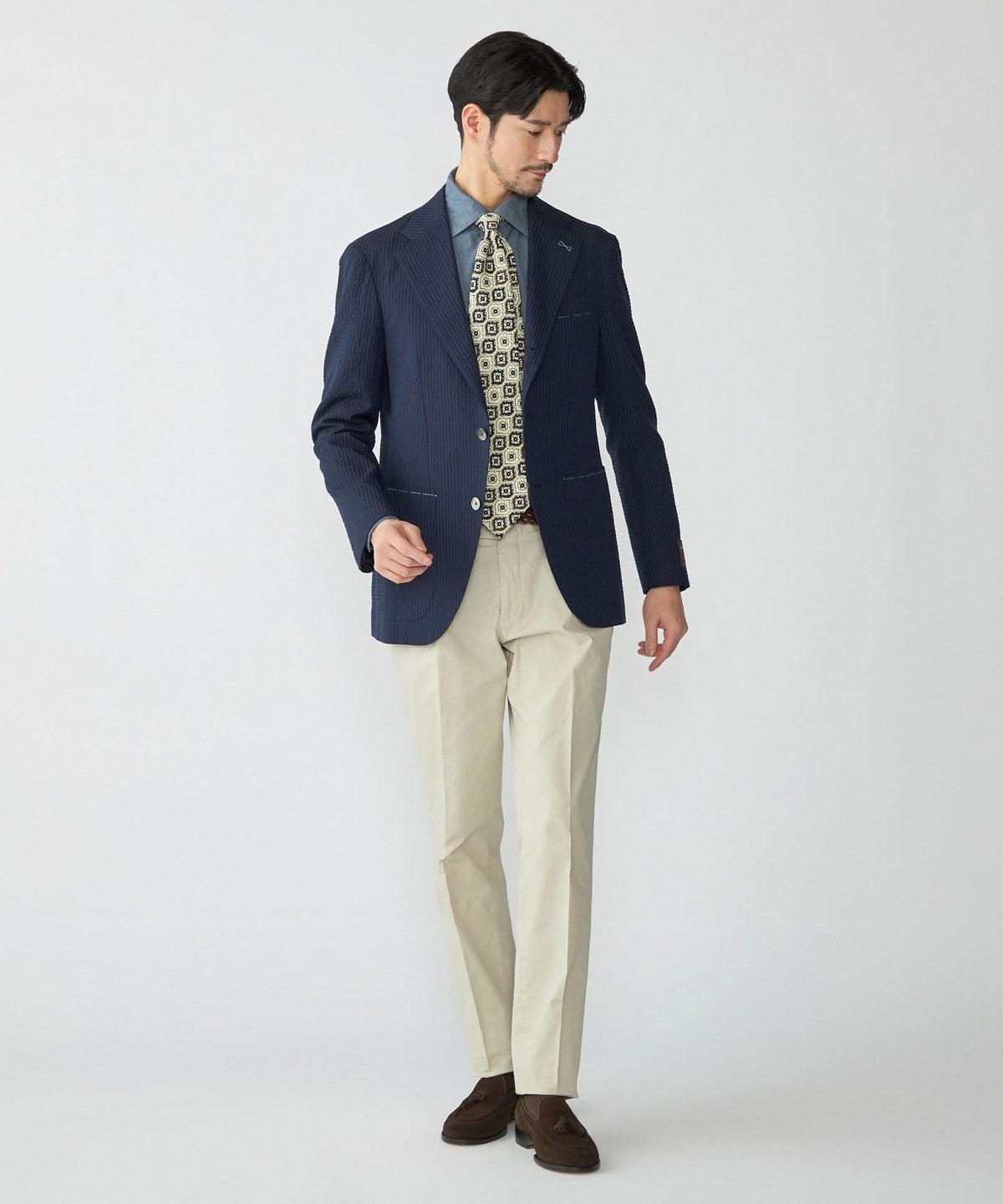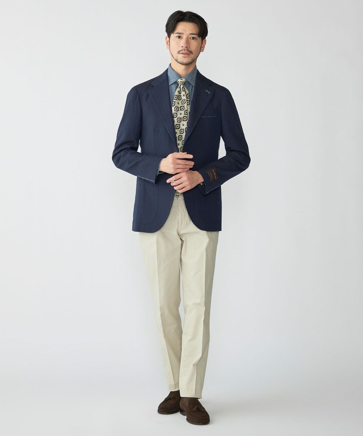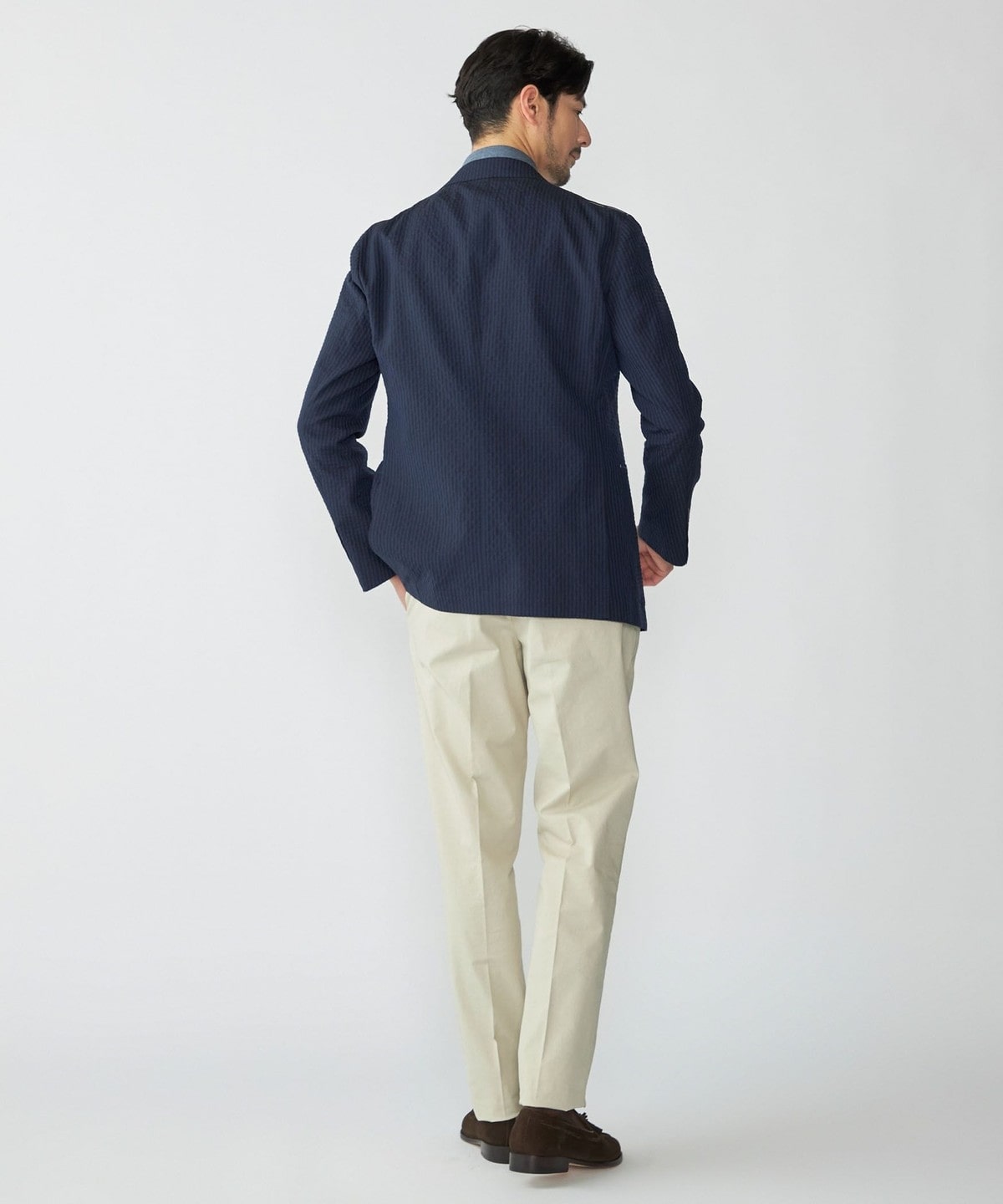 ウールとコットン混紡素材のシアサッカー生地でカジュアル過ぎず、清涼感のある軽快なスタイリングにおすすめです。