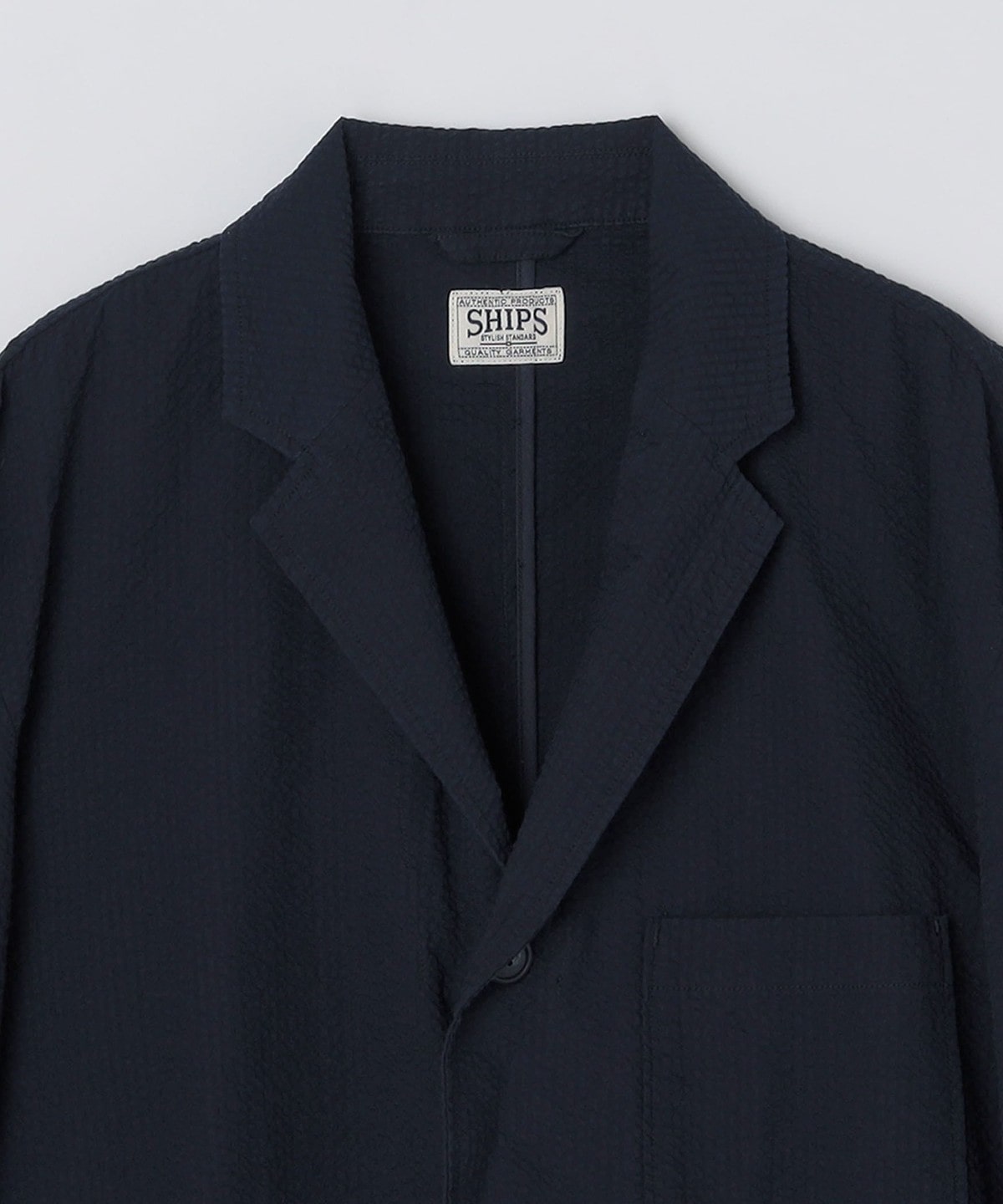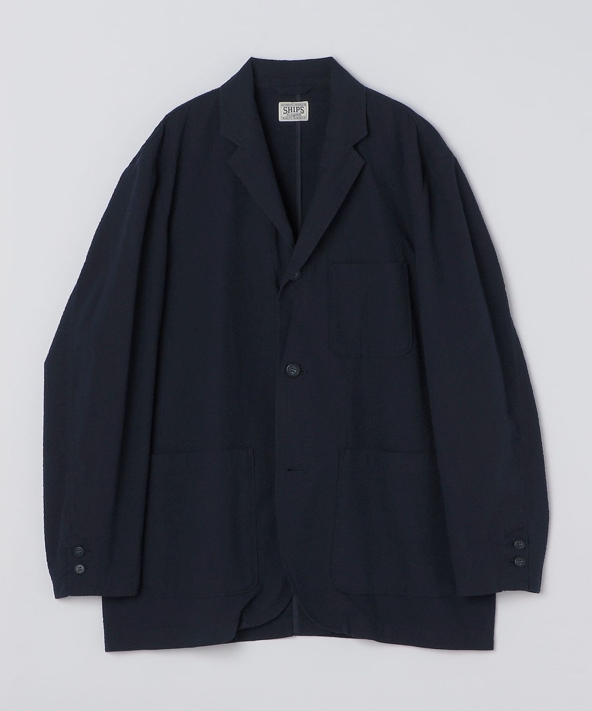 段返り3つボタン、3つのパッチポケットでクラシックな仕様のサッカージャケット。