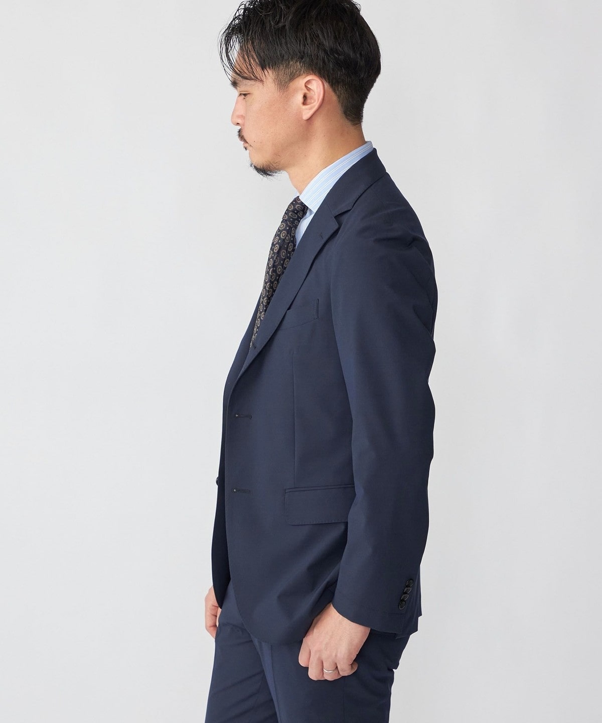 シングルブレステッド、段返り3つボタン、アンコン仕様、フラップポケット、サイドベンツ