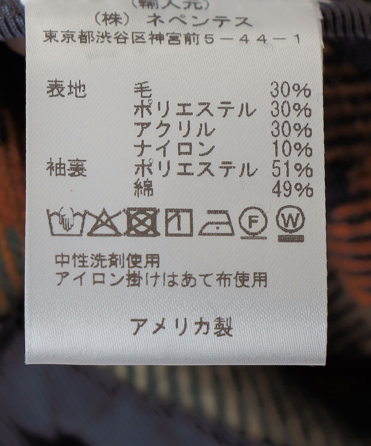 素材:表地: 毛30%, ポリエステル30%, アクリル30%, ナイロン10%, 袖裏: ポリエステル51%, 綿49%