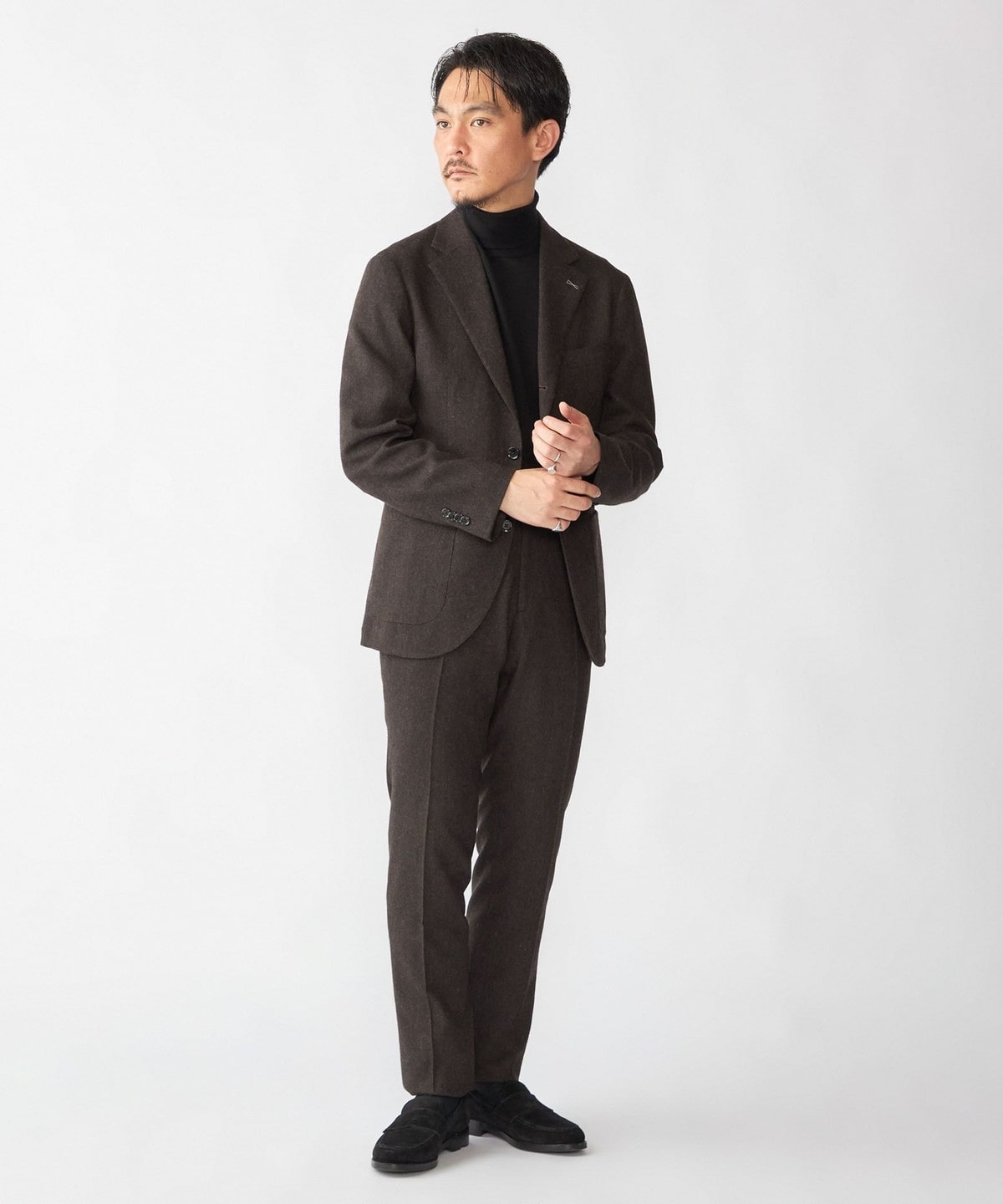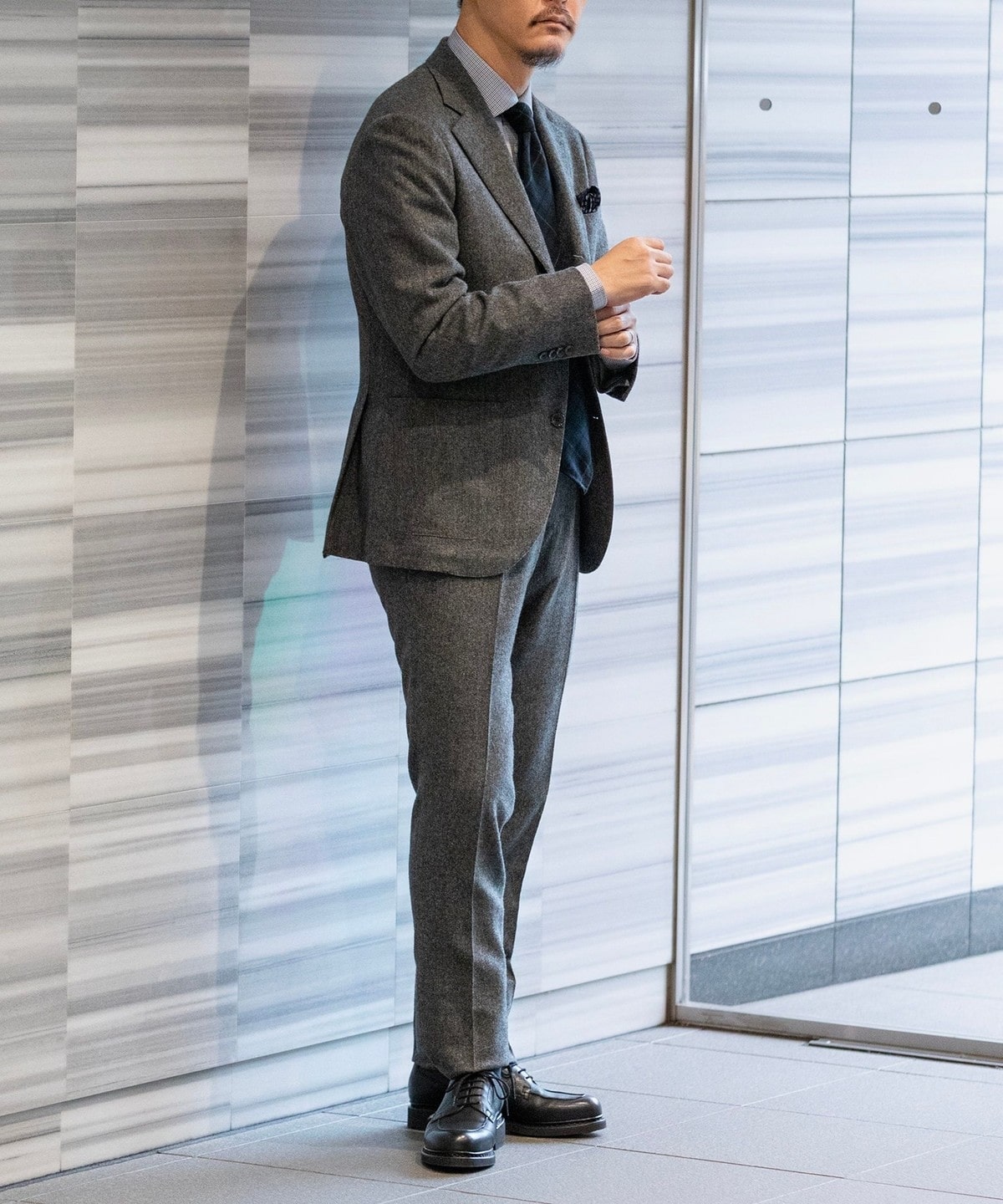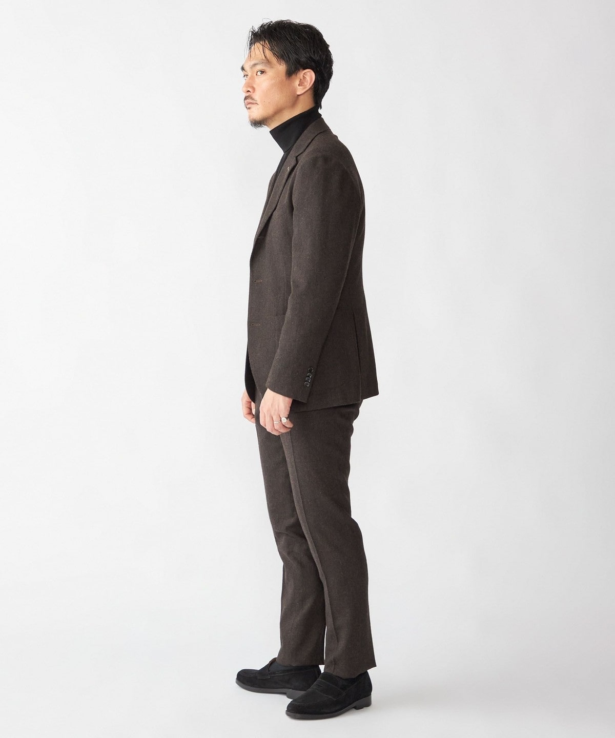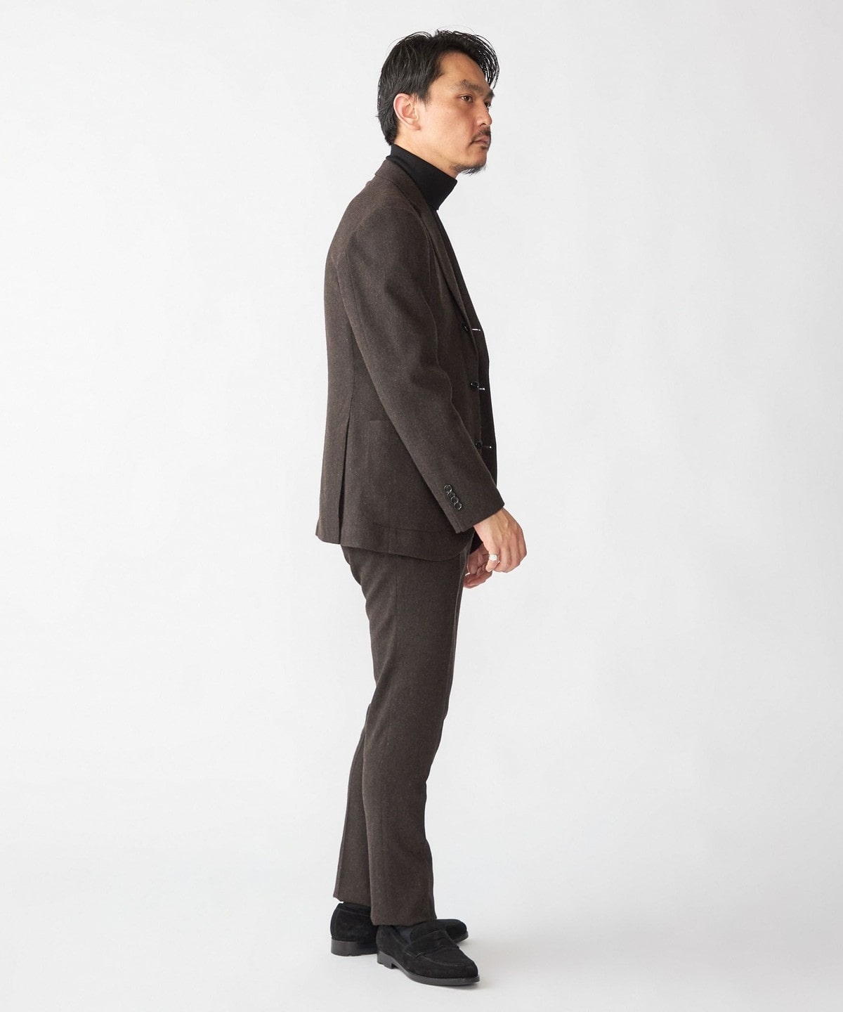 温かみのあるメランジ感が特徴のホームスパン、ソフトな風合いと快適なストレッチ性がポイントです。