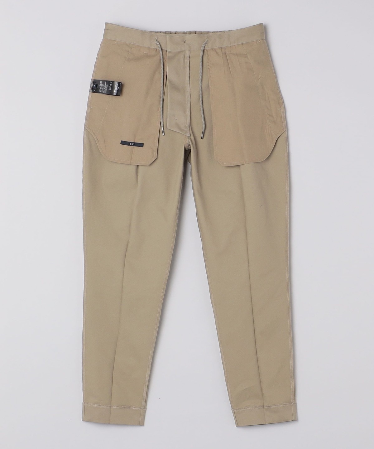 パンツはウエスト部分を後身頃のみゴム仕様にして、ウエストはドローストリング(紐)で調整が可能なため、ラクチンな穿き心地に。