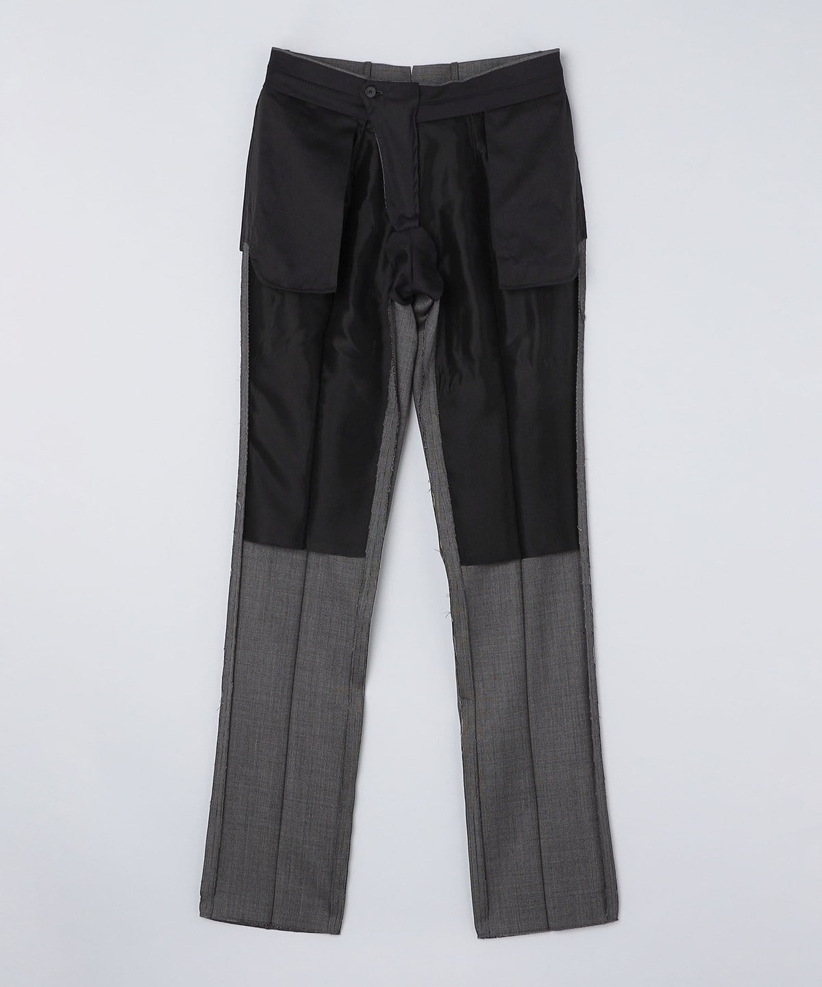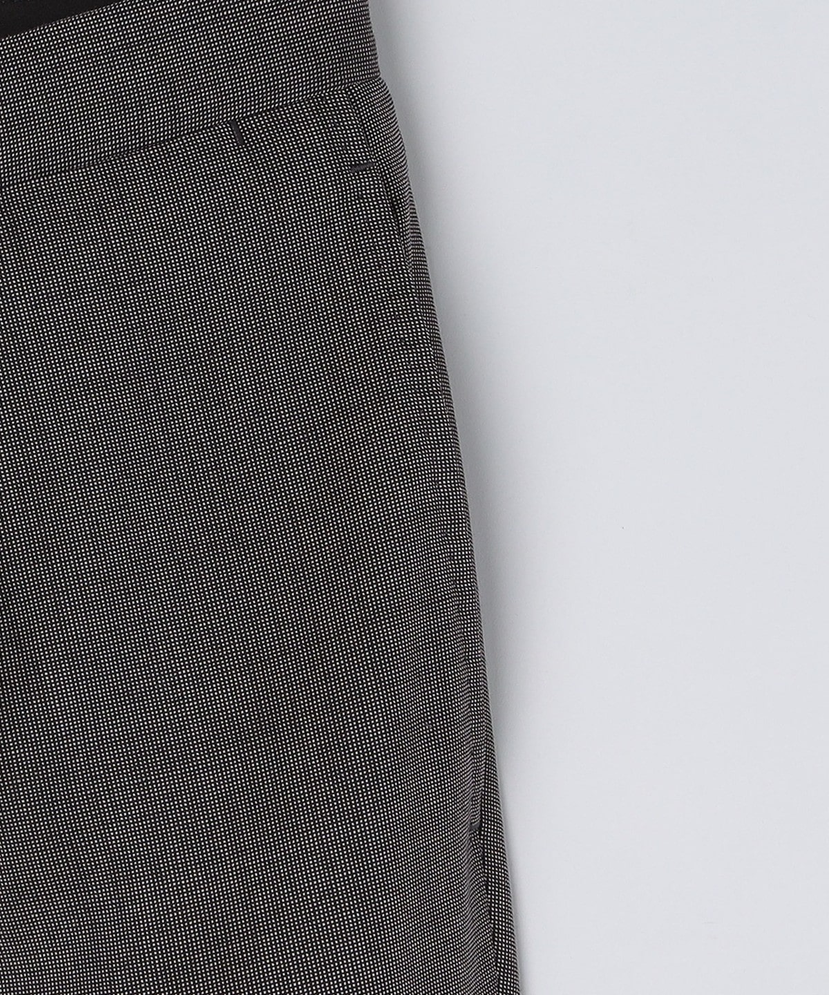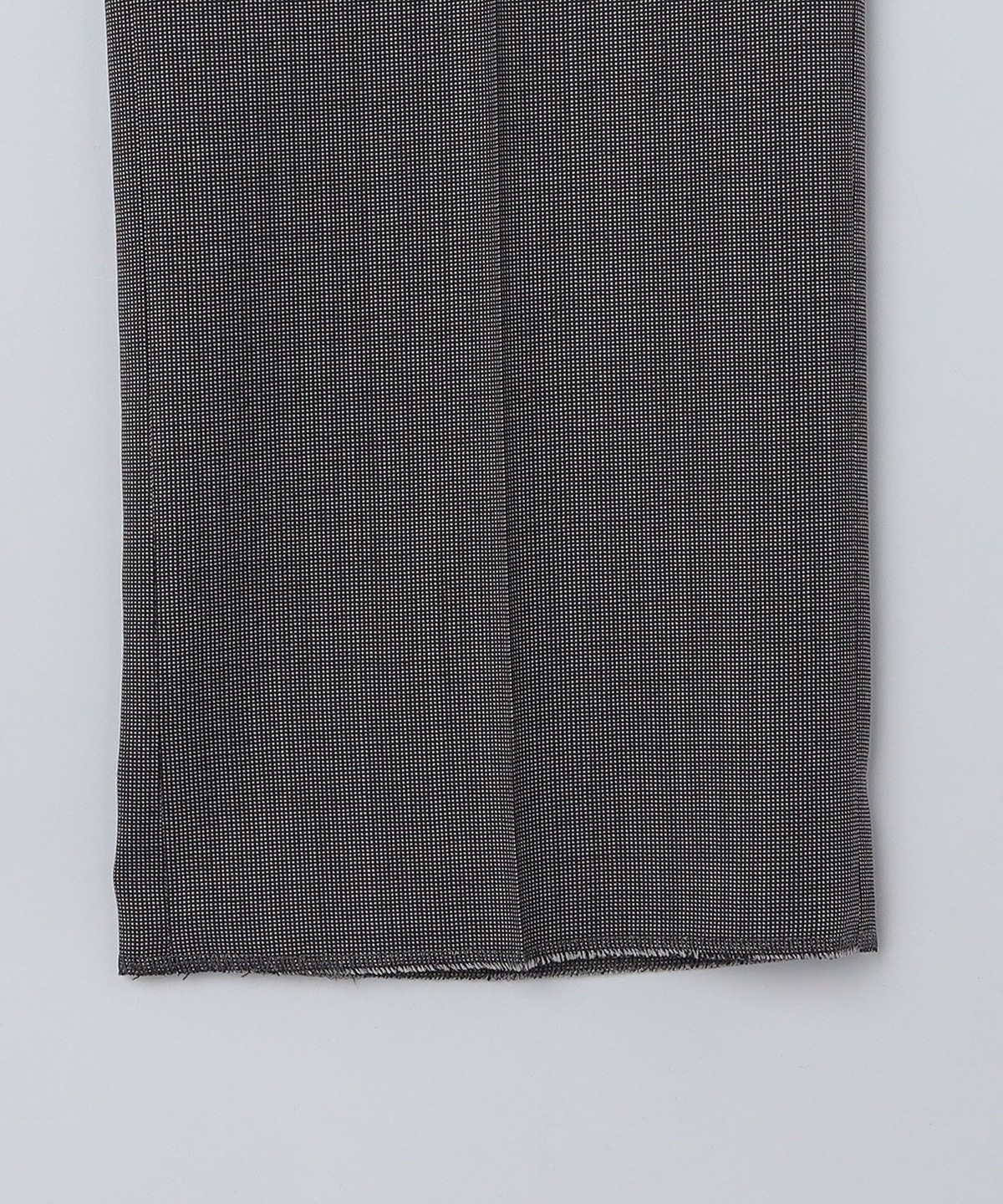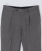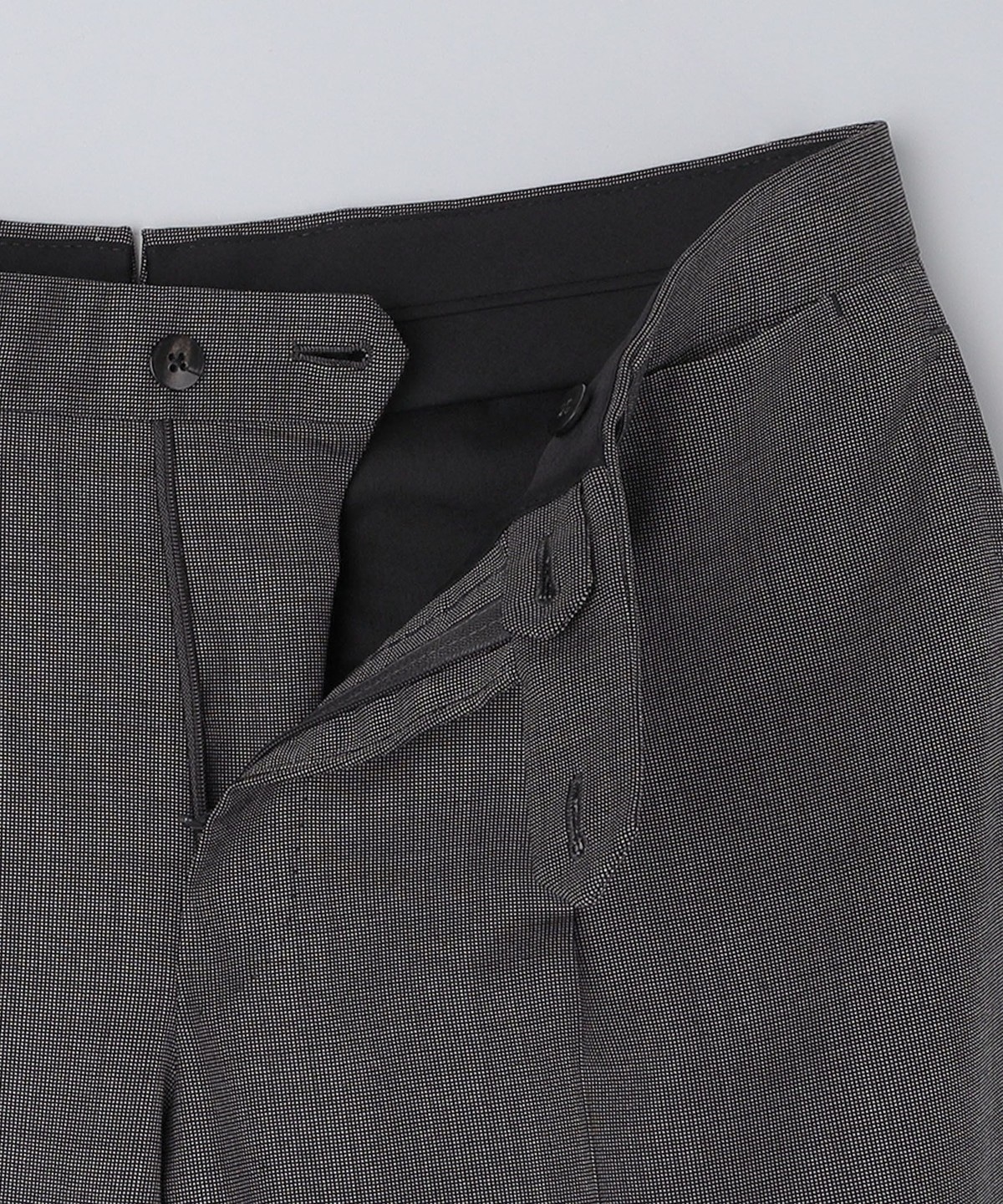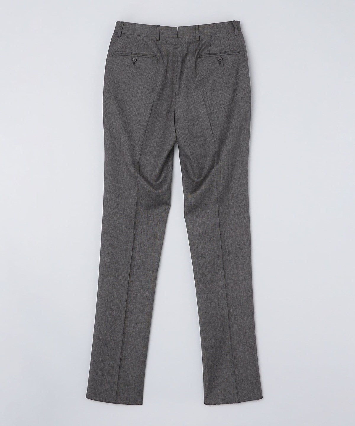 スラックスは1プリーツ、テーパードシルエット、ベルトループ。