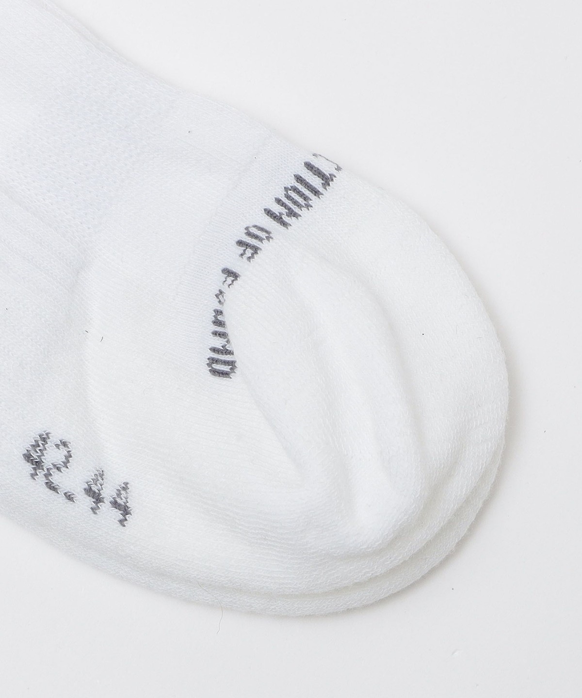 つま先・足裏・かかと・くるぶし部分の裏側はパイル地で肉厚に仕上げ、足首の湾曲部分は薄く仕上げ、すね、ふくらはぎ、甲など部位により編み方を変えることで保護性、強度性、ホールド感などを考慮した秀逸なソックスです。