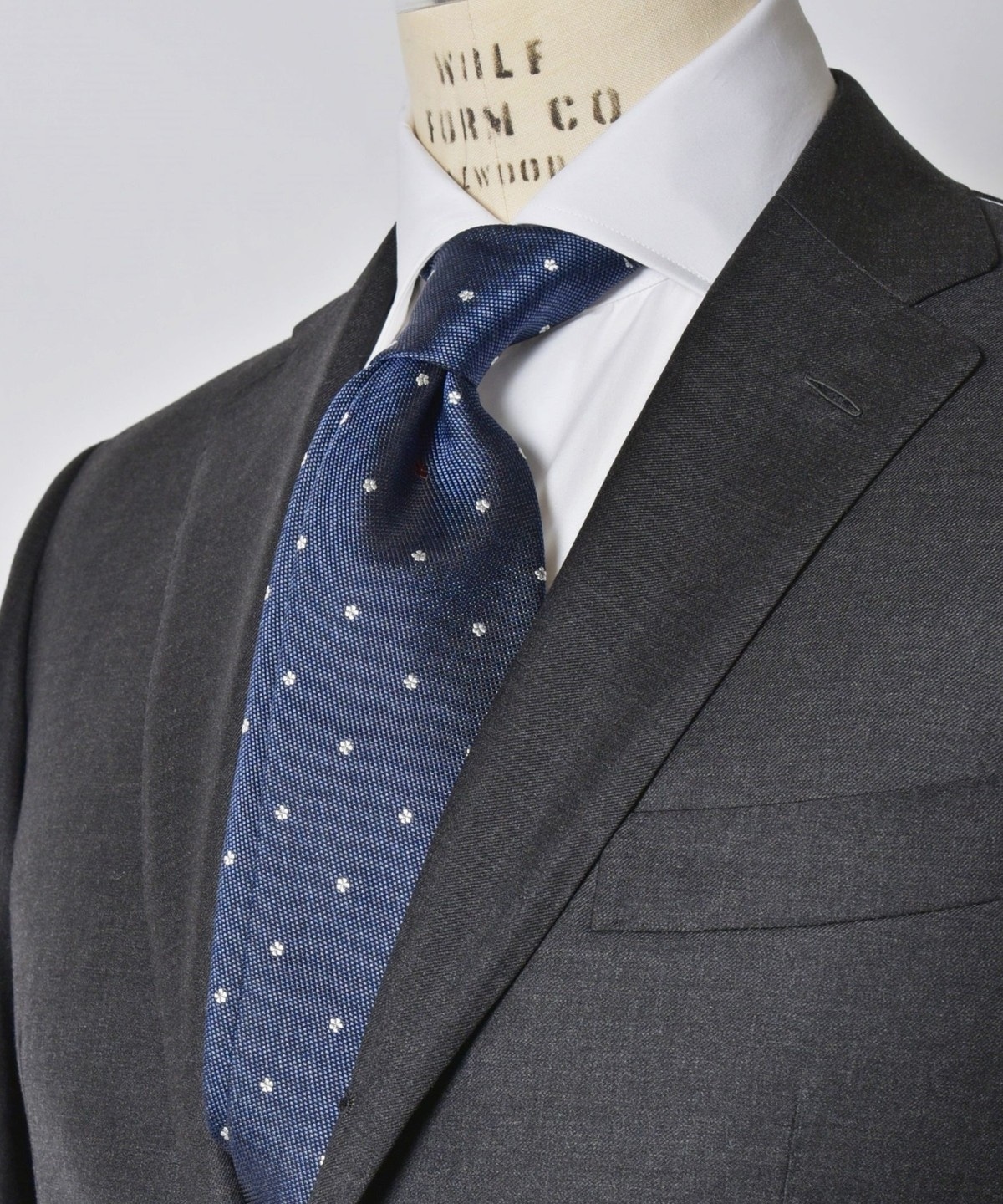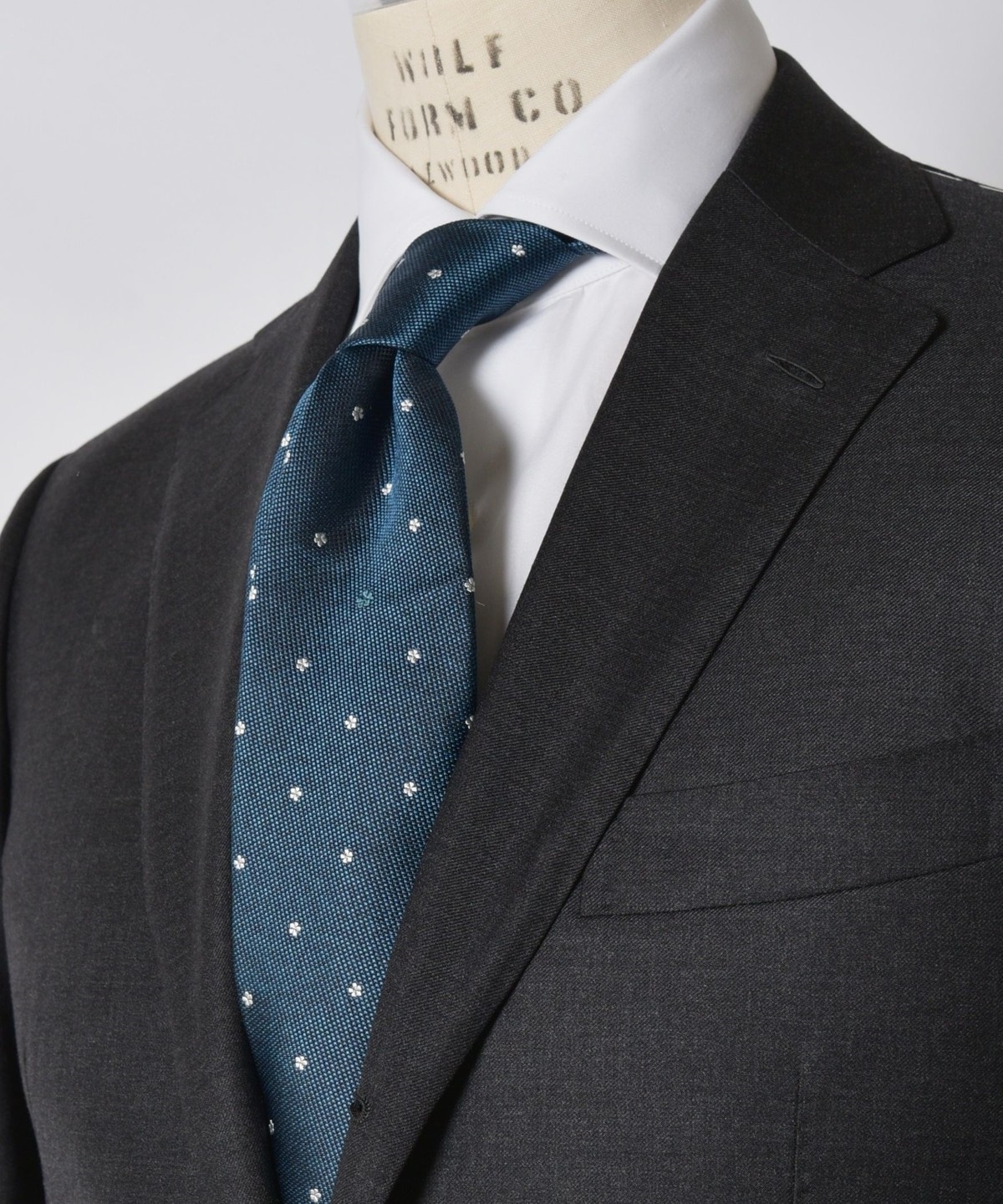 サックスブルーのオックスフォードシャツに合わせたビジネススタイル、ホワイトのブロードシャツに合わせたオケージョンスタイルなど幅広くお使いいただける万能なネクタイとなっております。