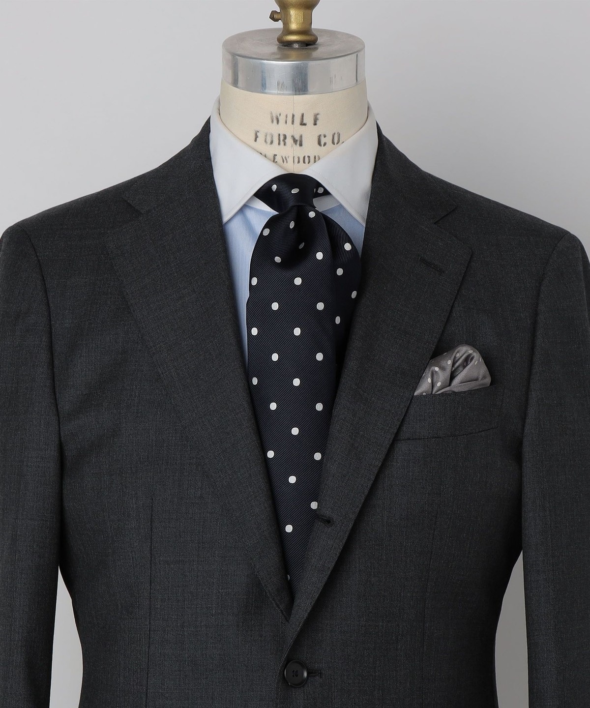 少し大きめのドット柄ですので堅い印象も無く、無地やストライプ柄のスーツやシャツなどとの相性も良く使いやすいネクタイです。