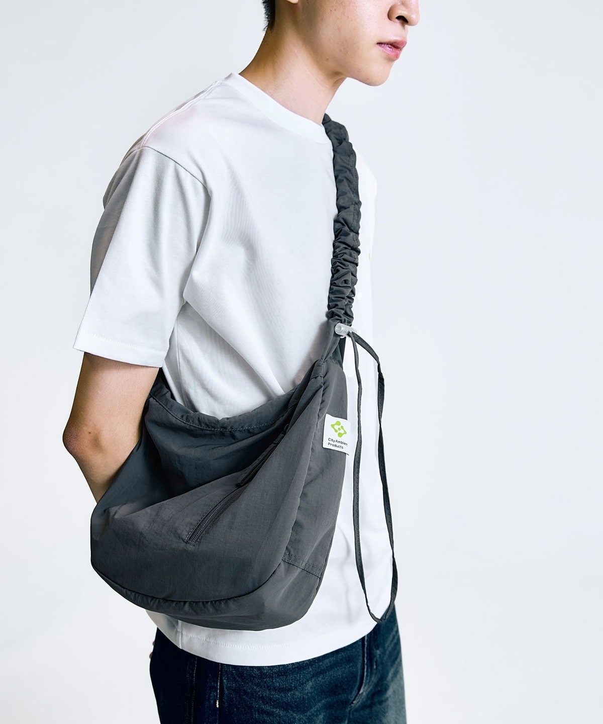 コードを絞ったときに生まれるギャザー、あえて側面に配置したCity Ambient Productsのブランドロゴ等、シンプルながらデザイン性のあるバッグになっております。