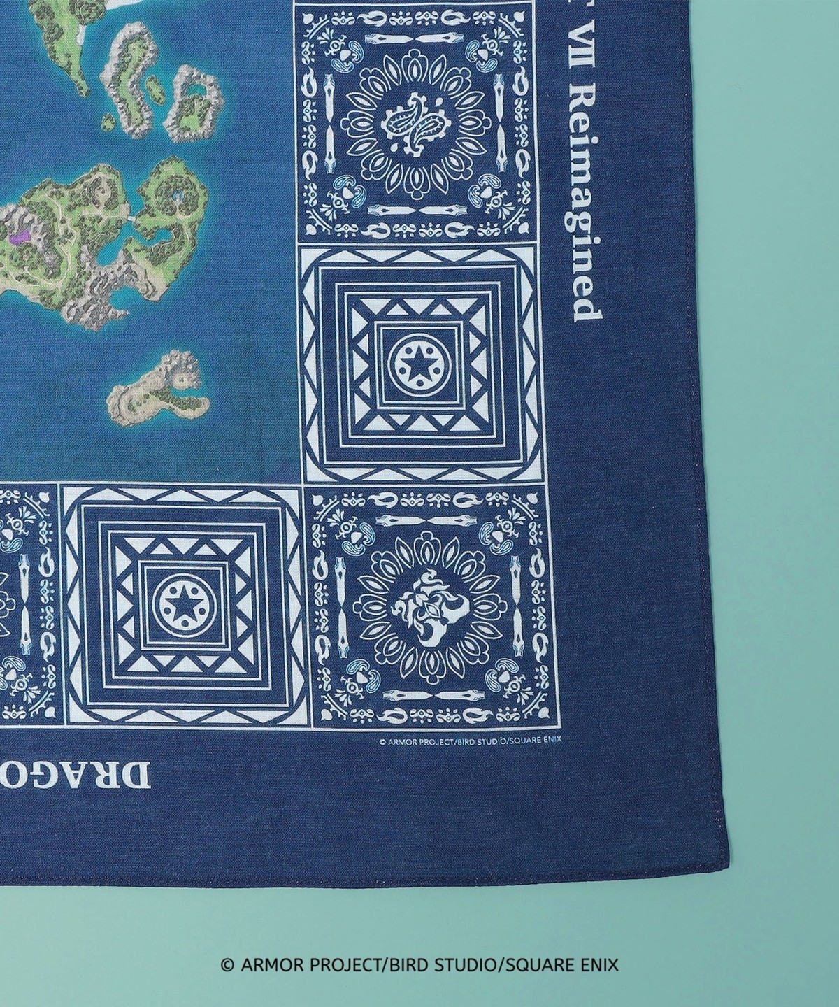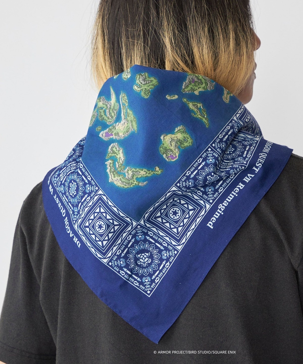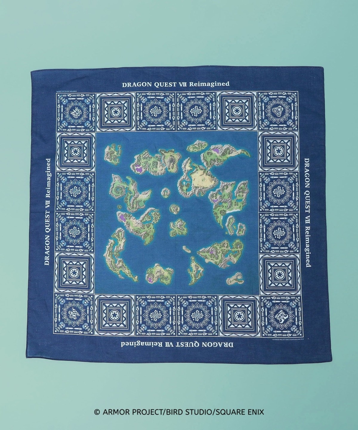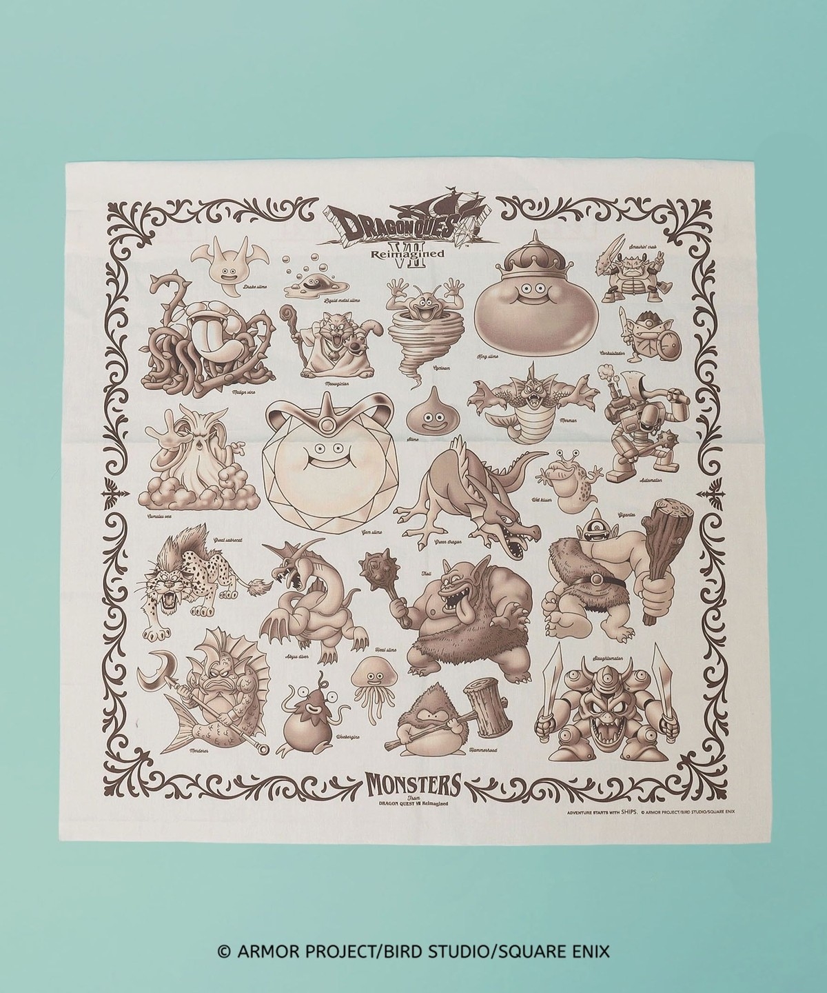 ヴィンテージバンダナを着想源にした図柄には、遊び心あふれる仕掛けが満載。60sムード漂うドット柄に散りばめられたスライムの中には、ひっそり“はぐれメタル”が1体隠れていたり、『ドラゴンクエストZ Reimagined』のワールドマップを中心に、作品ゆかりのアイコンを随所に配したアートワーク、さらにクラシックな図鑑バンダナの文法で描いた“モンスター図鑑”デザインもラインナップ。それぞれのバンダナに、DQ7Rの世界観が豊かに広がります。