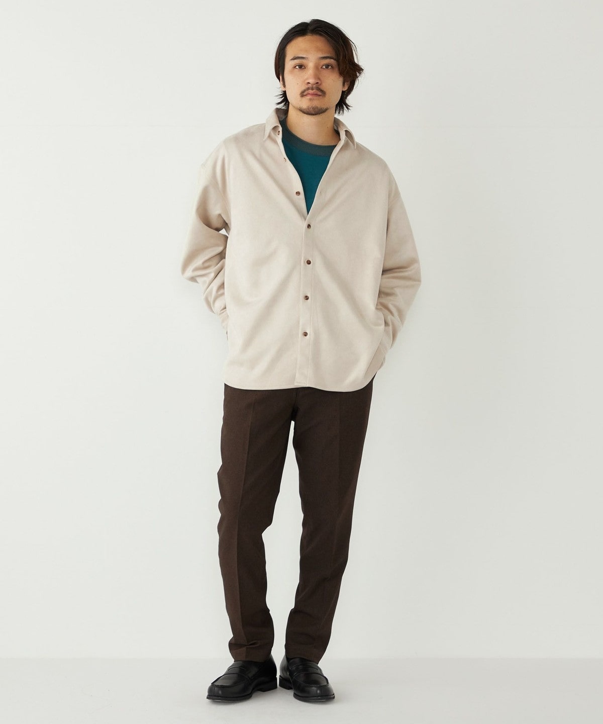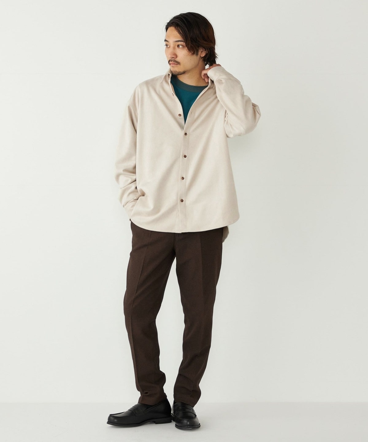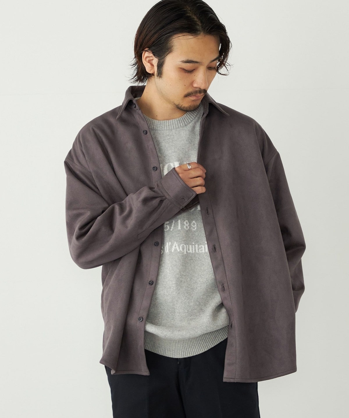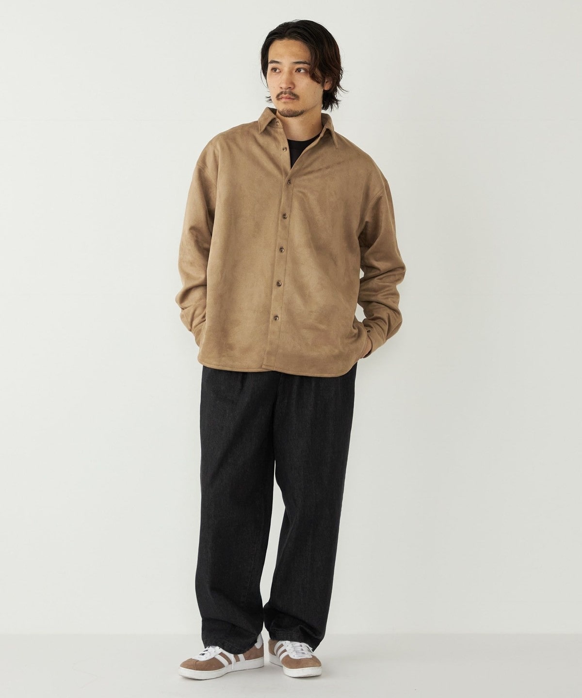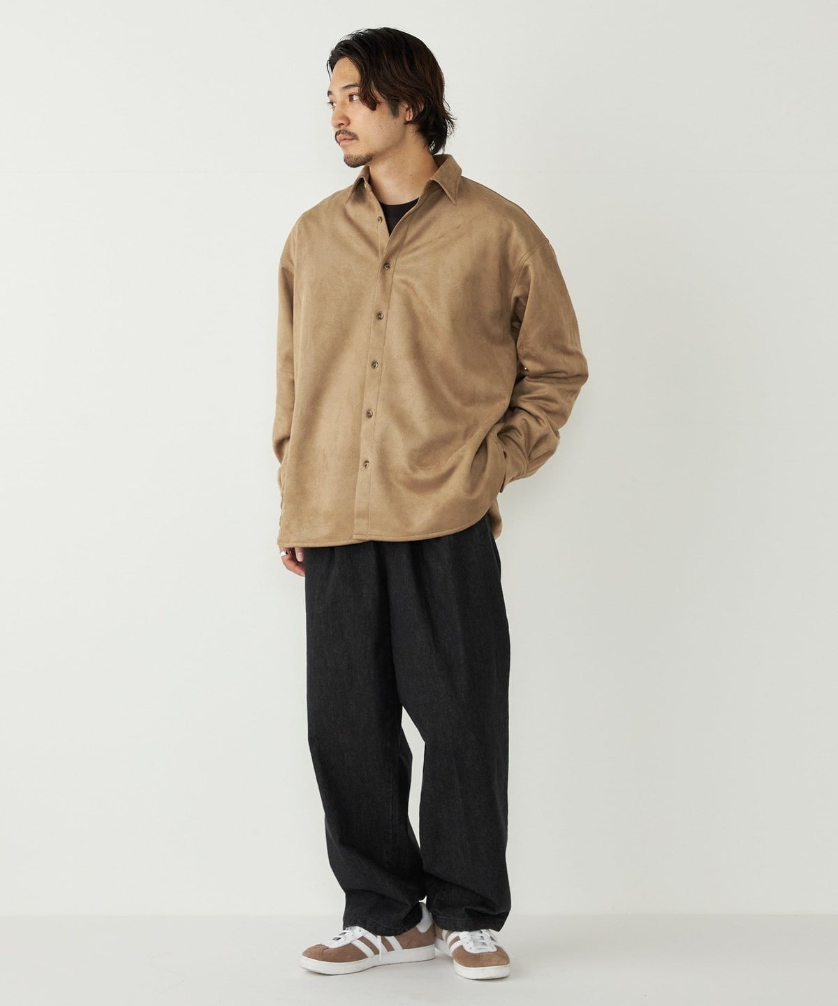 スエード調の生地感と、適度なルーズシルエットで、羽織るだけでコーディネートをこなれた雰囲気に仕上げてくれる1枚。