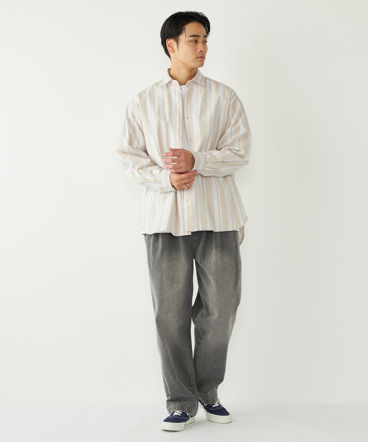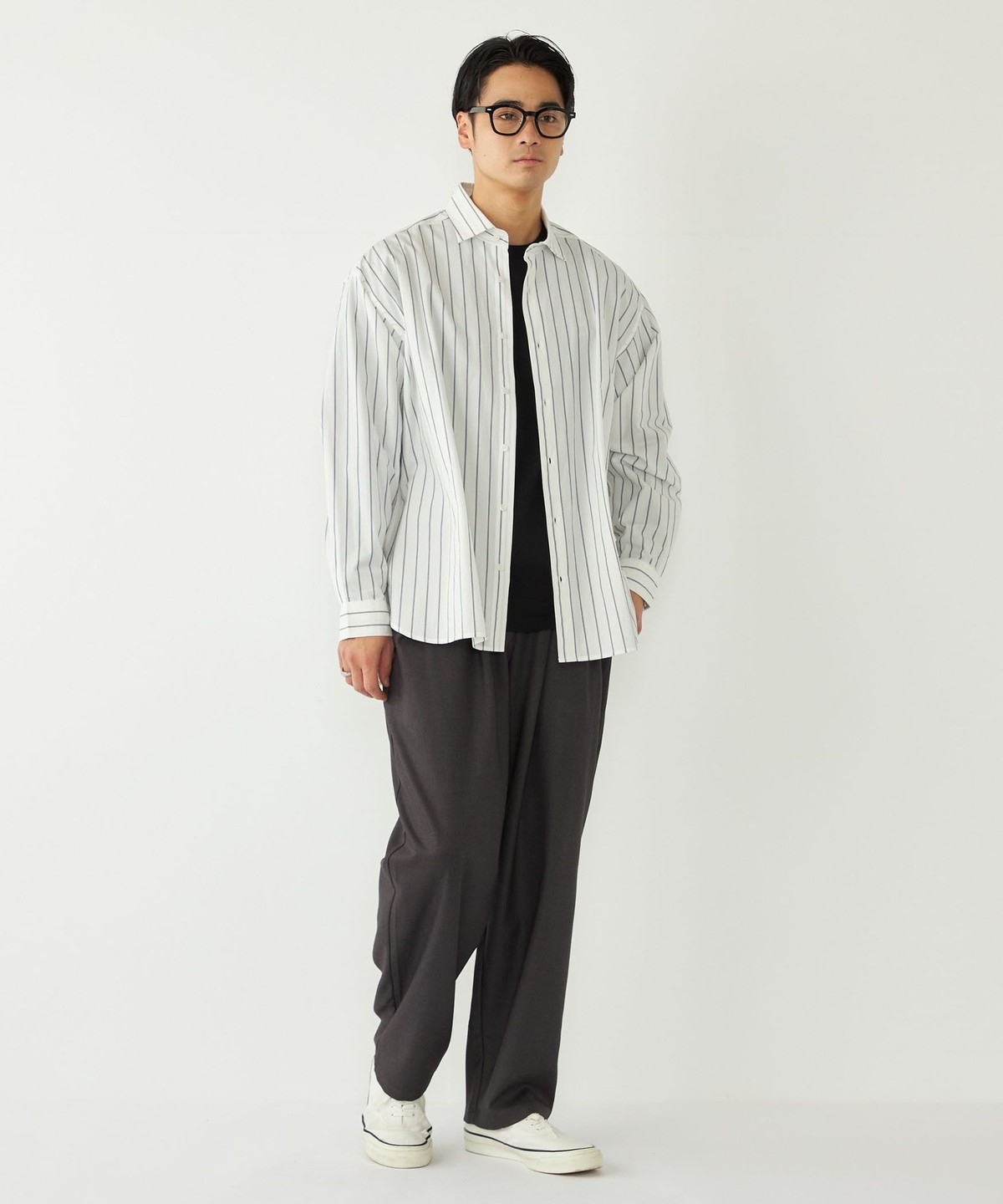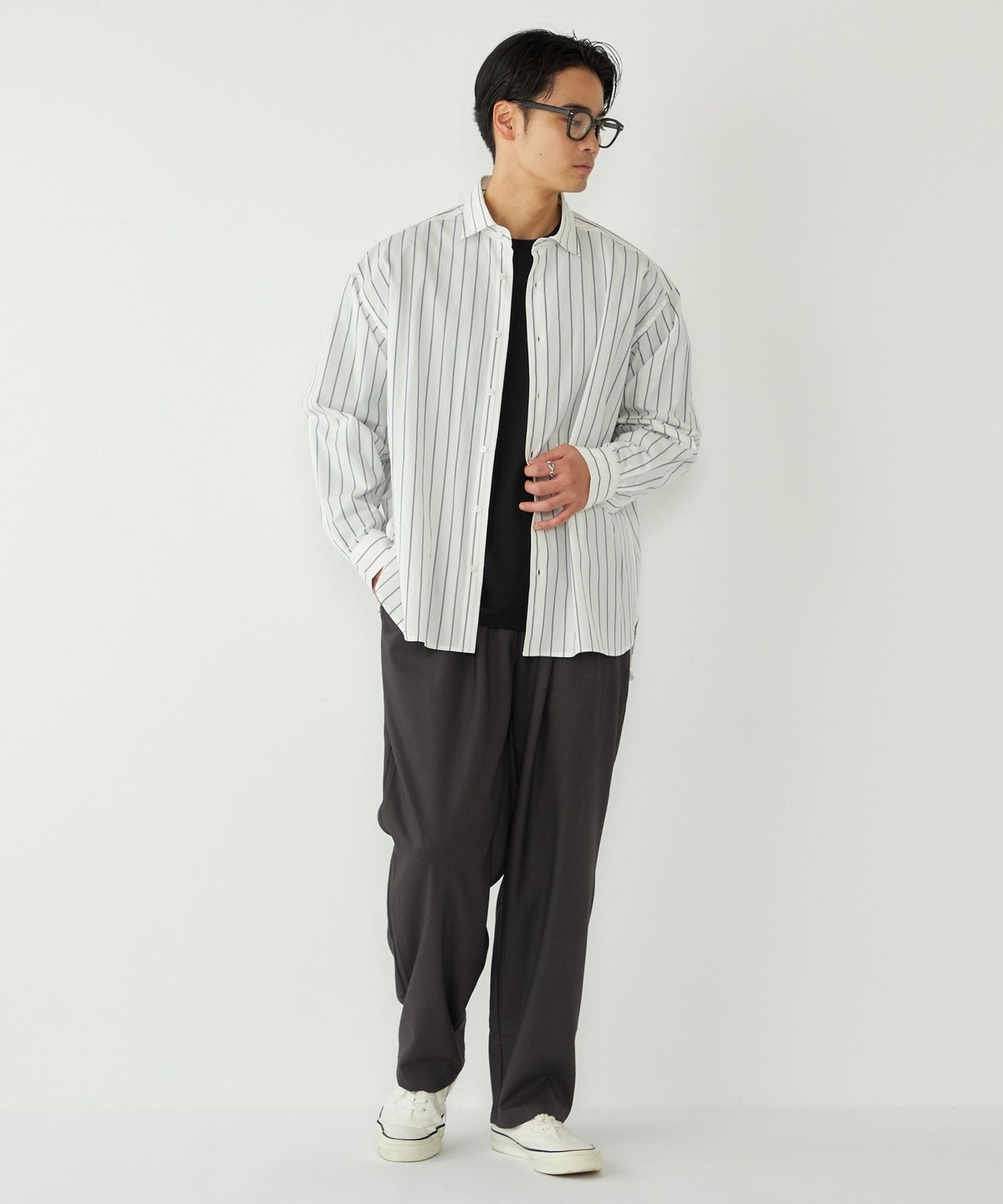 ゆとりのあるボトムスと合わせたリラックス感のあるコーディネートも、だらしなくならずに仕上げてくれます。
