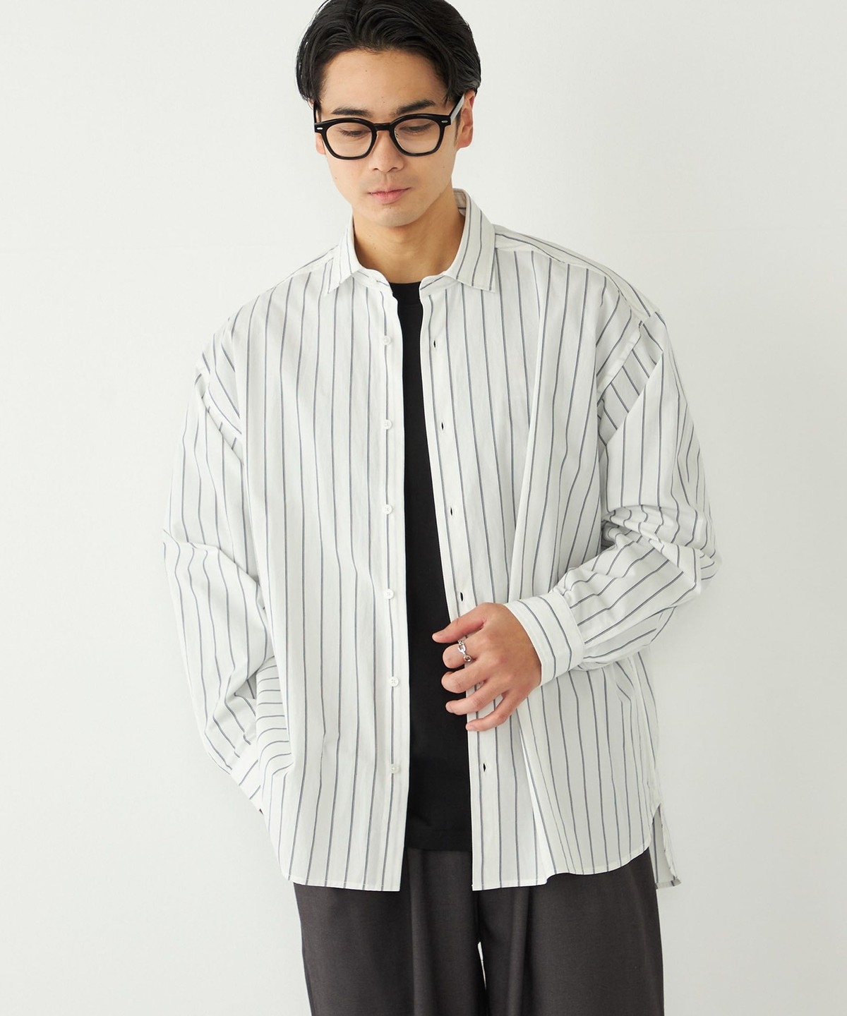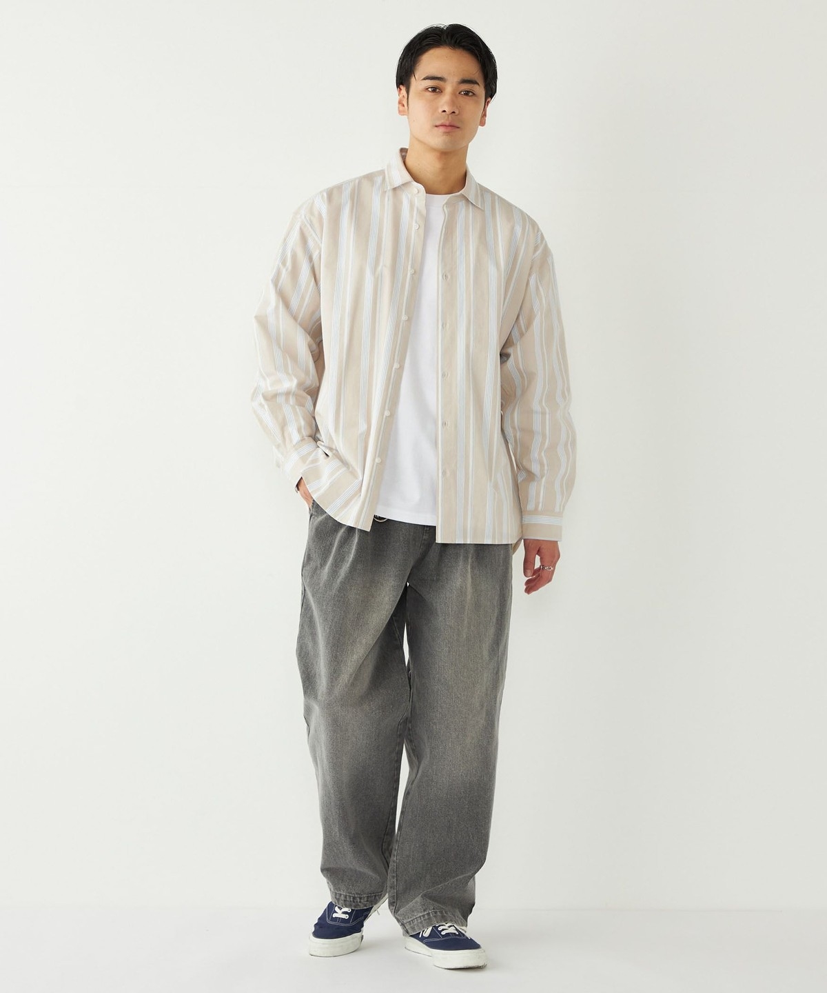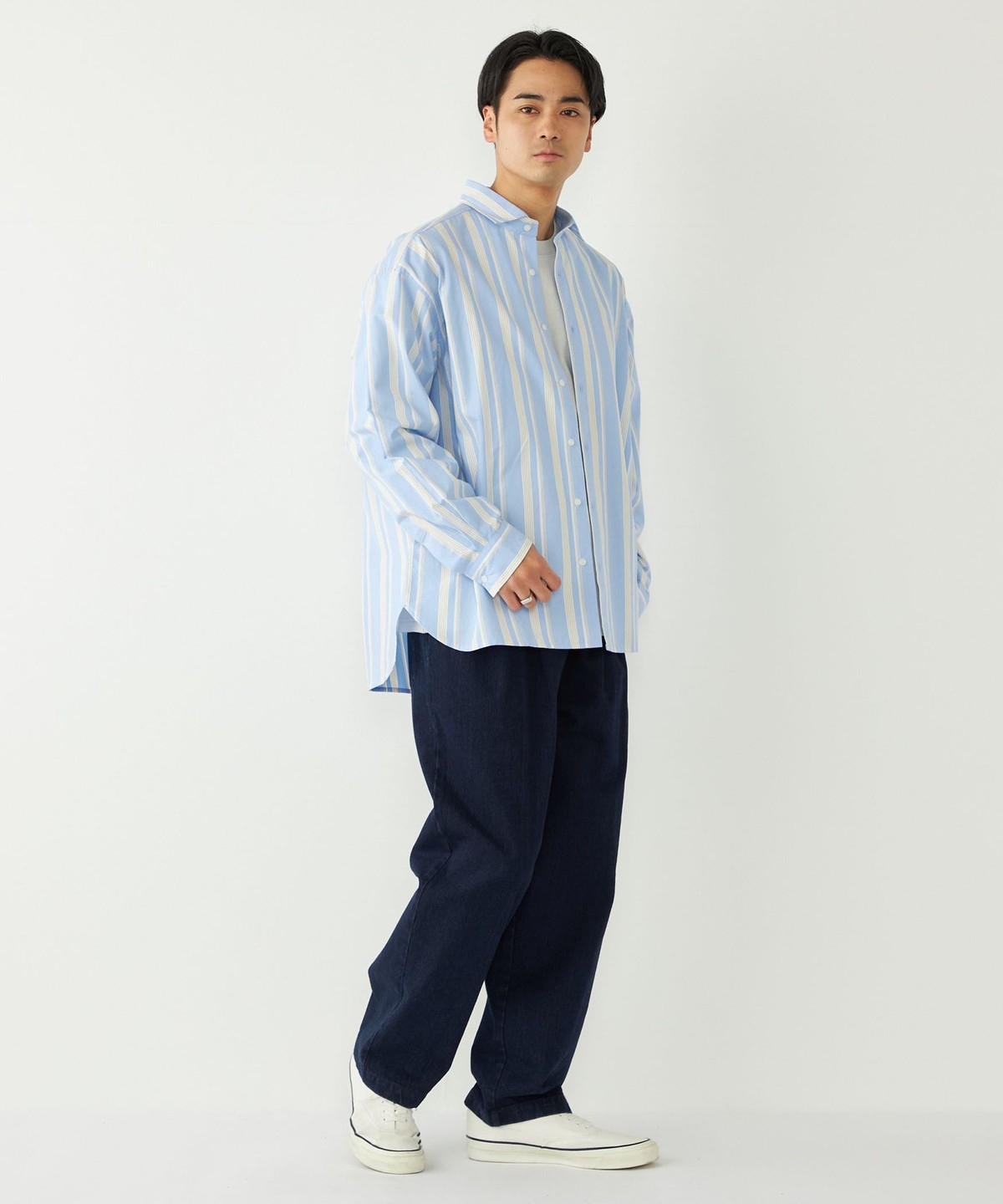 ゆとりのあるボトムスと合わせたリラックス感のあるコーディネートも、だらしなくならずに仕上げてくれます。