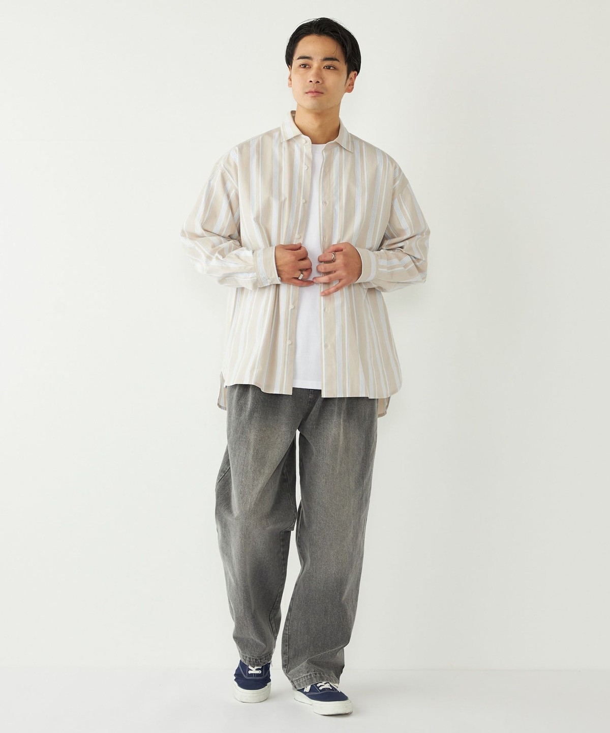 フロントボタンを閉めたクリーンなスタイリングもおすすめです。