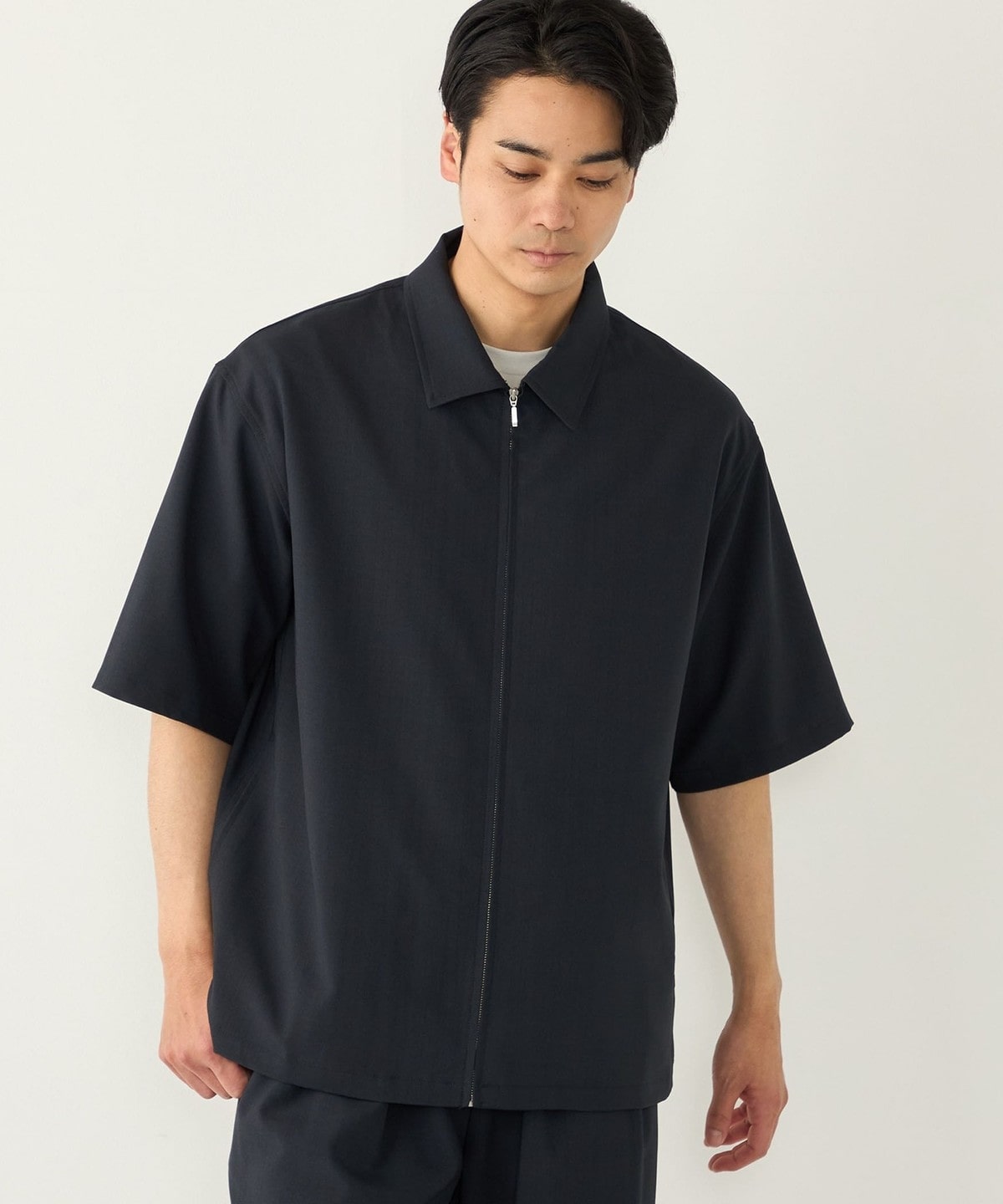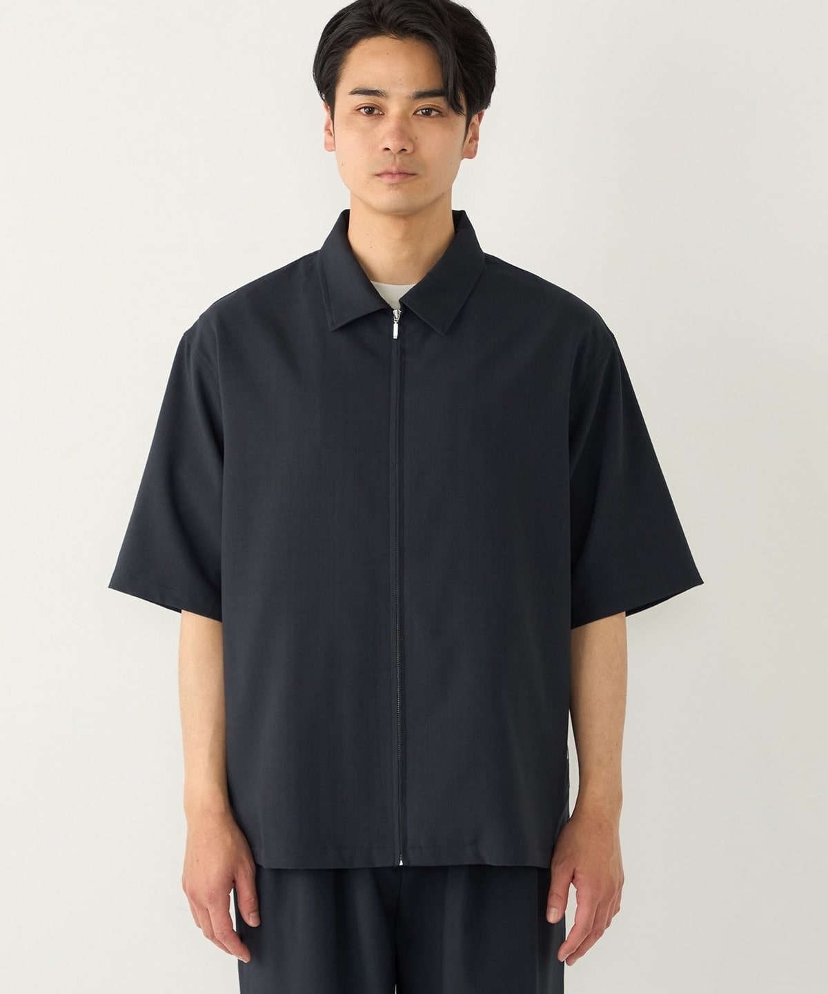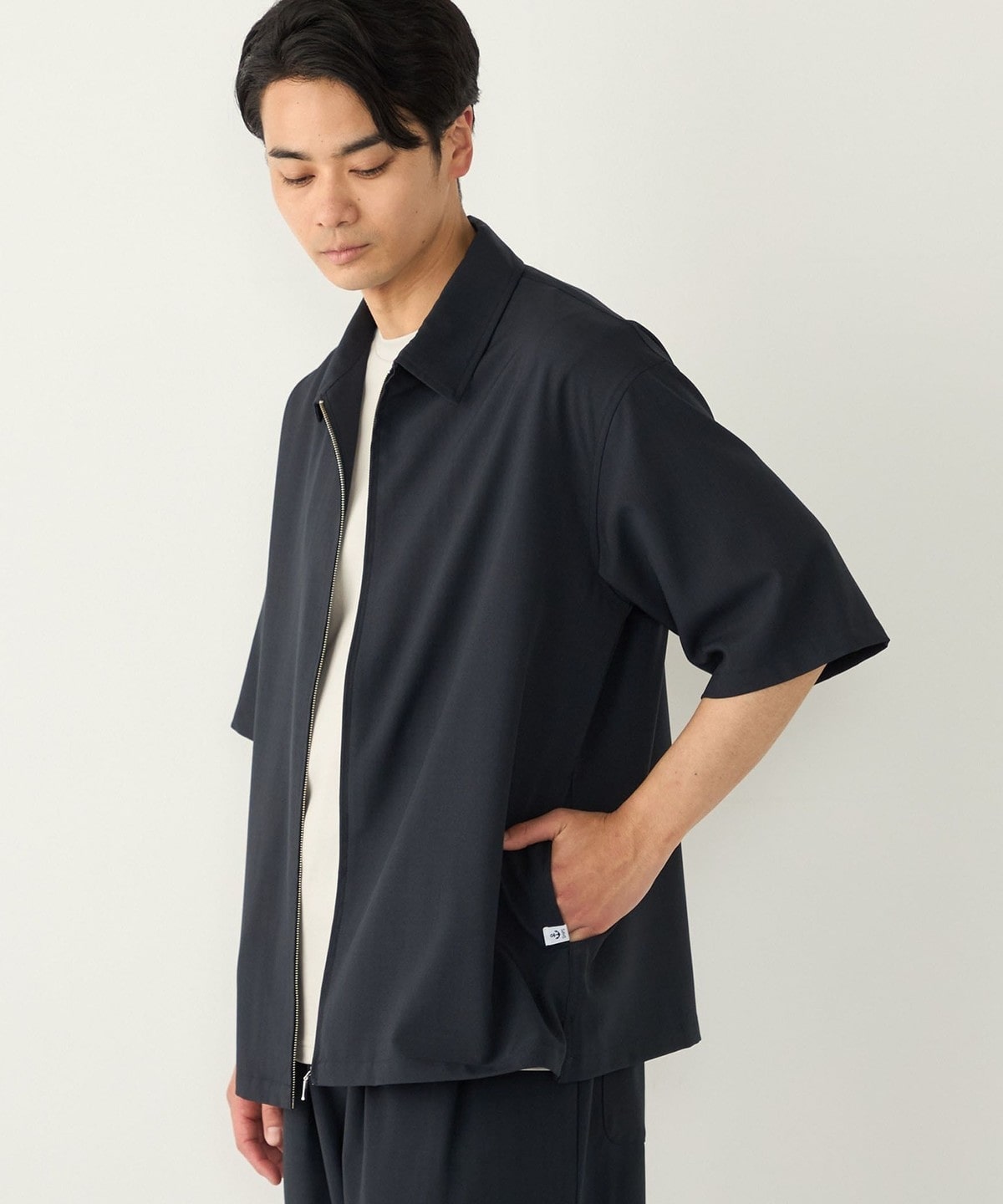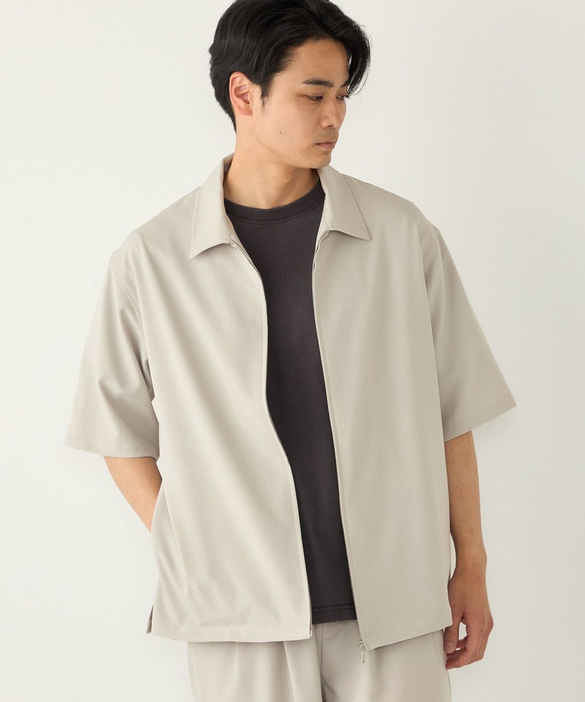 イージーケア性も魅力の合繊素材を使用したジップアップシャツ。