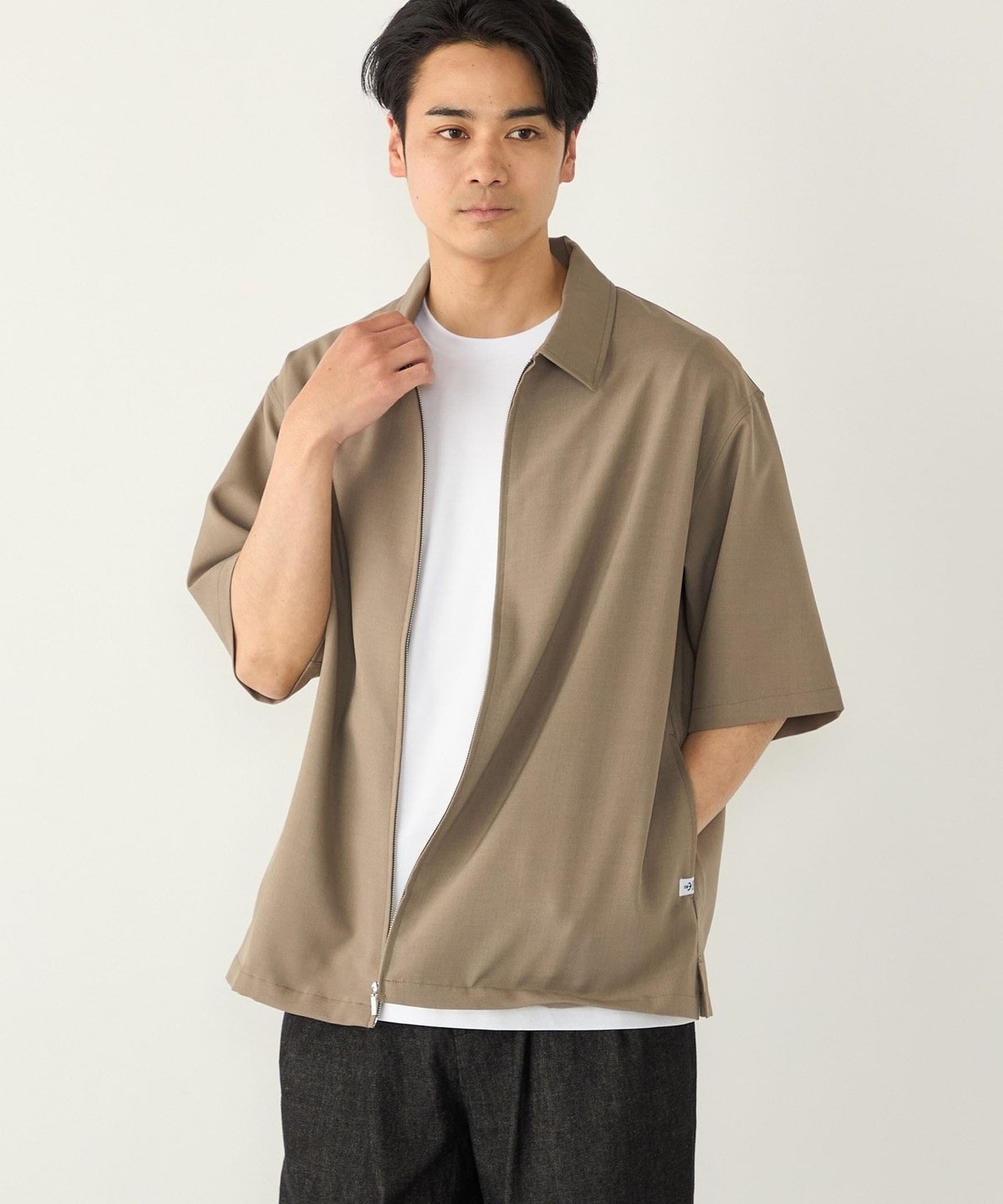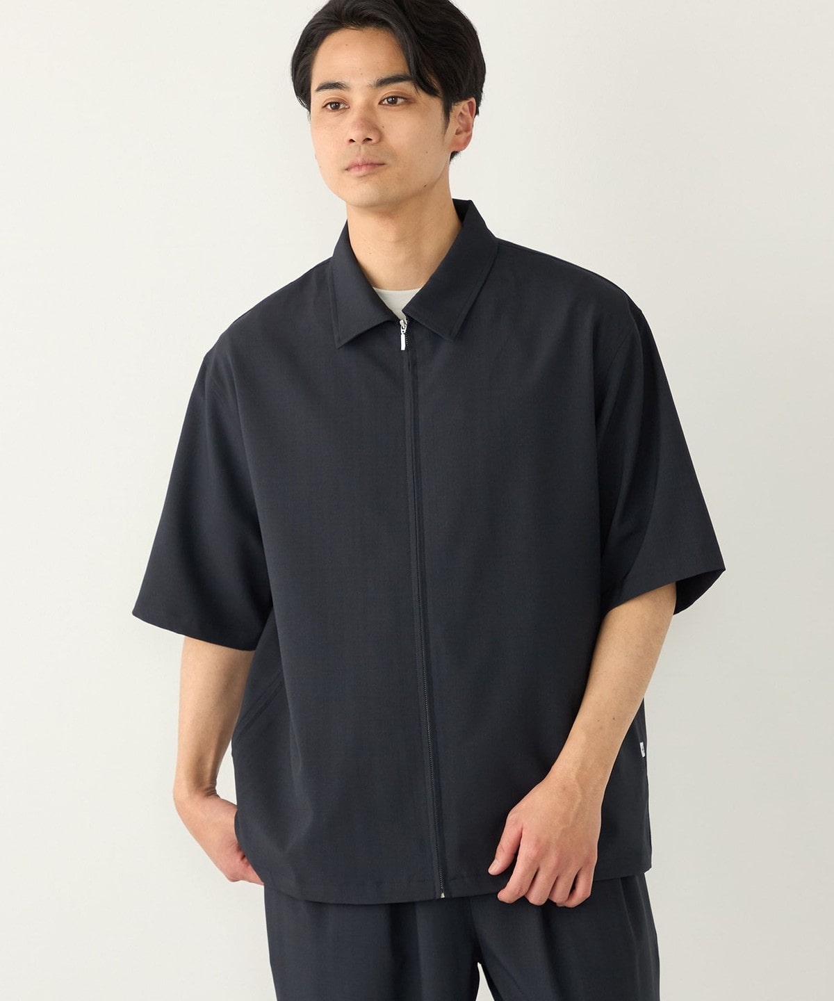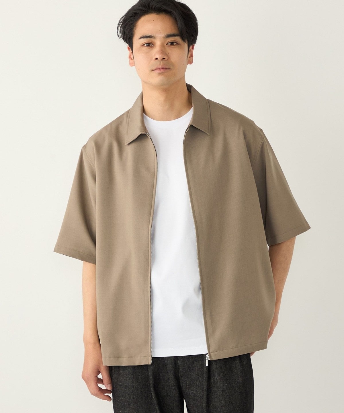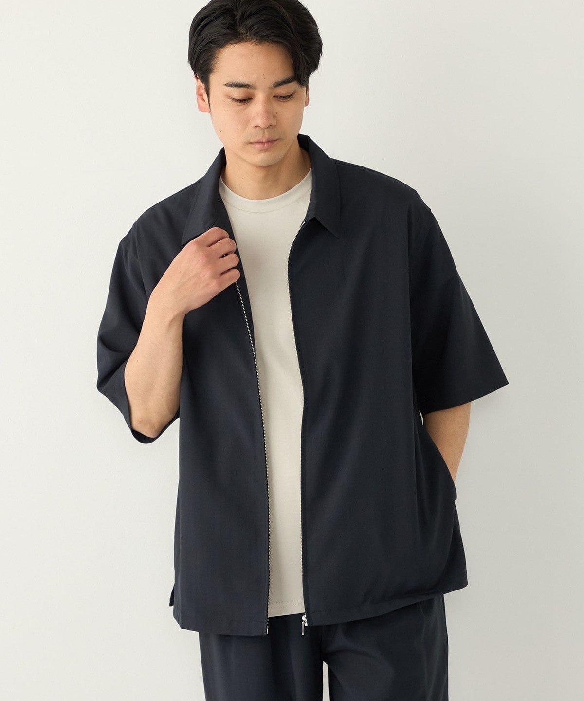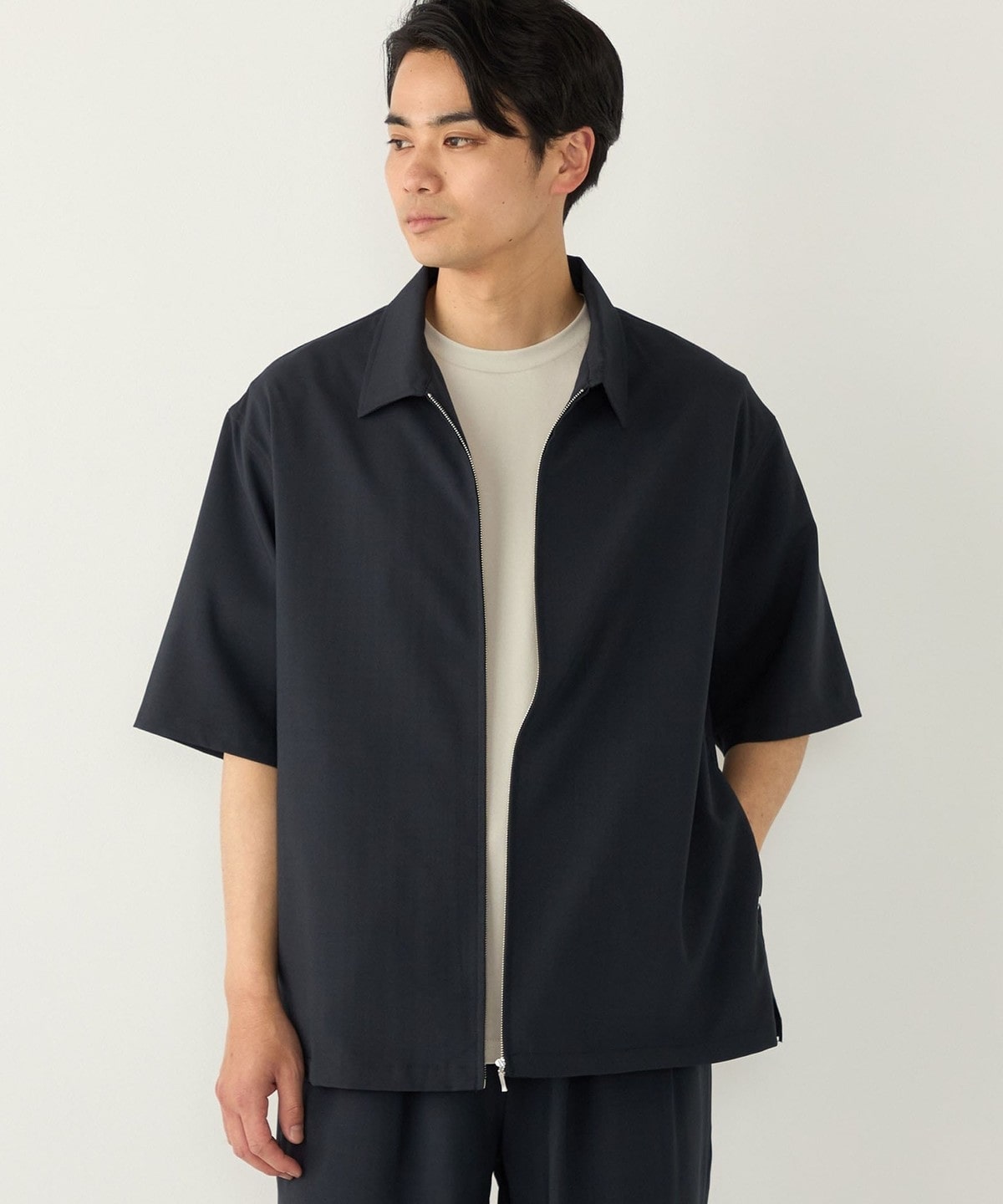 イージーケア性も魅力の合繊素材を使用したジップアップシャツ。