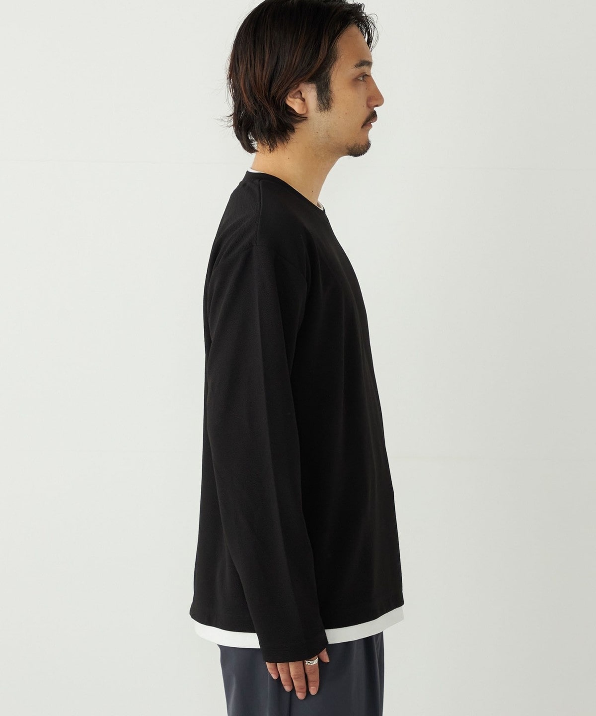 生地の独特な表情が魅力の、フェイクレイヤードのロンT。