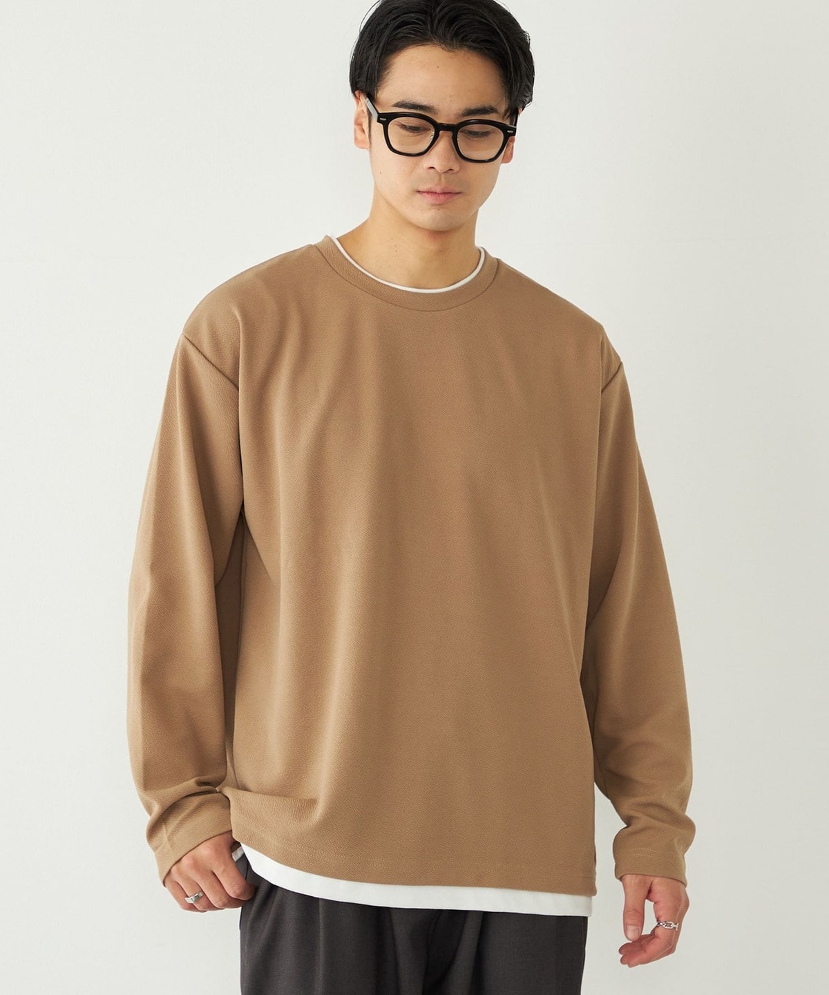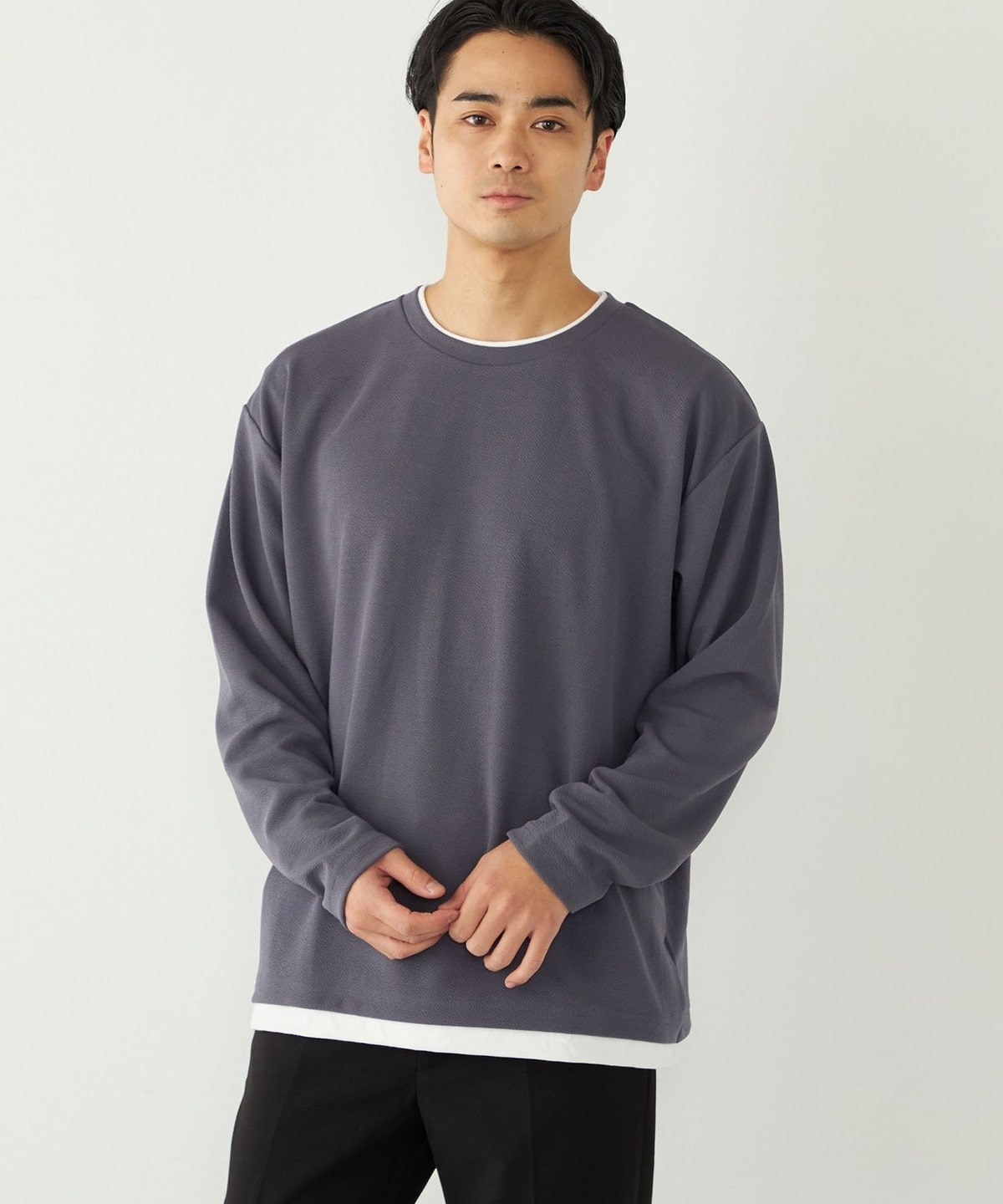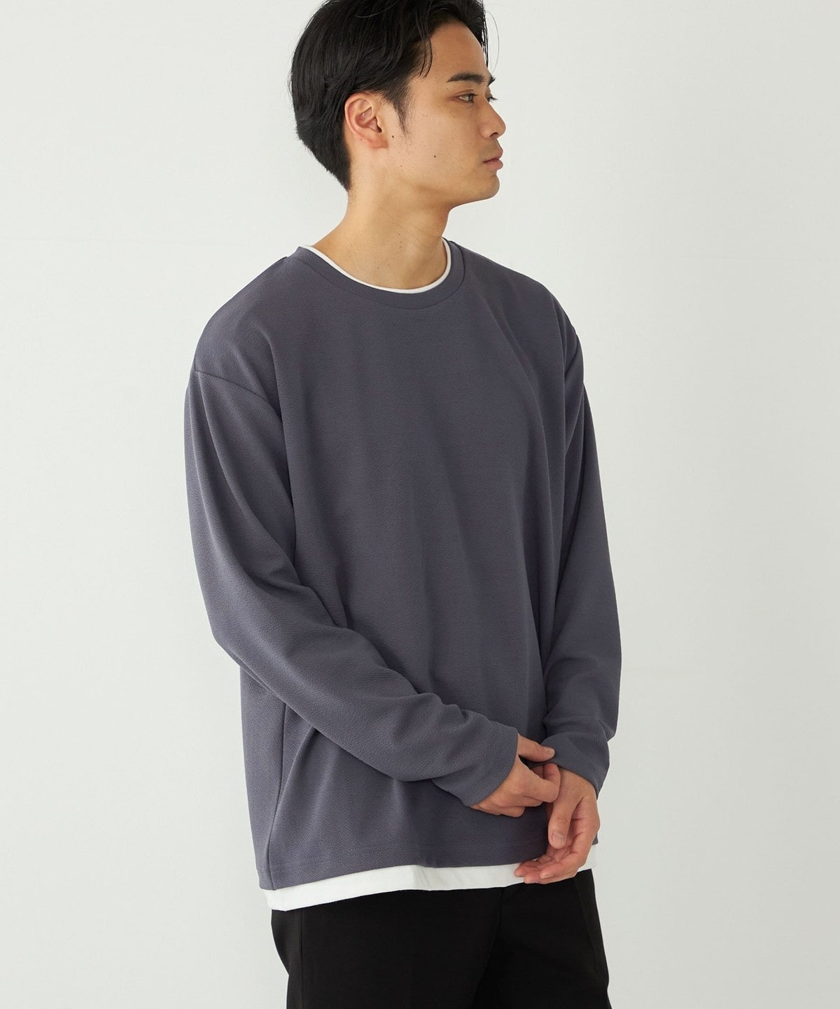 生地の独特な表情が魅力の、フェイクレイヤードのロンT。