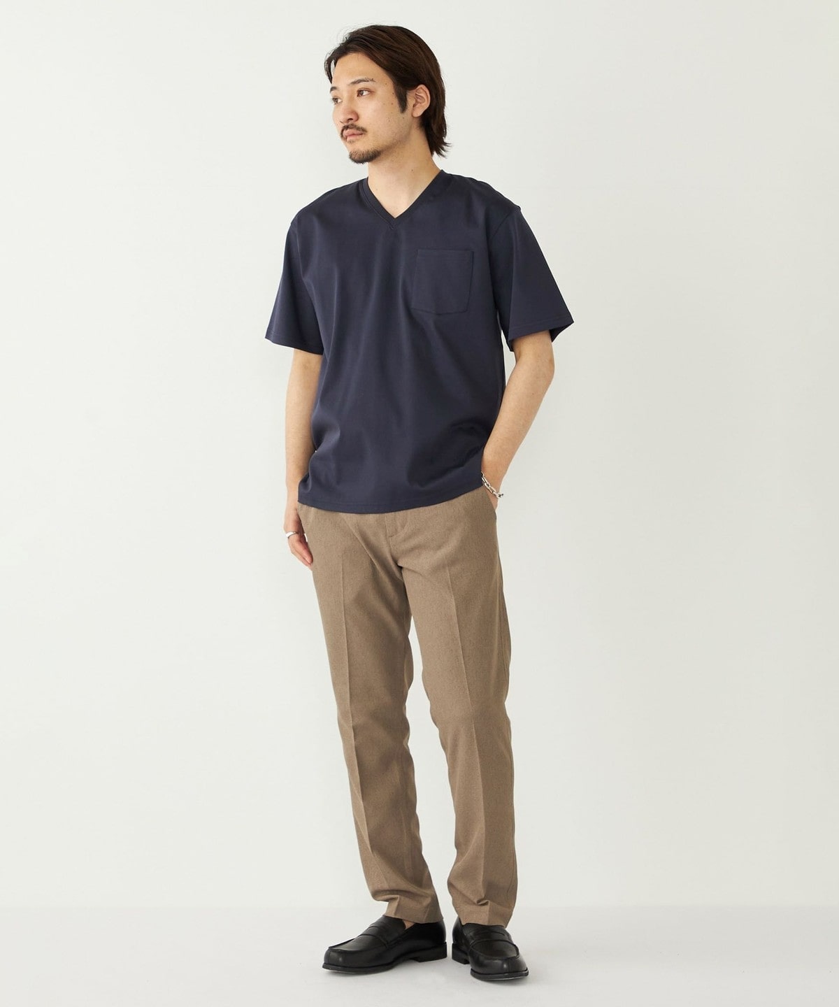 程よい深さのVネックが着こなしに落ち着いた印象を与えてくれます。
