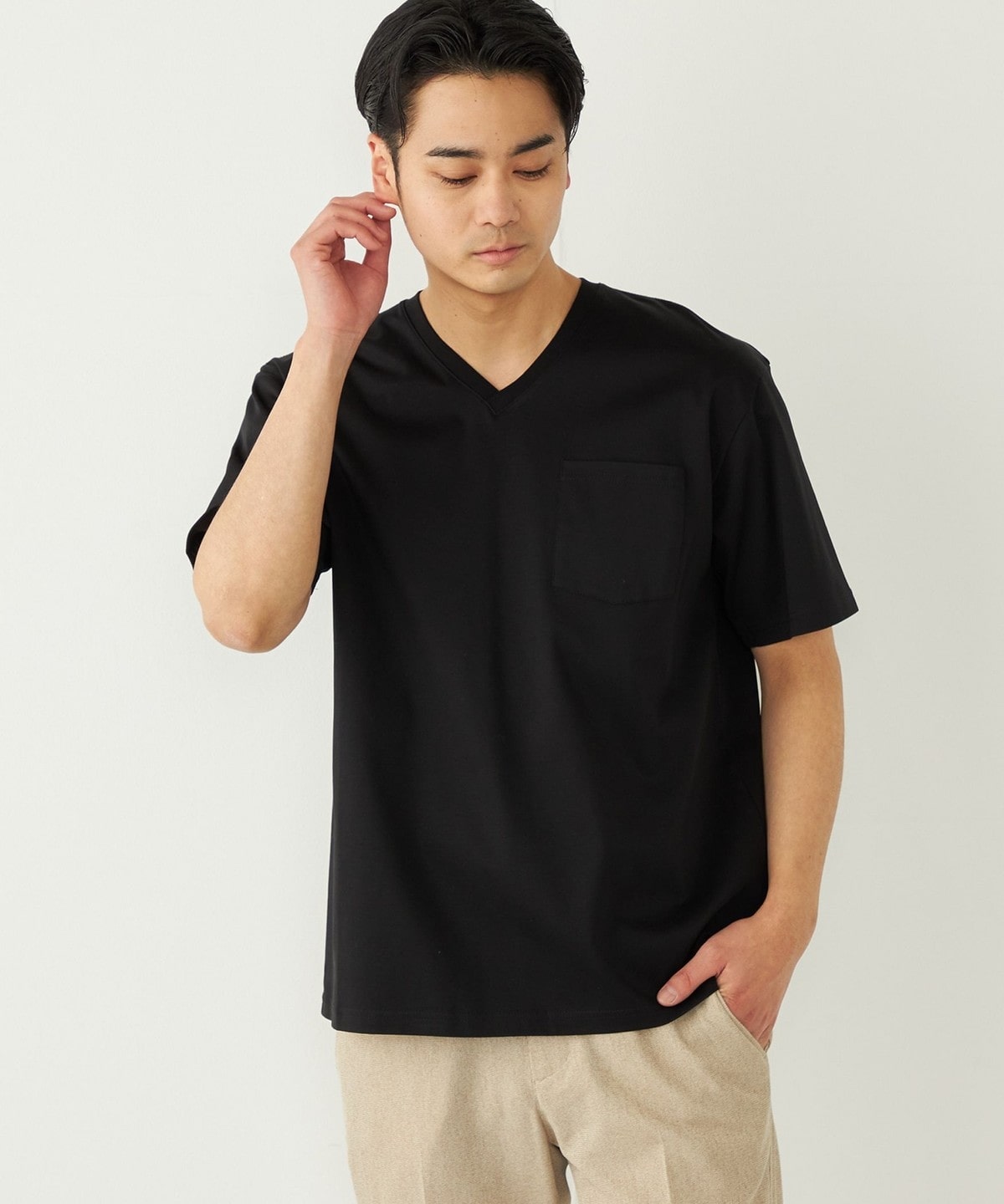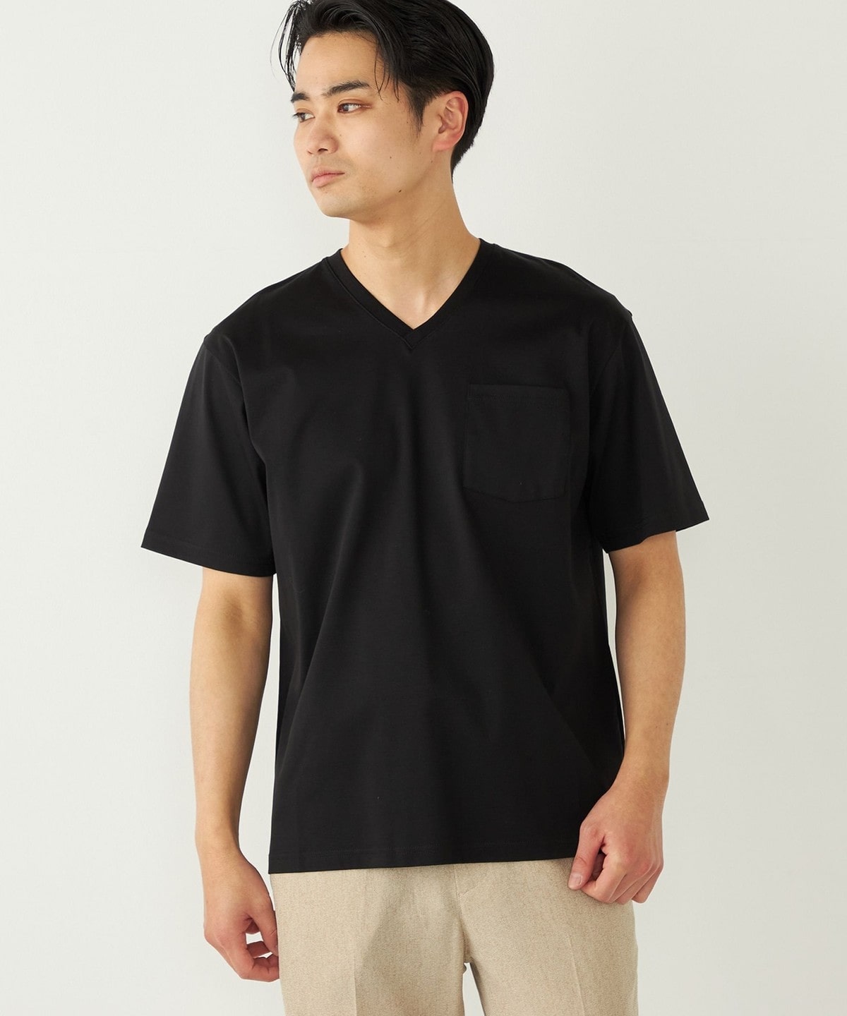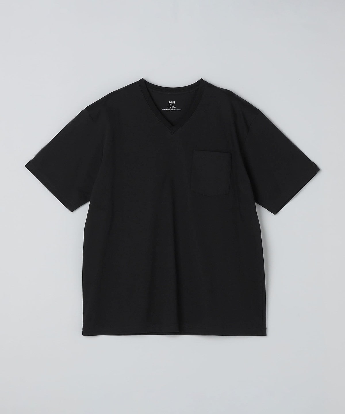 4. 《予約》SHIPS Colors:〈抗菌防臭・UVカット〉シルケット コットン Vネック T◆ ブラック
