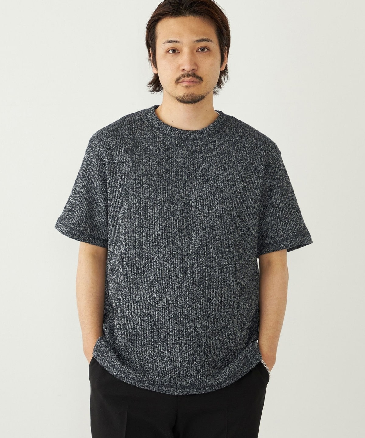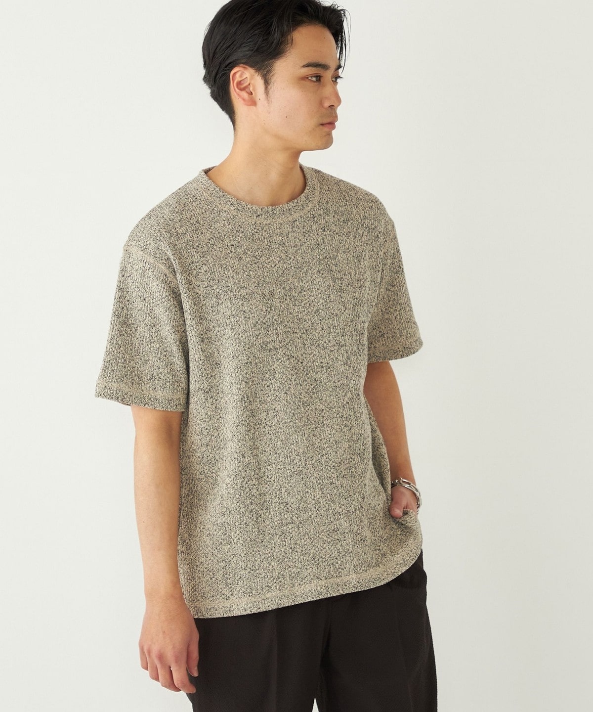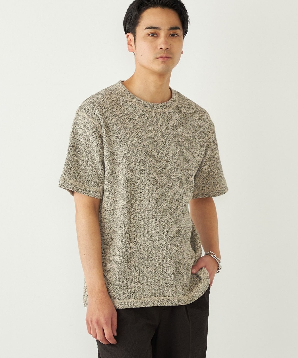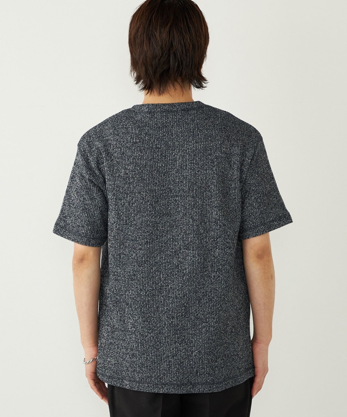 鹿の子編みの生地がニットのような表情も持っています。