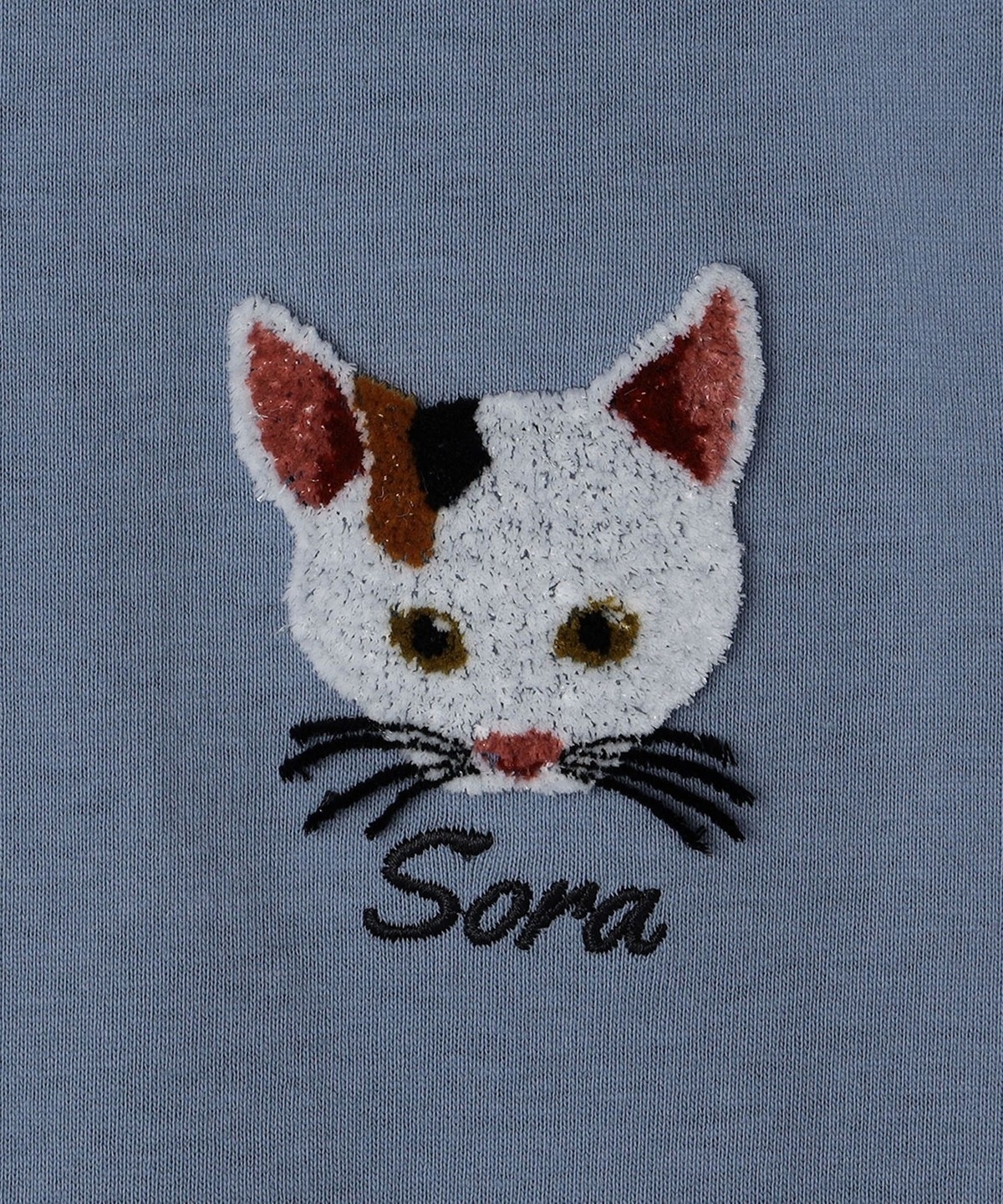 さかがみ家のかわいらしい保護犬・保護猫たちのお顔を、毛足が長い特殊な技法でフロントの左胸に刺繍しています。