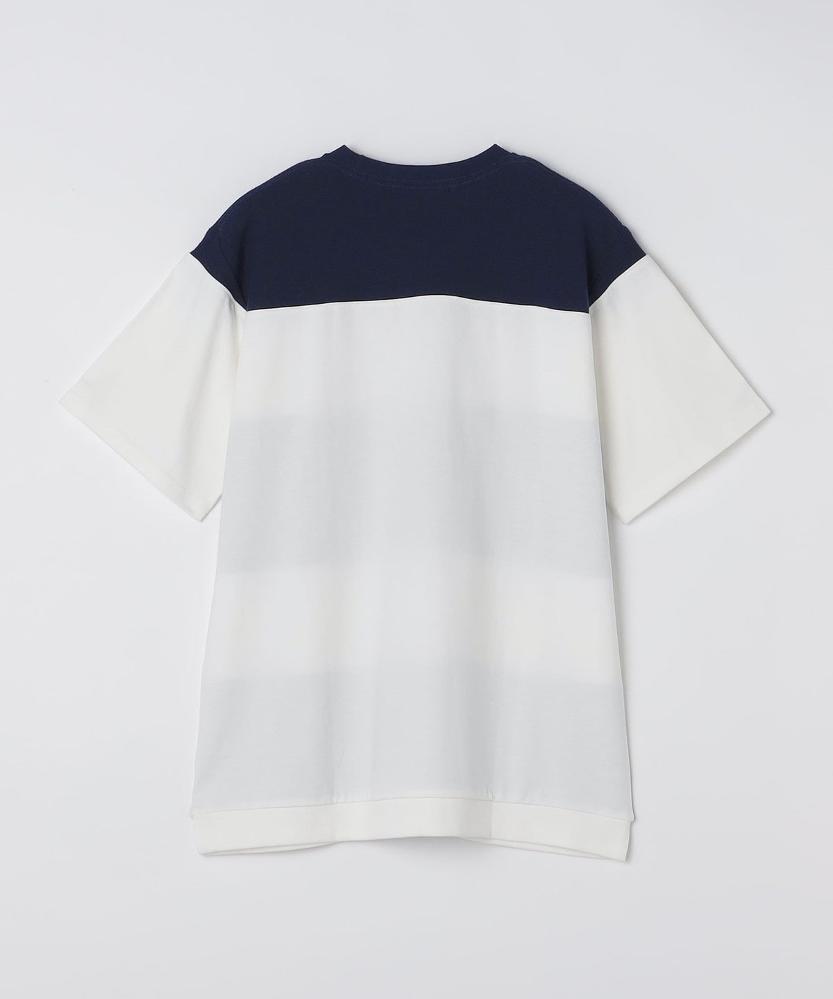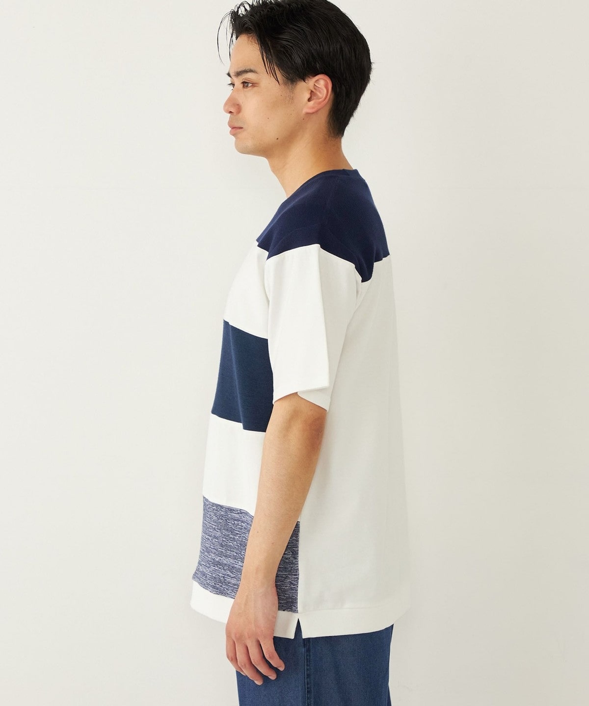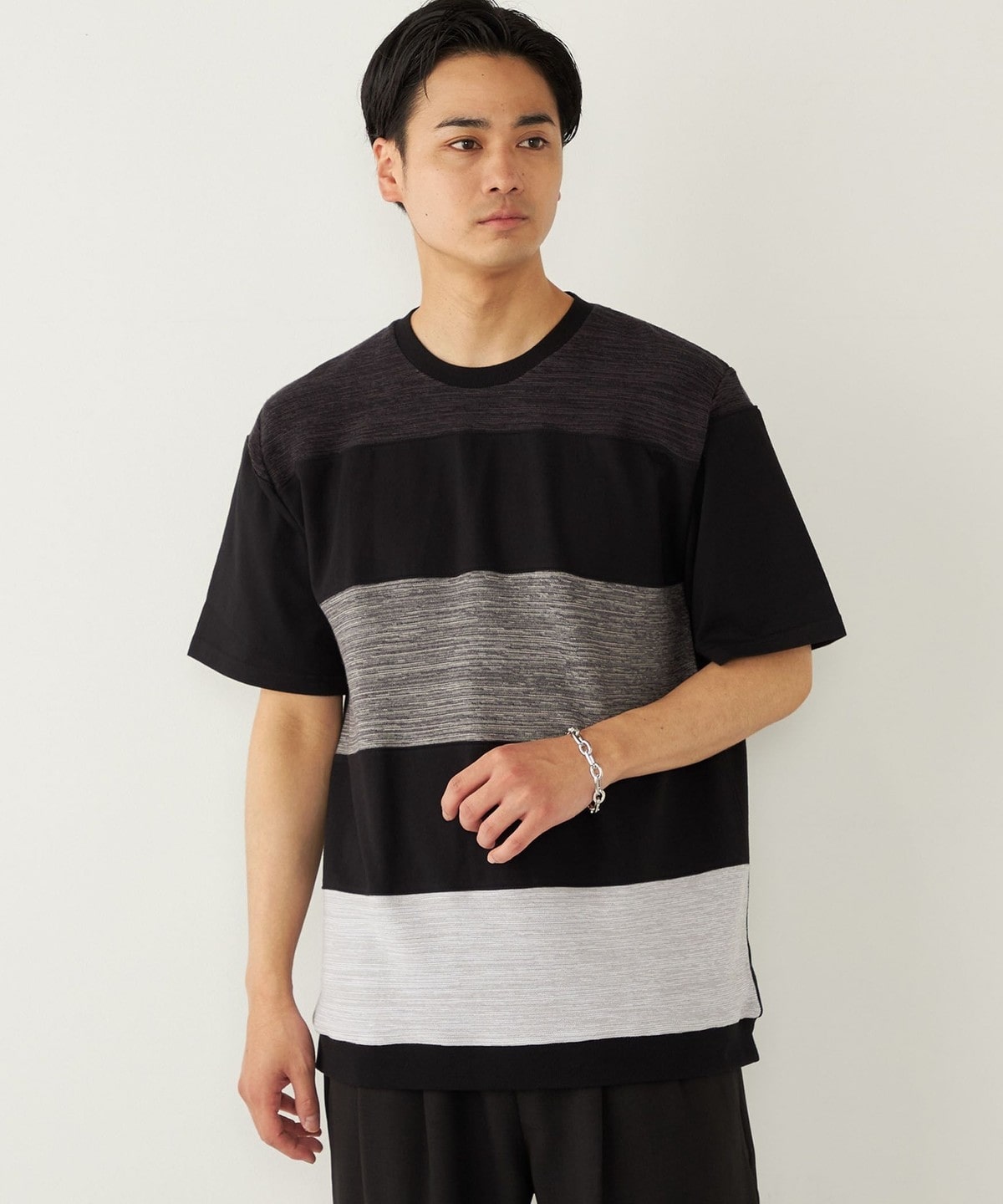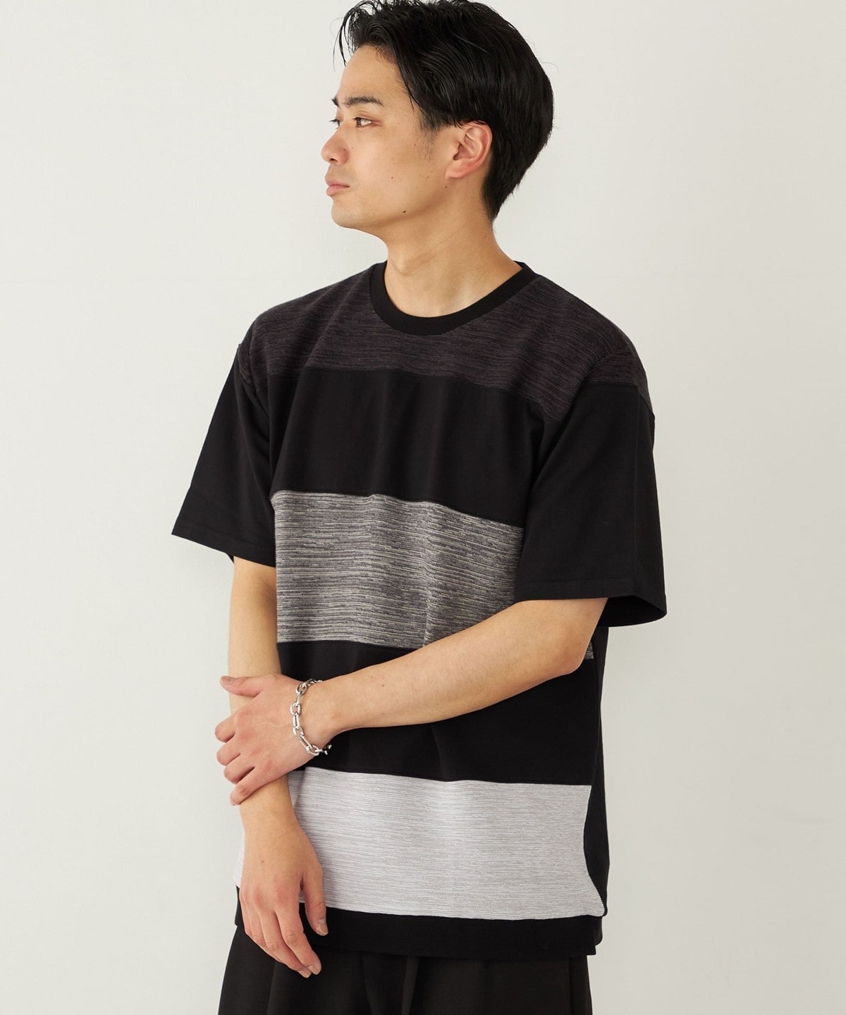 異なる素材を切り替えることでボーダーを表現したTシャツアイテム。