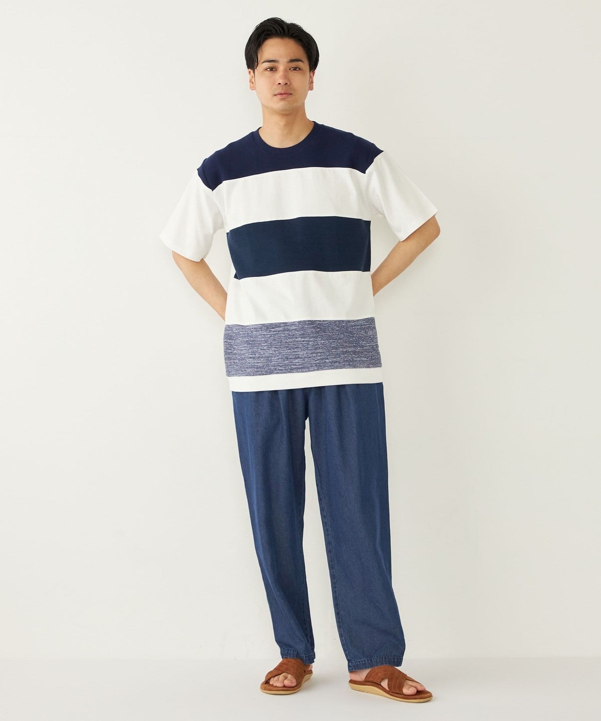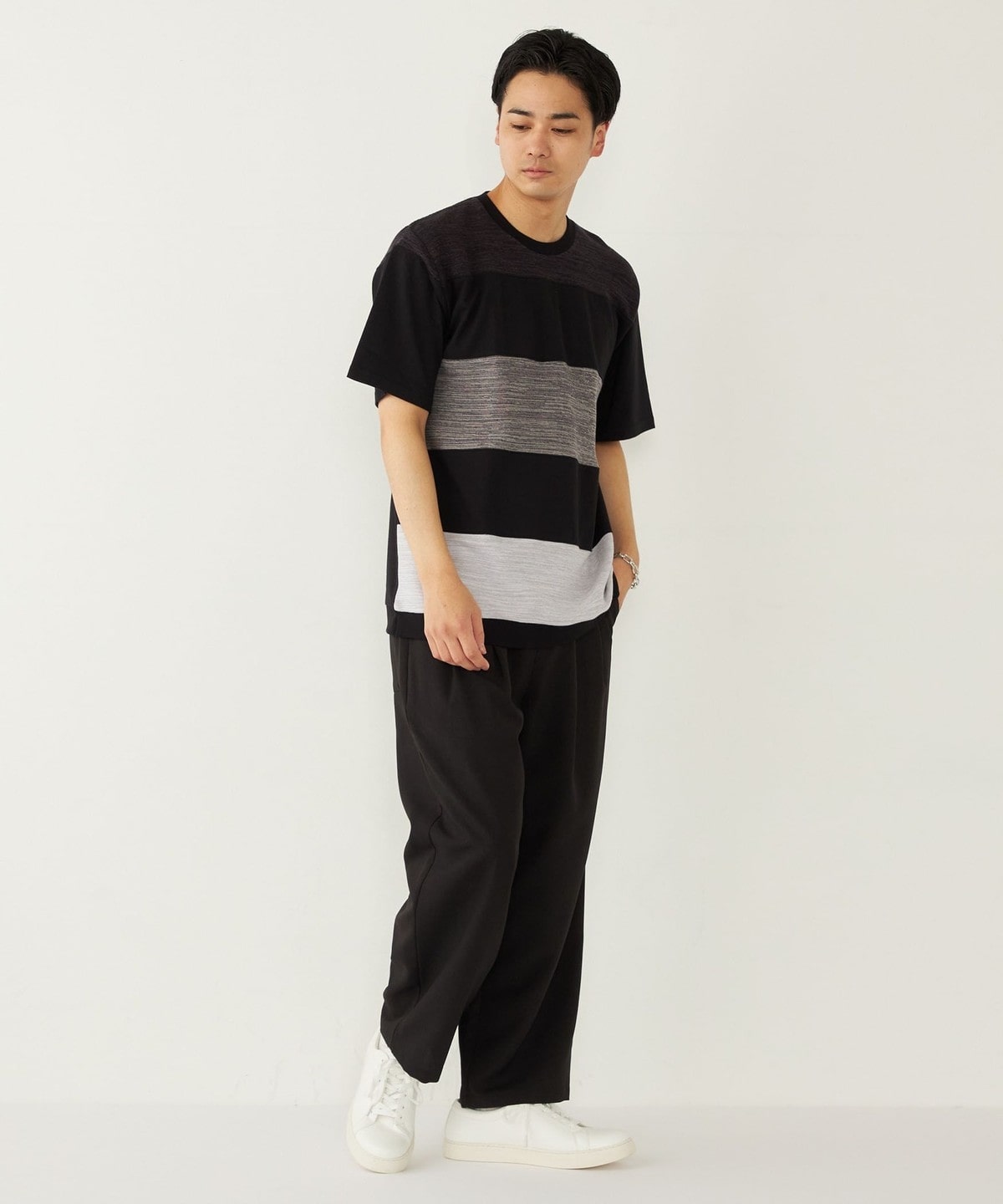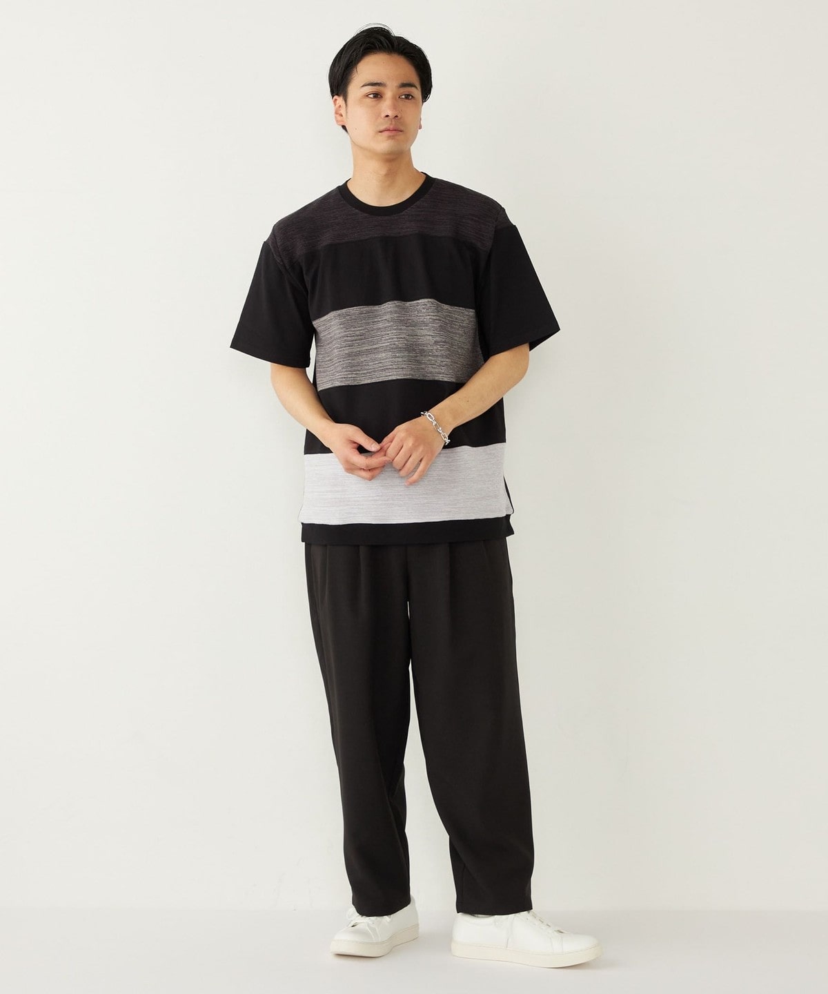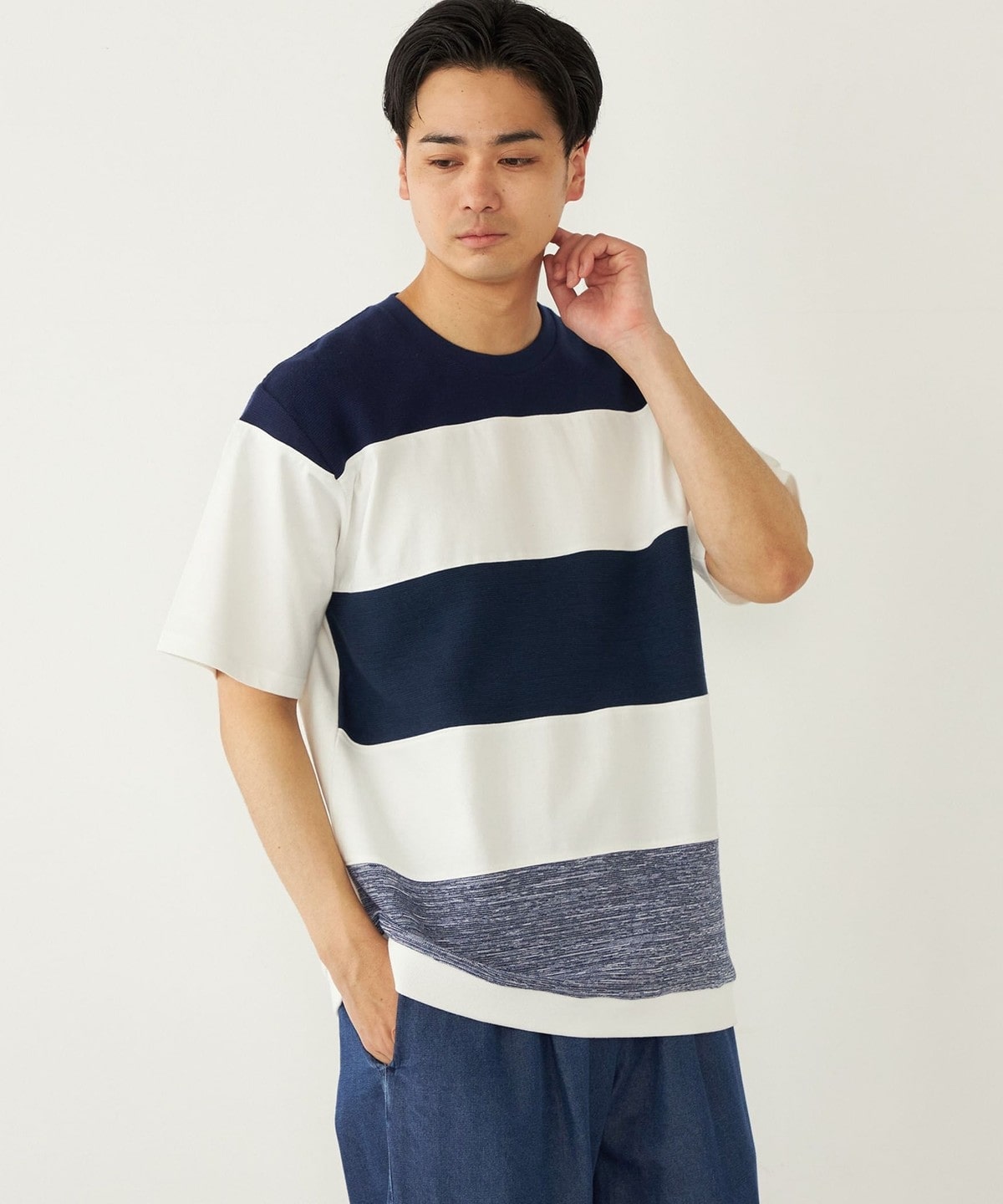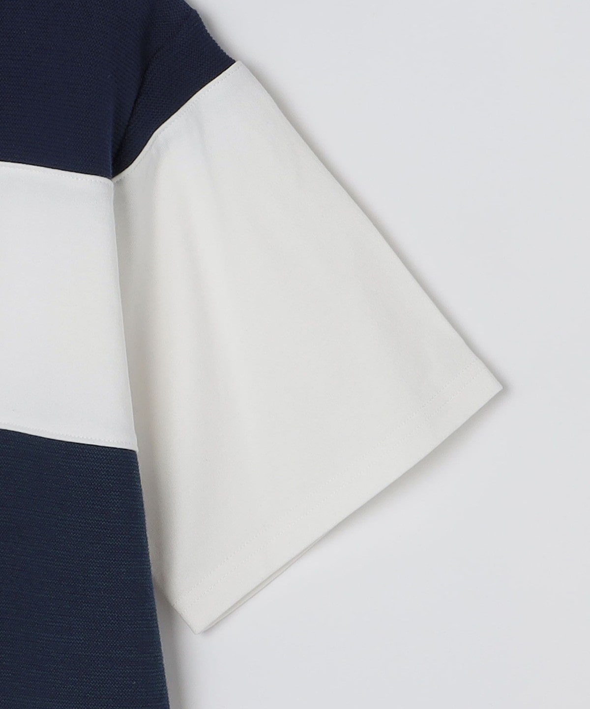異なる素材を切り替えることでボーダーを表現したTシャツアイテム。