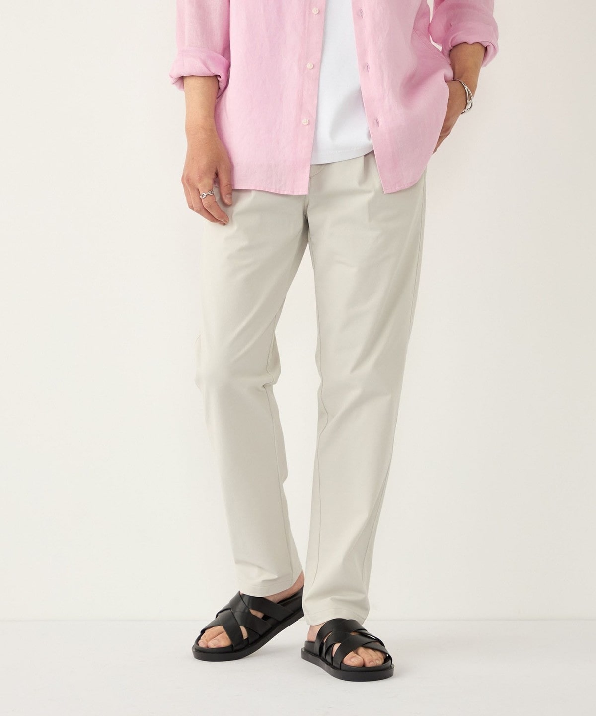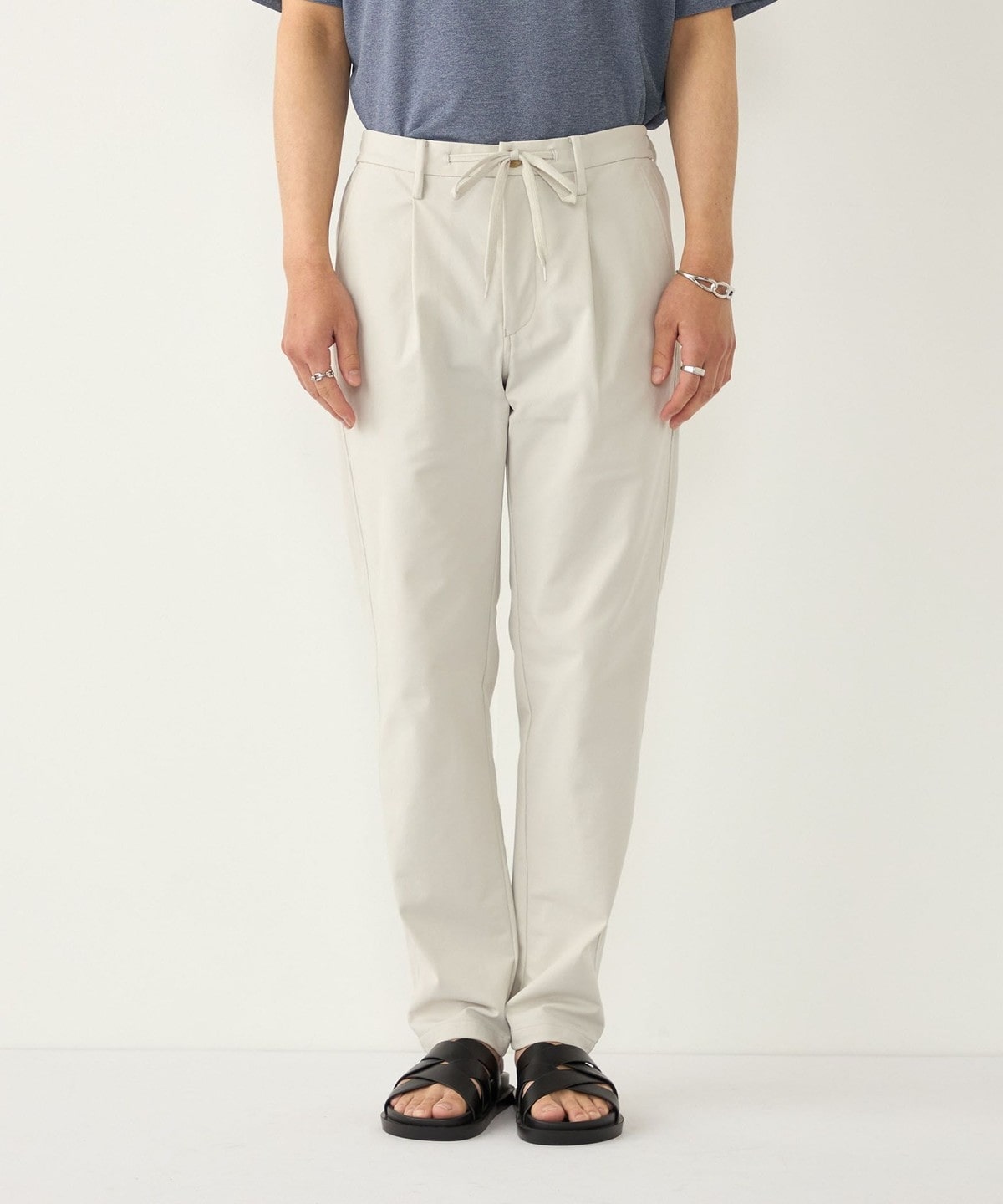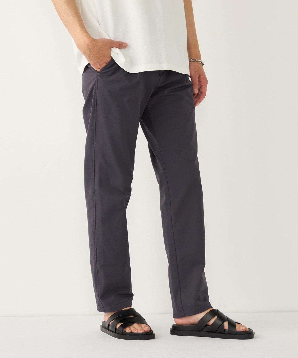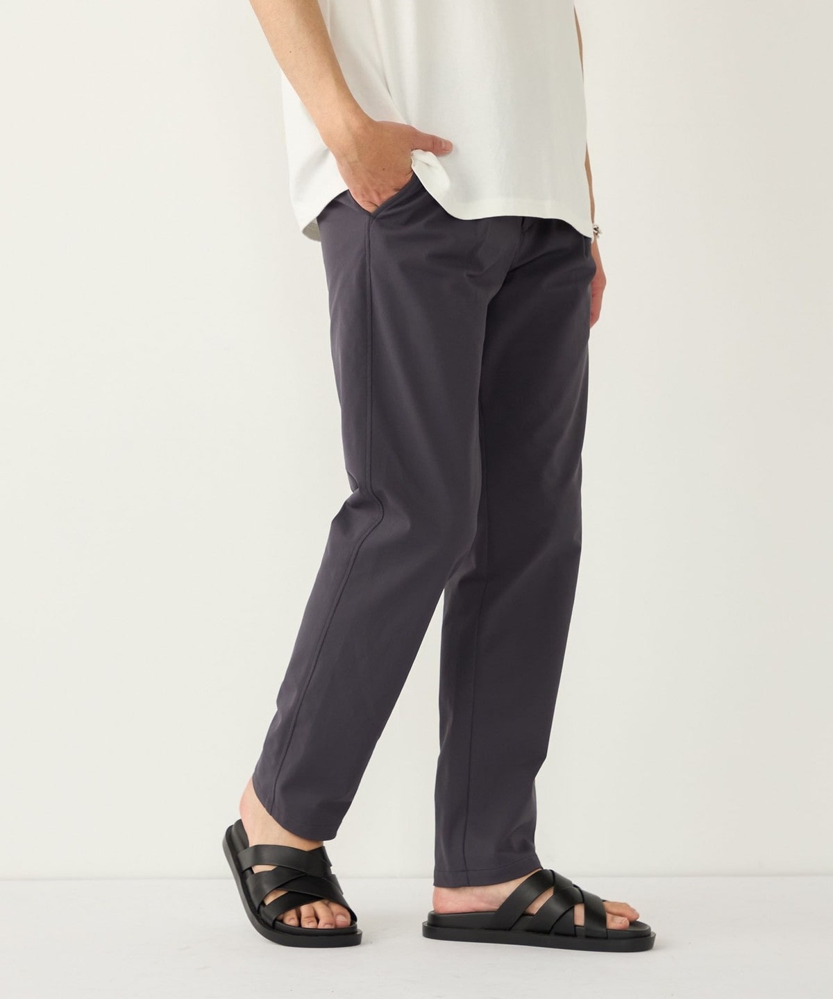 ポリエステル素材を使用したイージーチノパンツ。