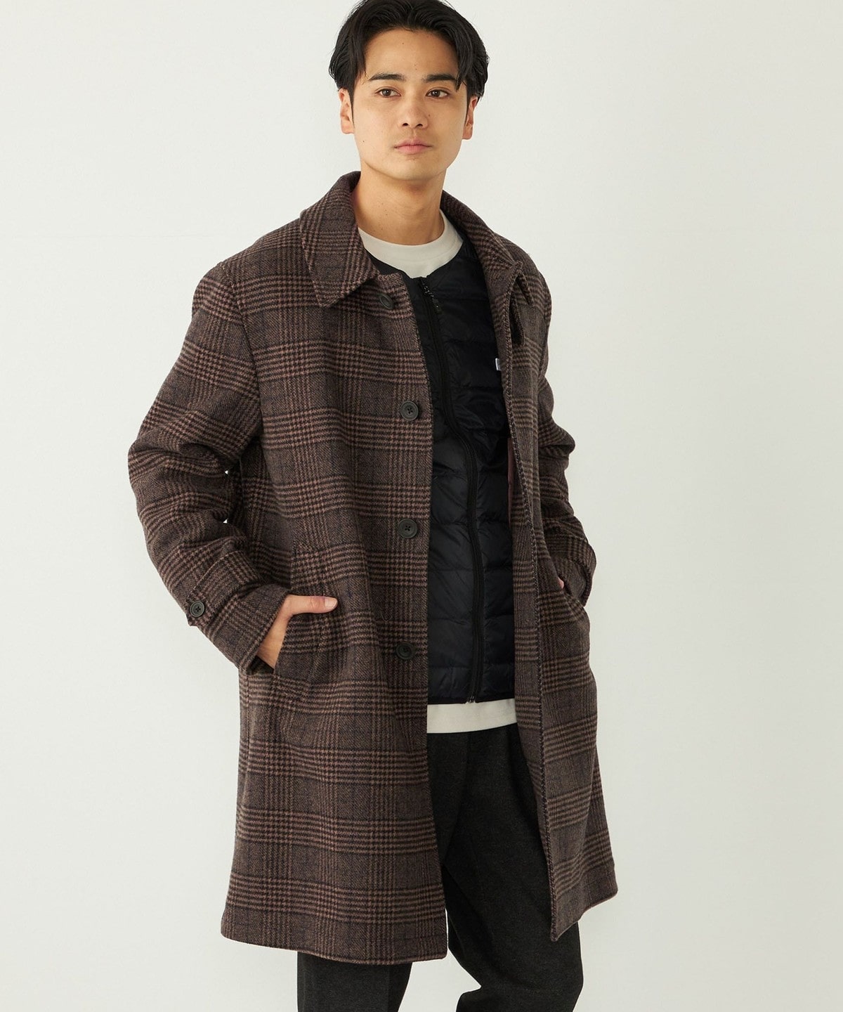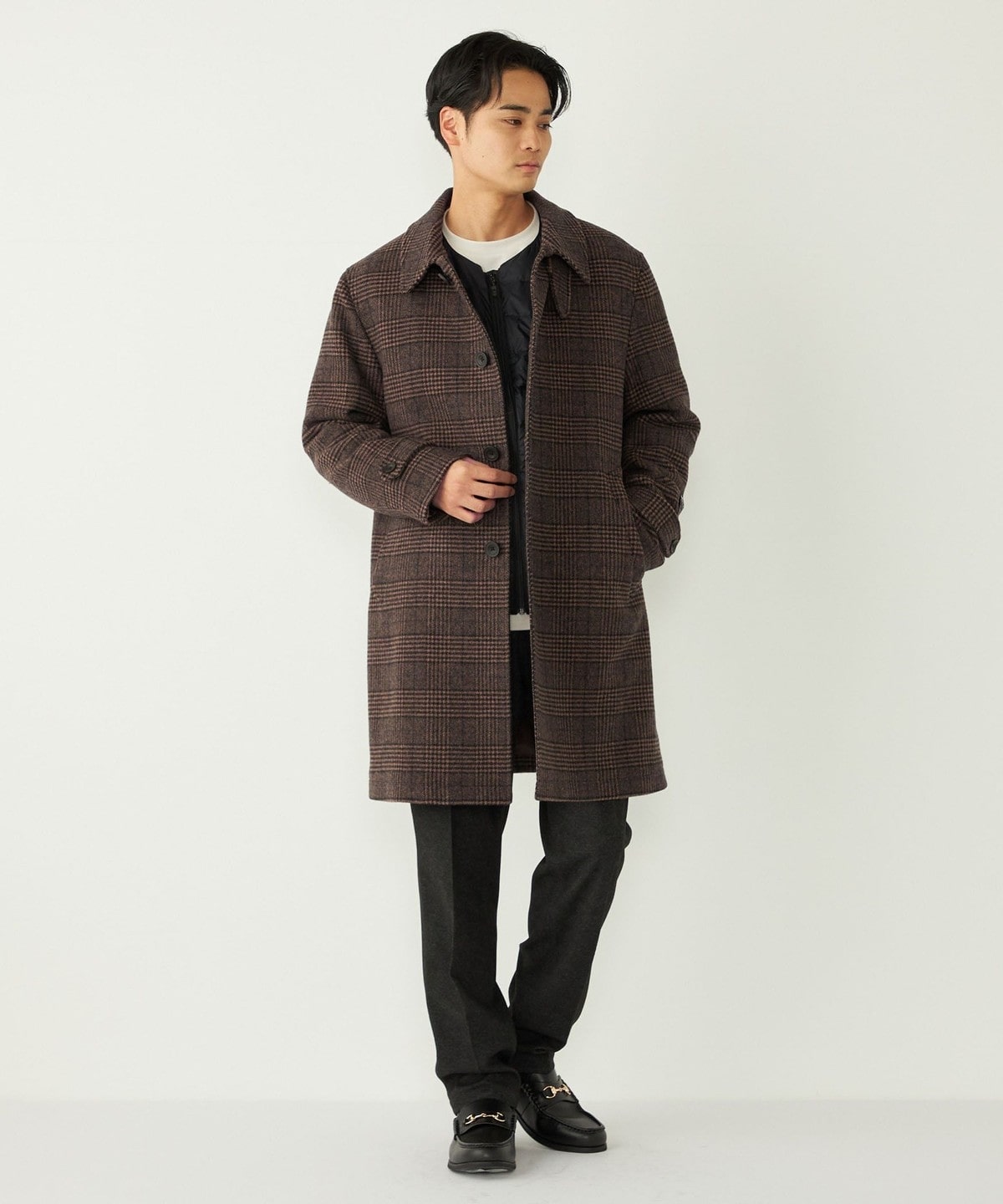 落ち着いたチェック柄とカラーリングで、様々なシーンでご着用いただけるコートです。