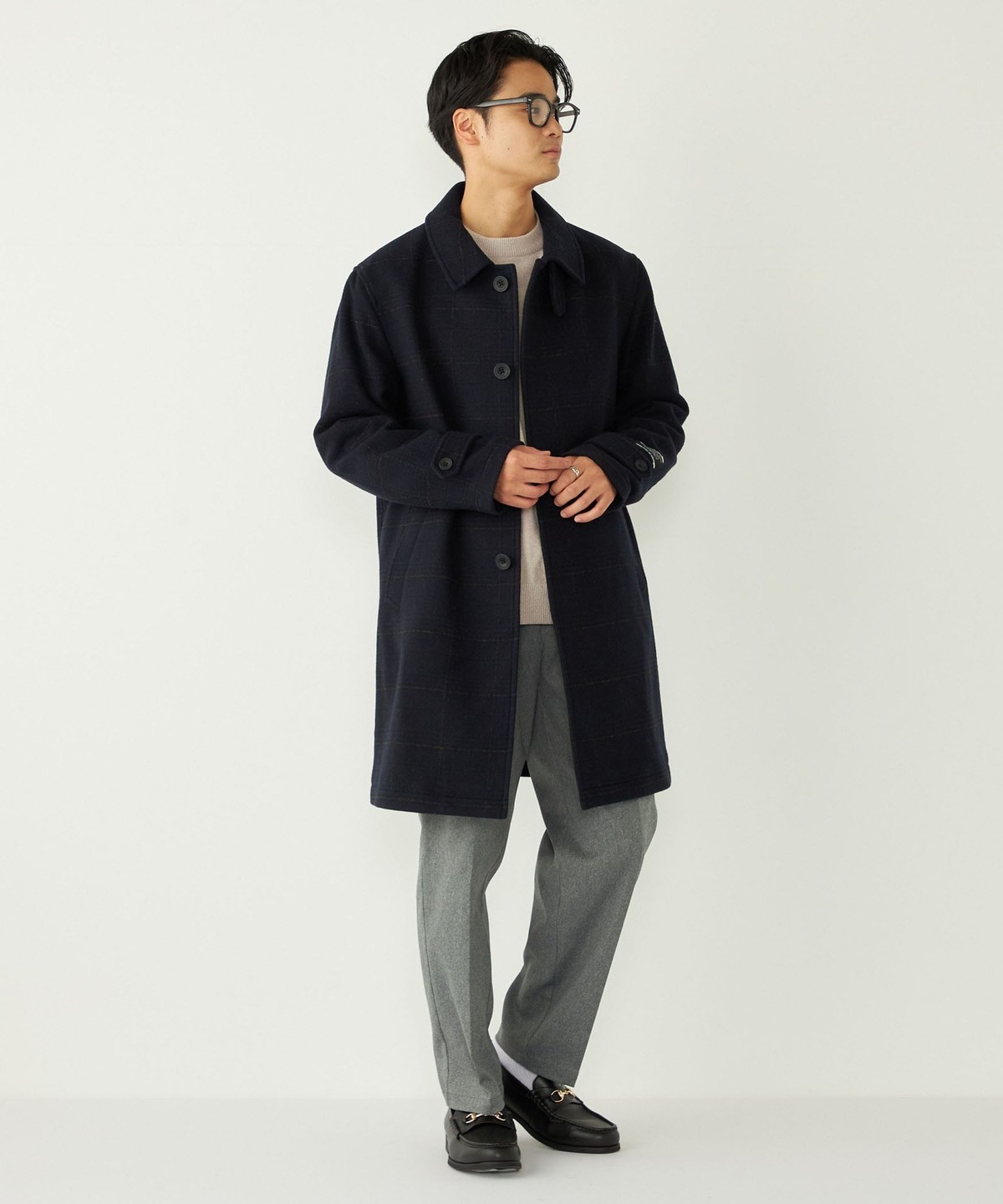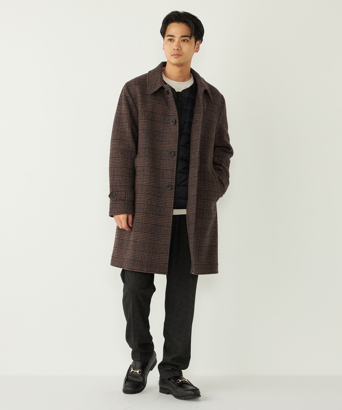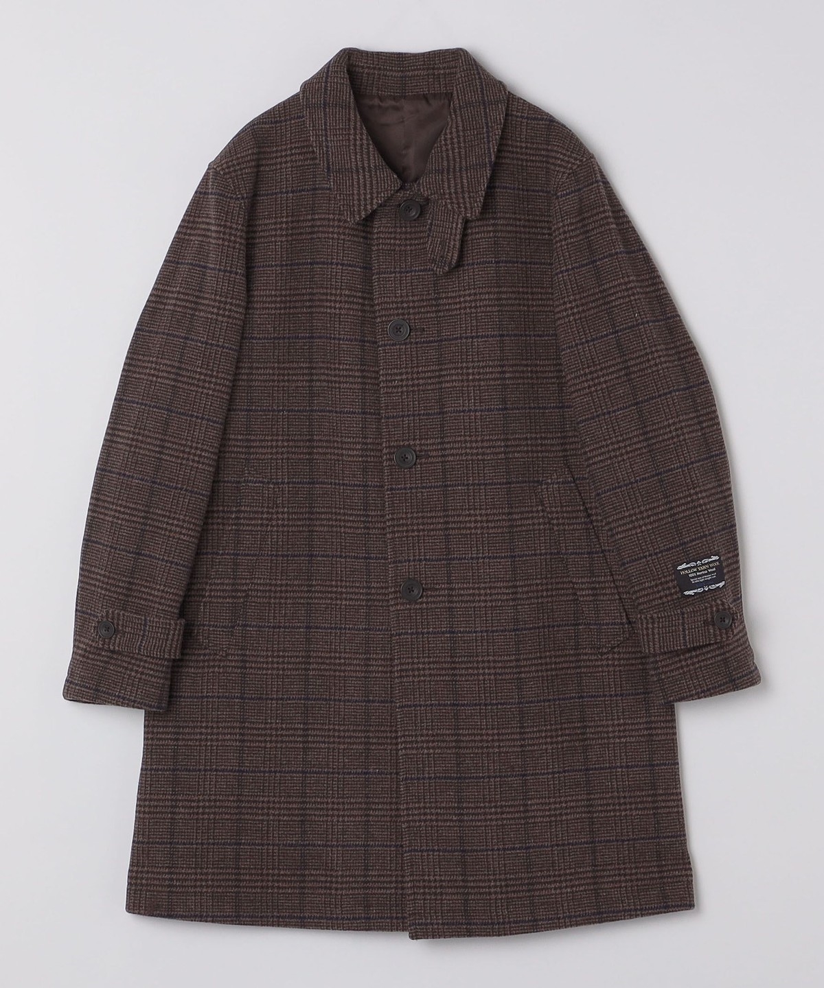 落ち着いたチェック柄とカラーリングで、様々なシーンでご着用いただけるコートです。
