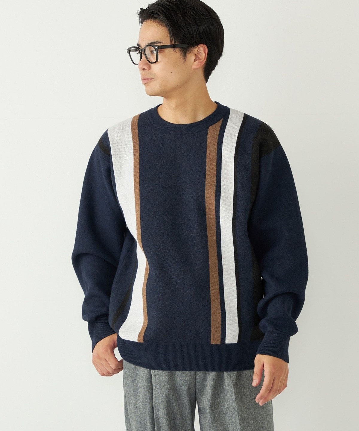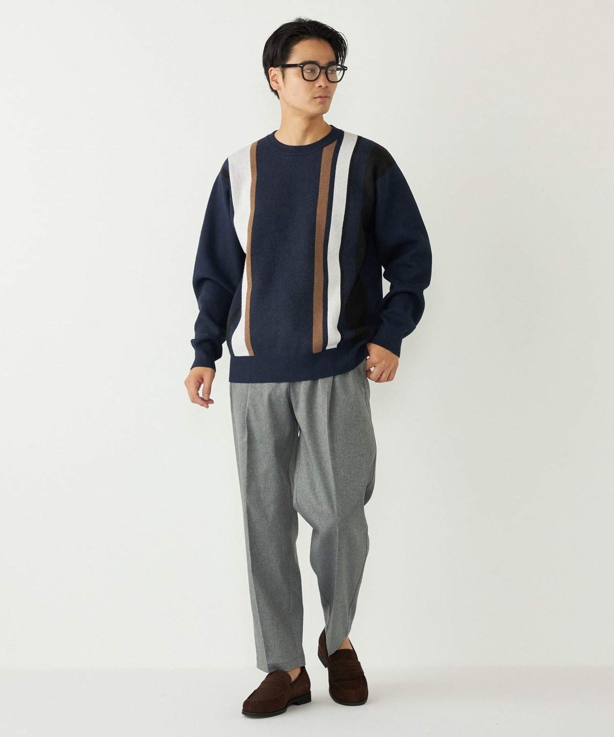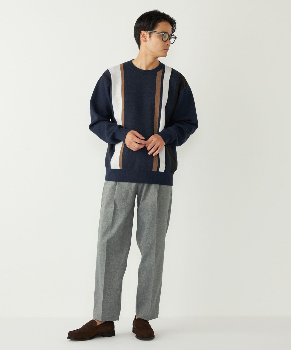 スタイリングの主役になる総柄ニットを、落ち着いたカラーリングでコーディネートに取り入れやすく仕上げました。
