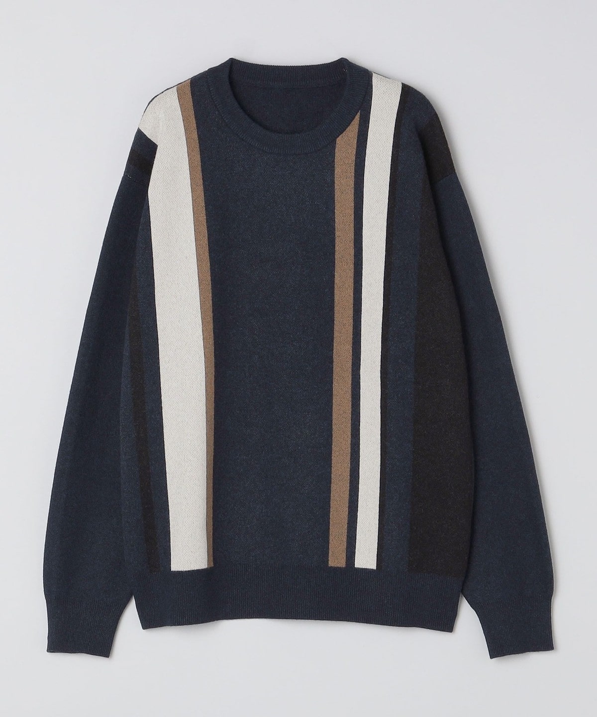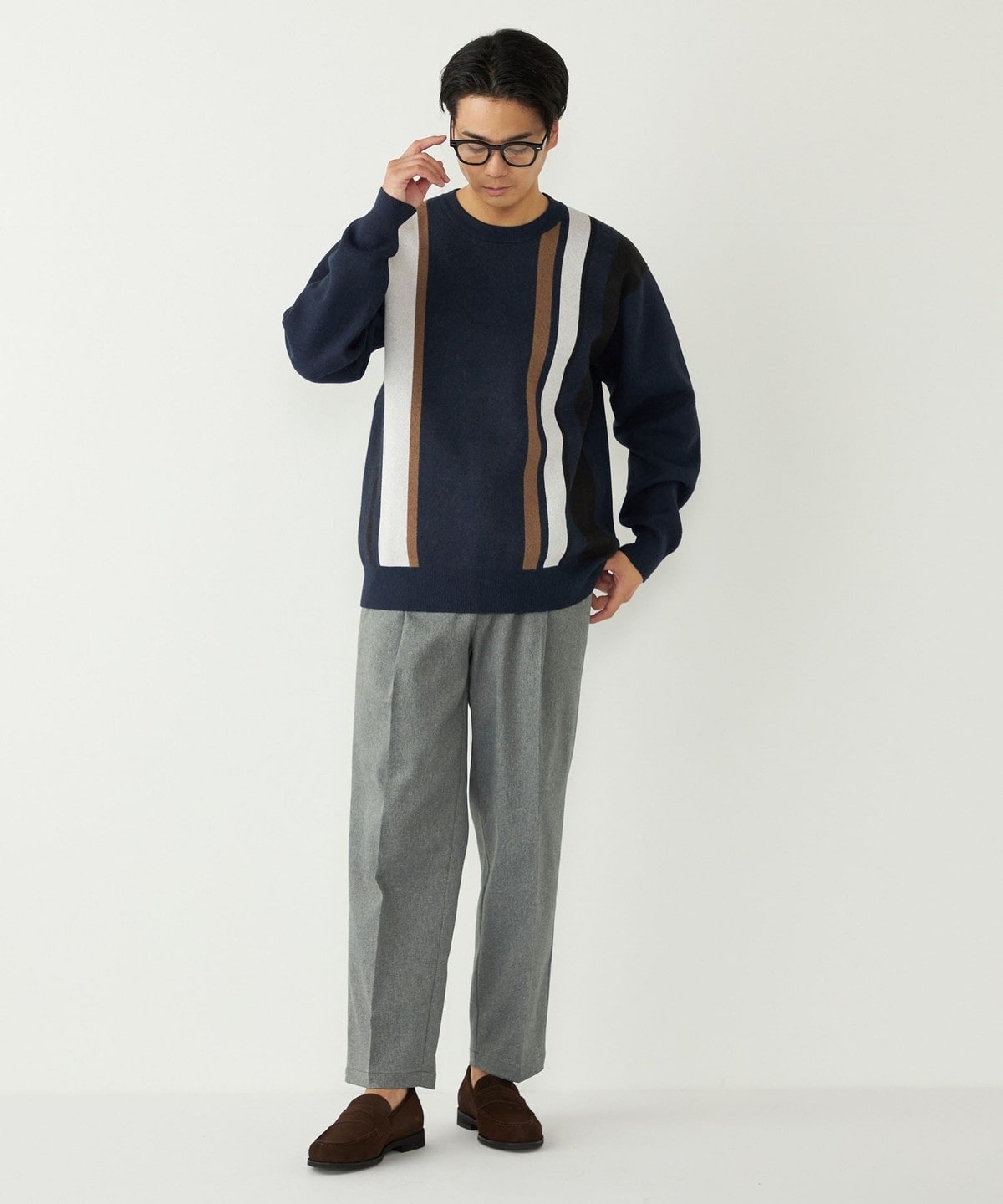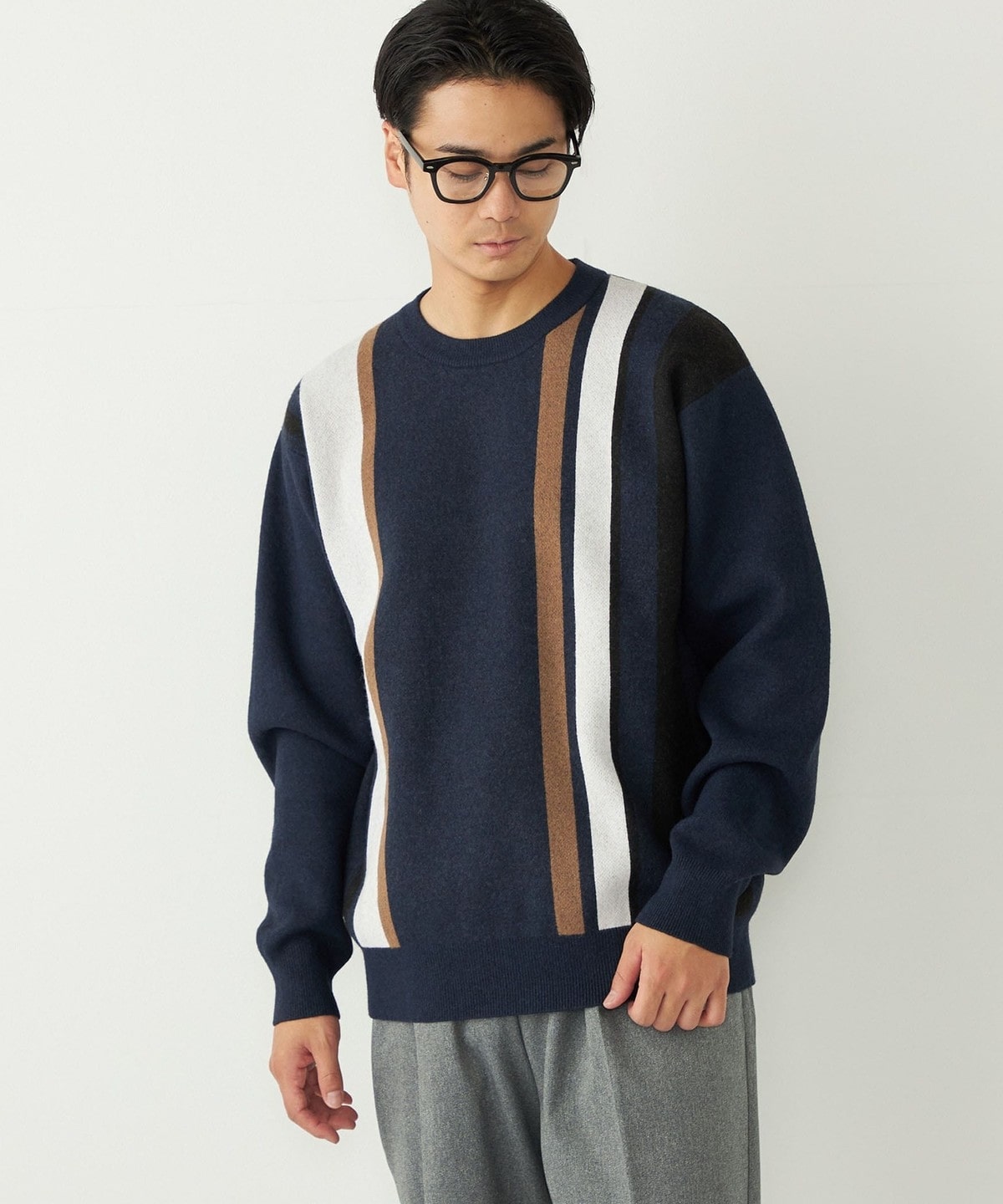 スタイリングの主役になる総柄ニットを、落ち着いたカラーリングでコーディネートに取り入れやすく仕上げました。