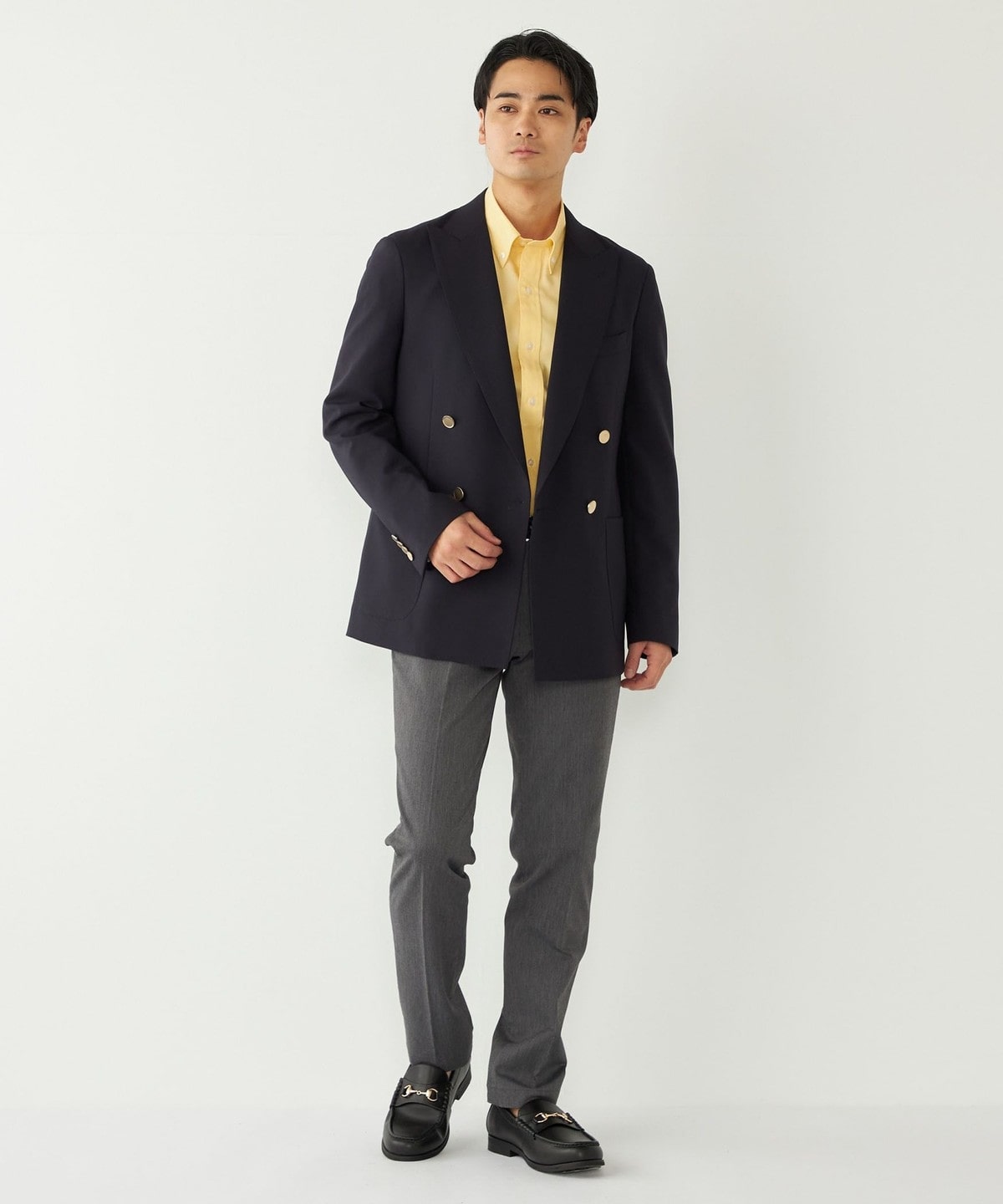 適度な幅のピークドラペルや、モダンな印象を与えてくれるフラットなメタルボタンもポイントです。