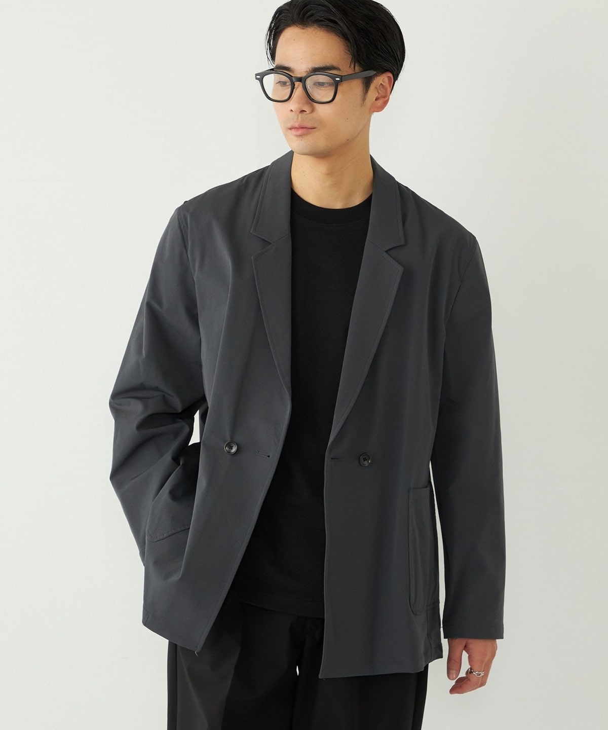 ストレッチナイロン素材を使用した、カジュアルダブルジャケット。