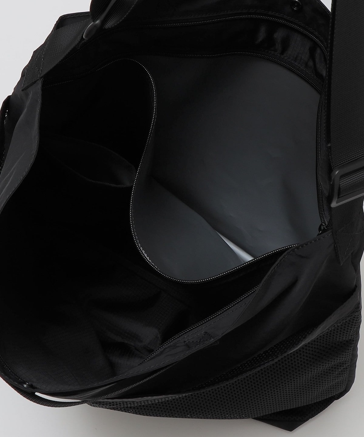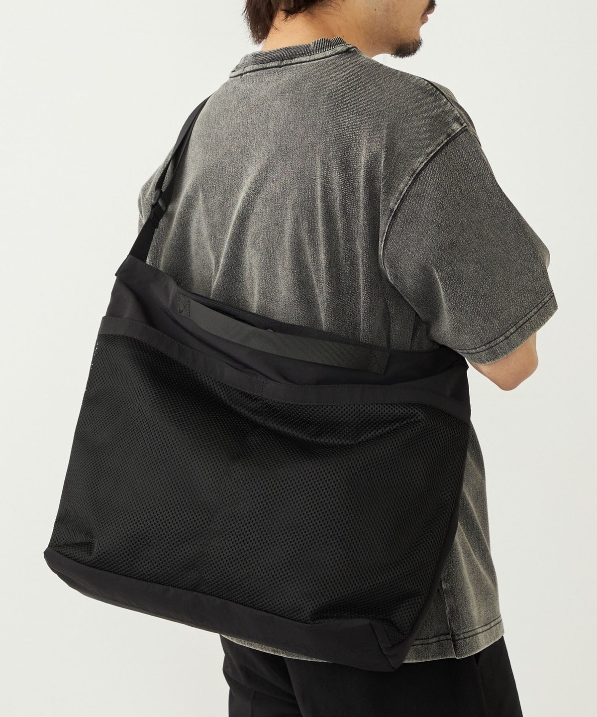 外側にはメッシュポケットを配し、収納だけでなくデザインのアクセントにもなっています。
