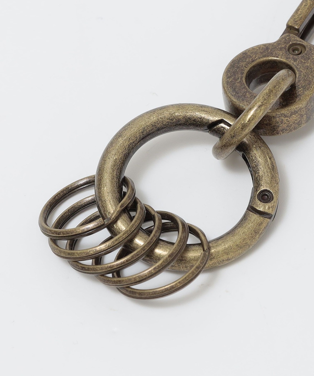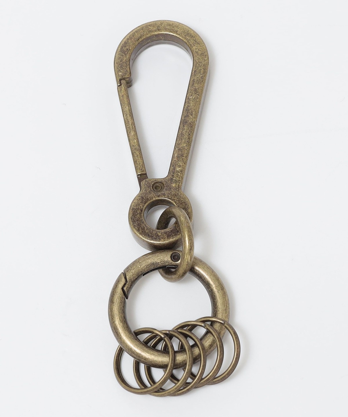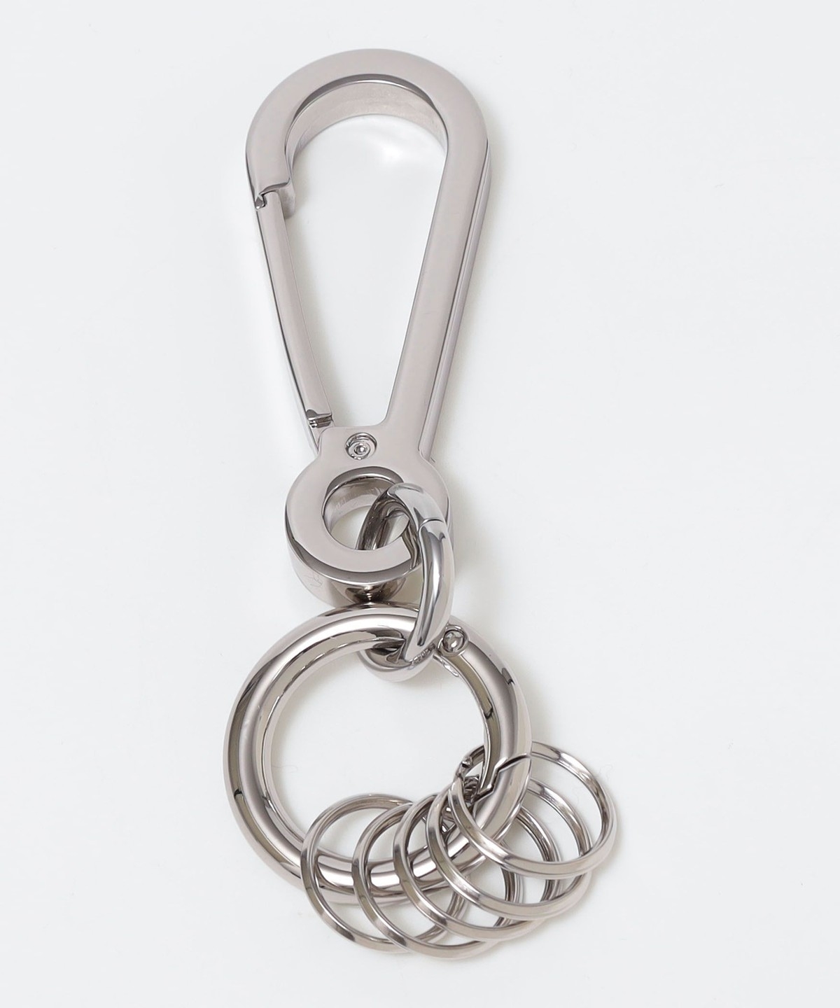 大小のキーリングが付いたカラビナ型のキーホルダー。