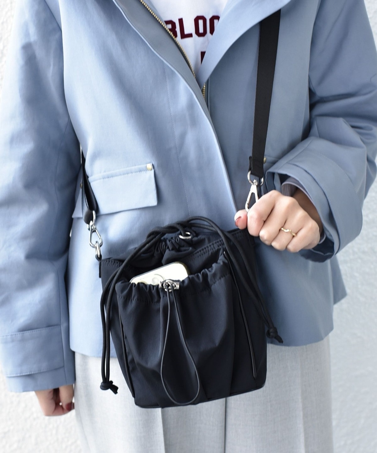 ポケット部分のギャザーデザインがポイントの、巾着型ショルダーバッグ。