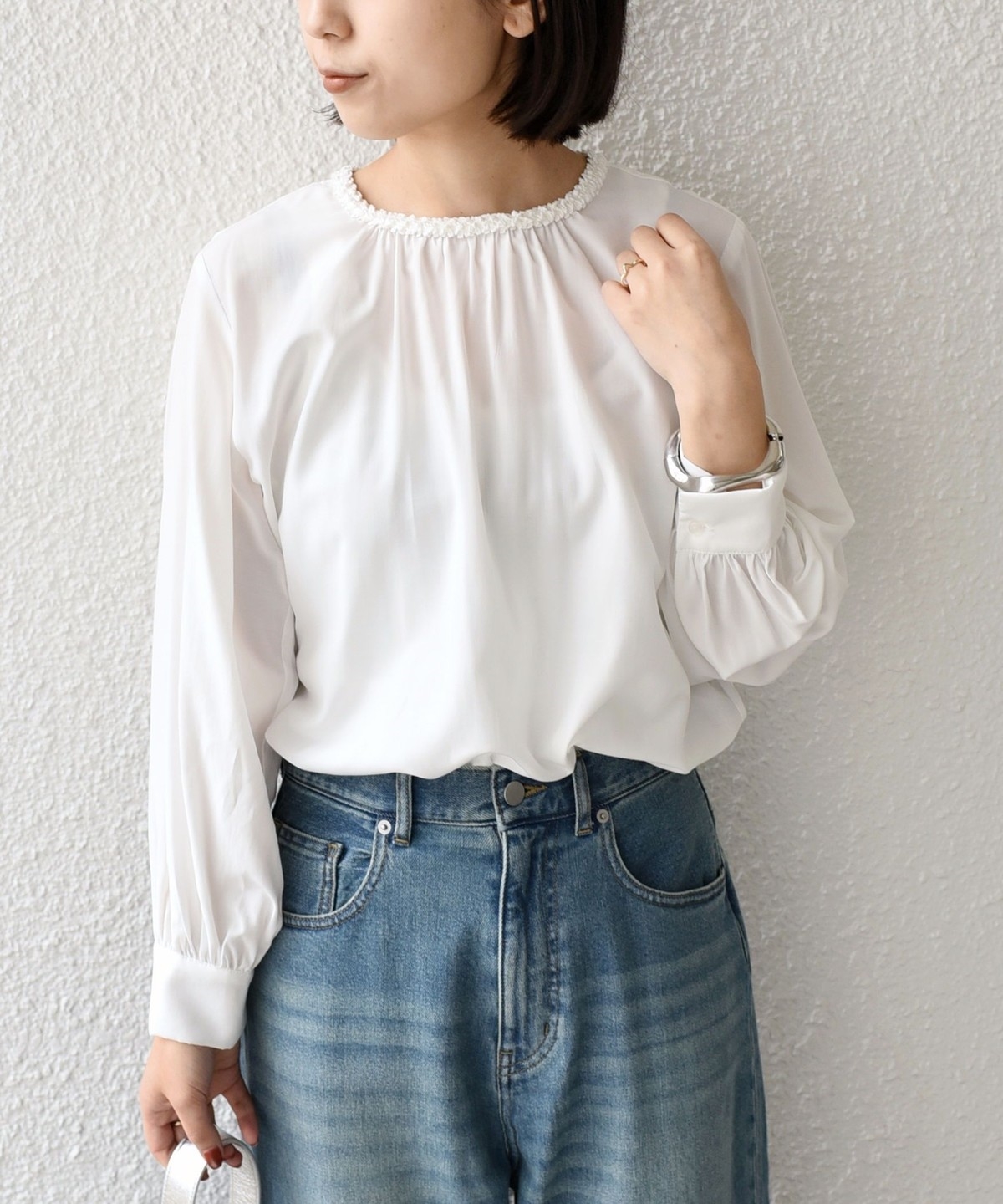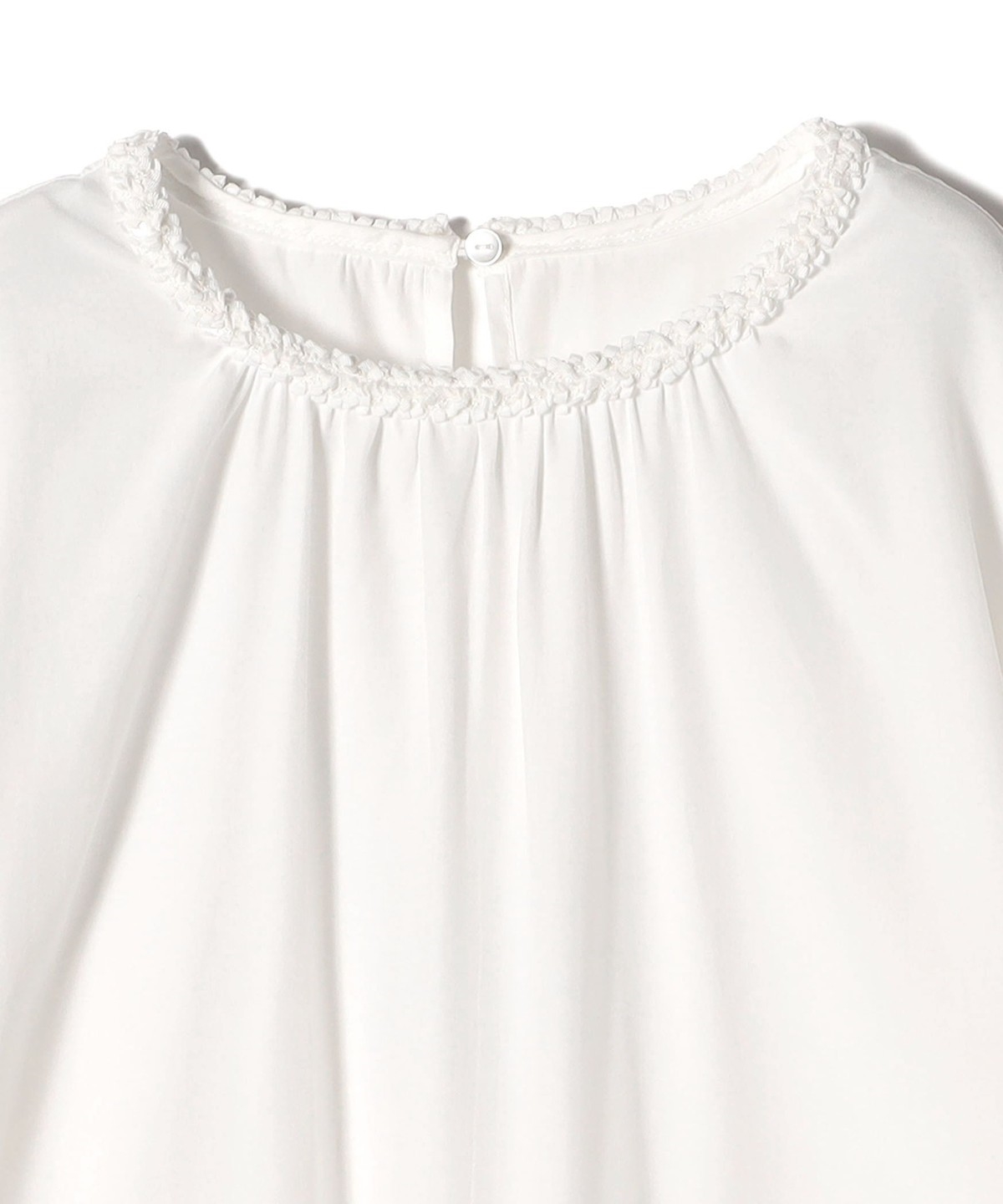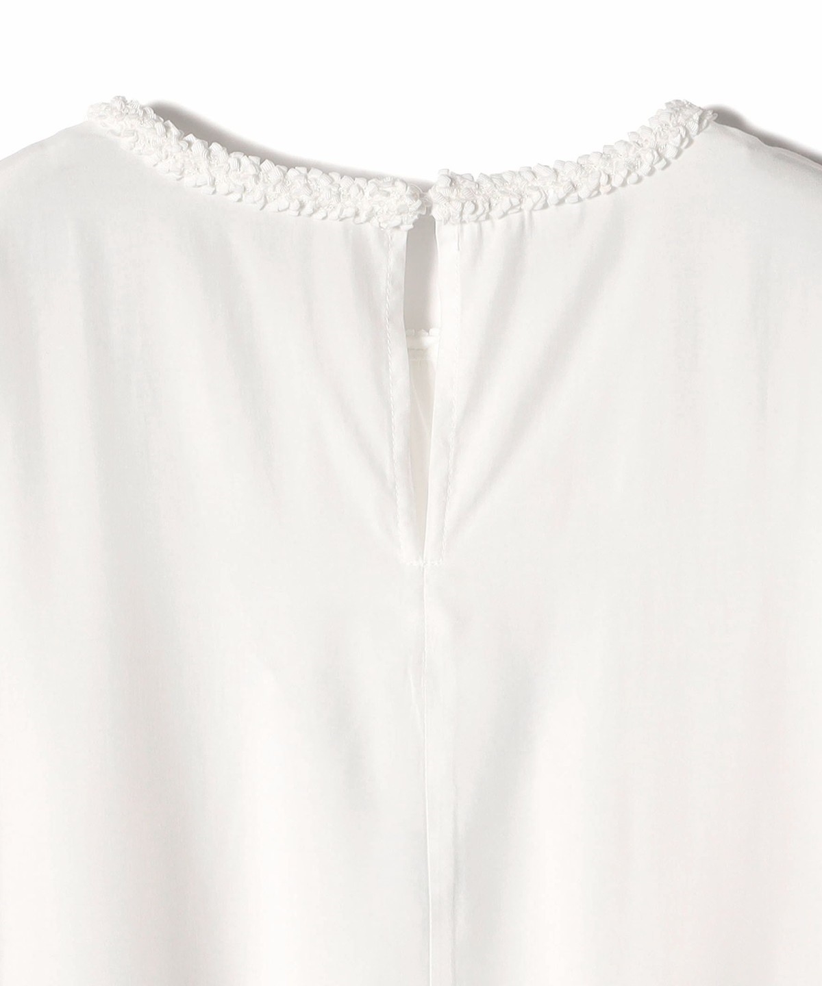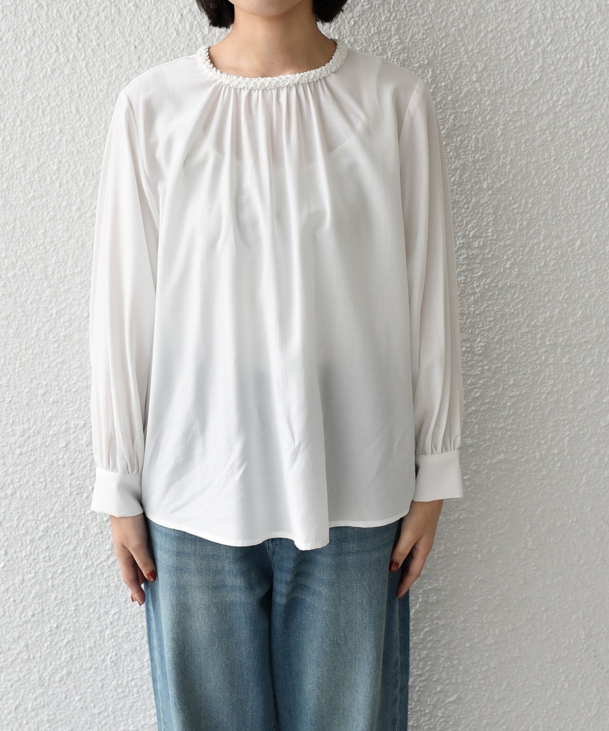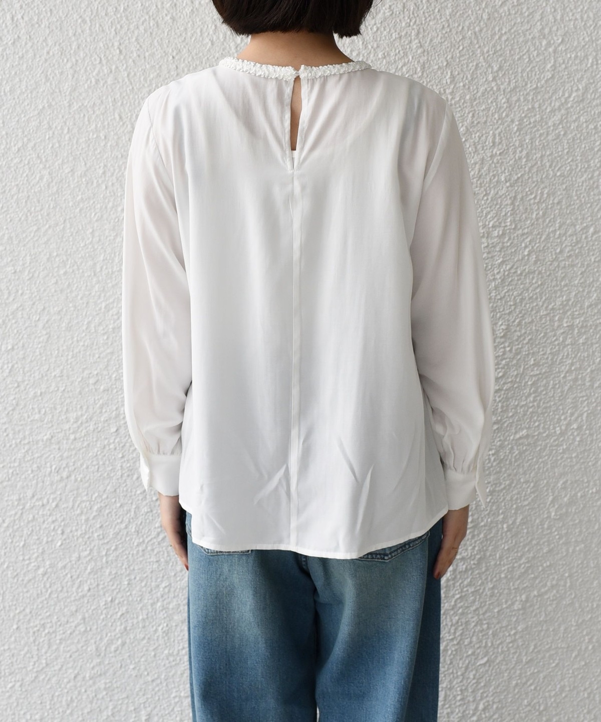 首元に小花のようなデザインを施したクルーネックデザインのブラウス。
