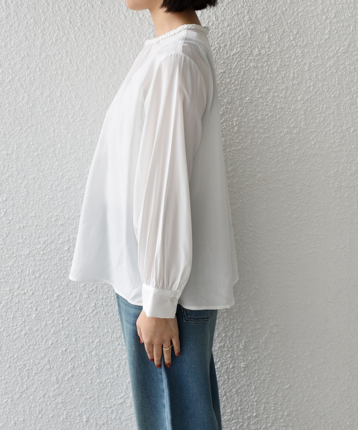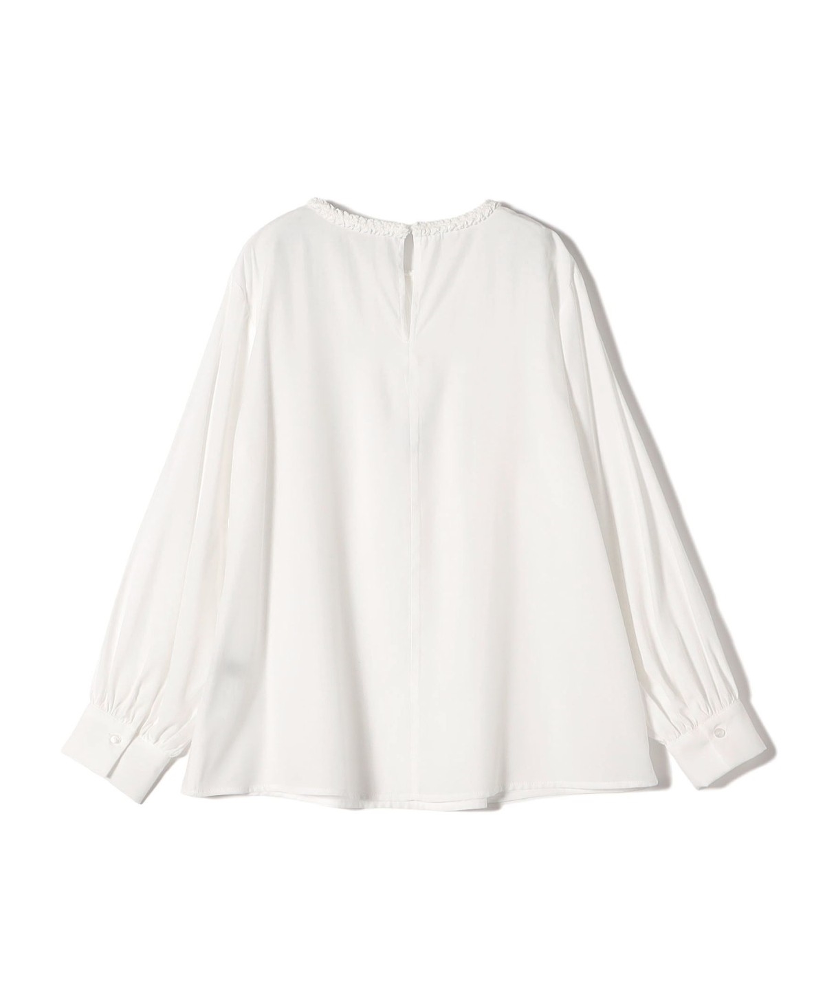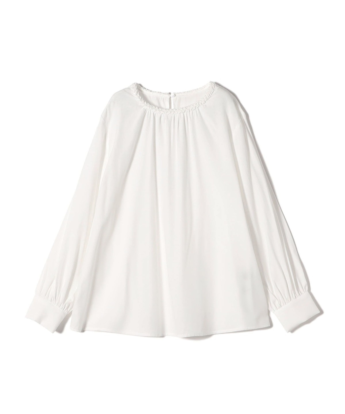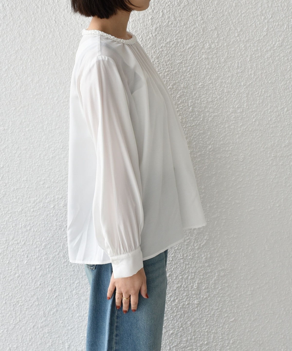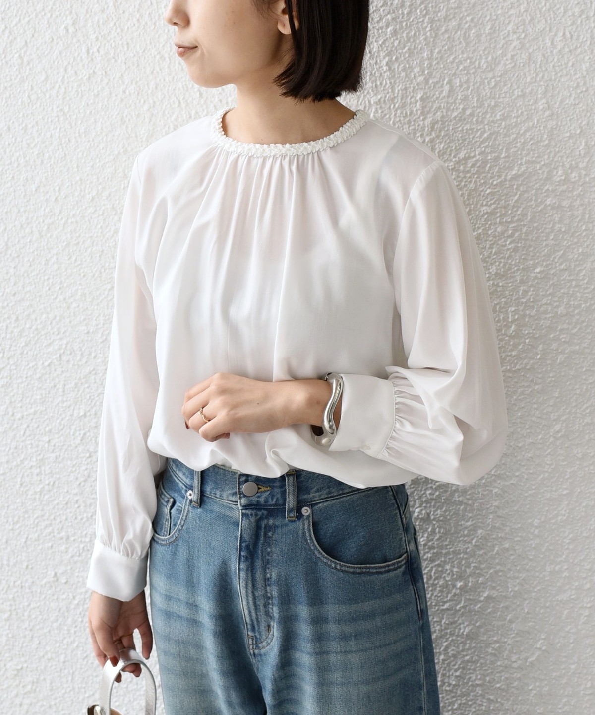 首元に小花のようなデザインを施したクルーネックデザインのブラウス。