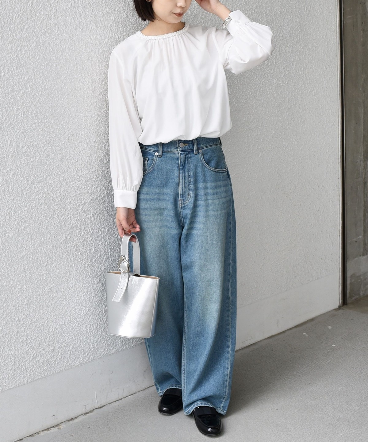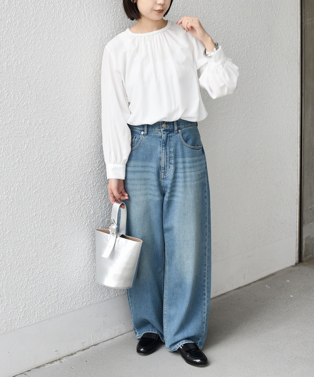 1枚着トップスとしてデニムにタックインするだけでも、さりげない華やかさがあるコーディネートが完成します。