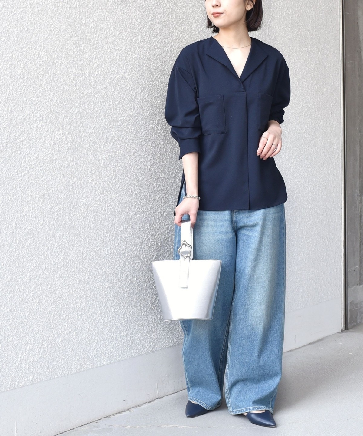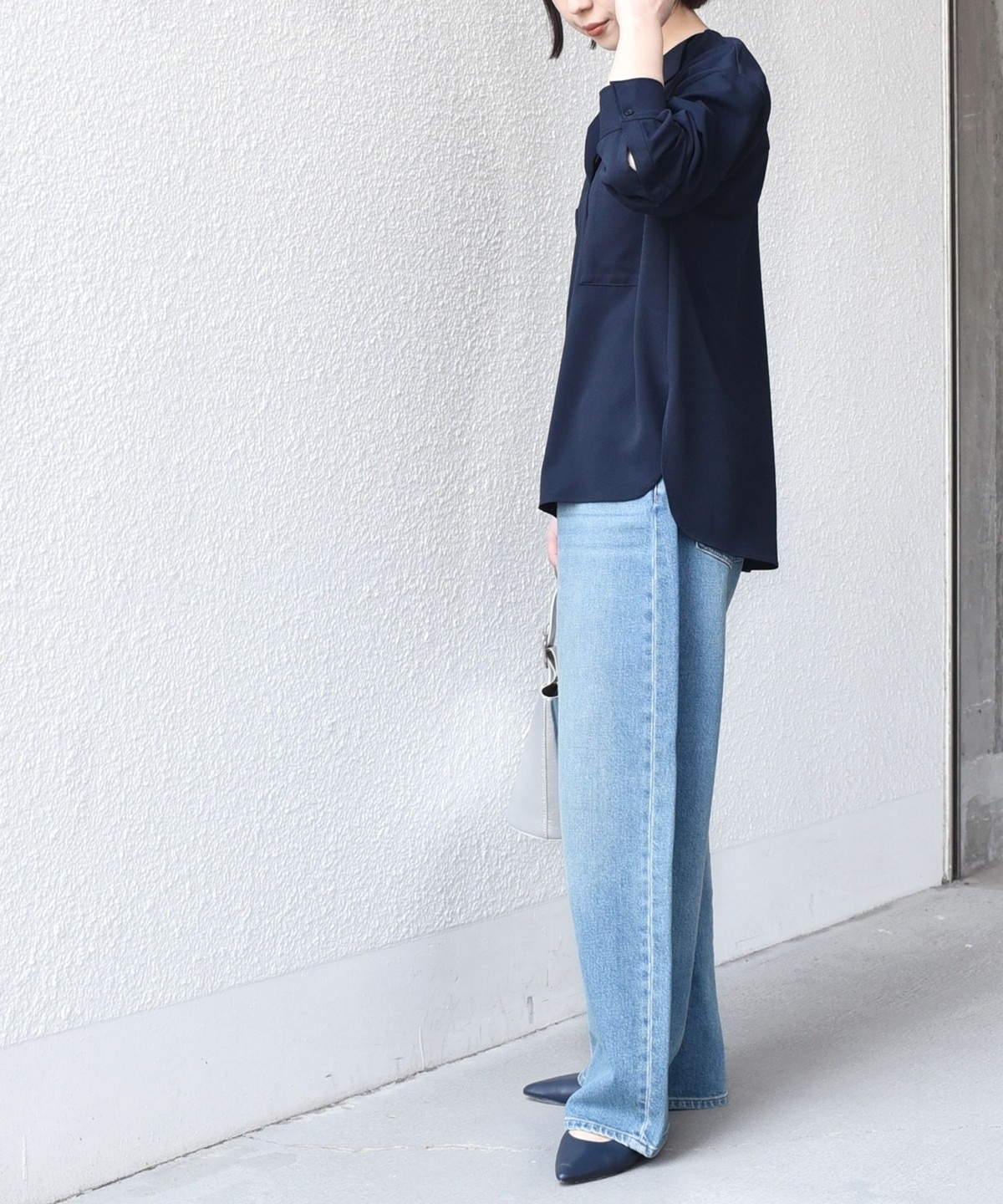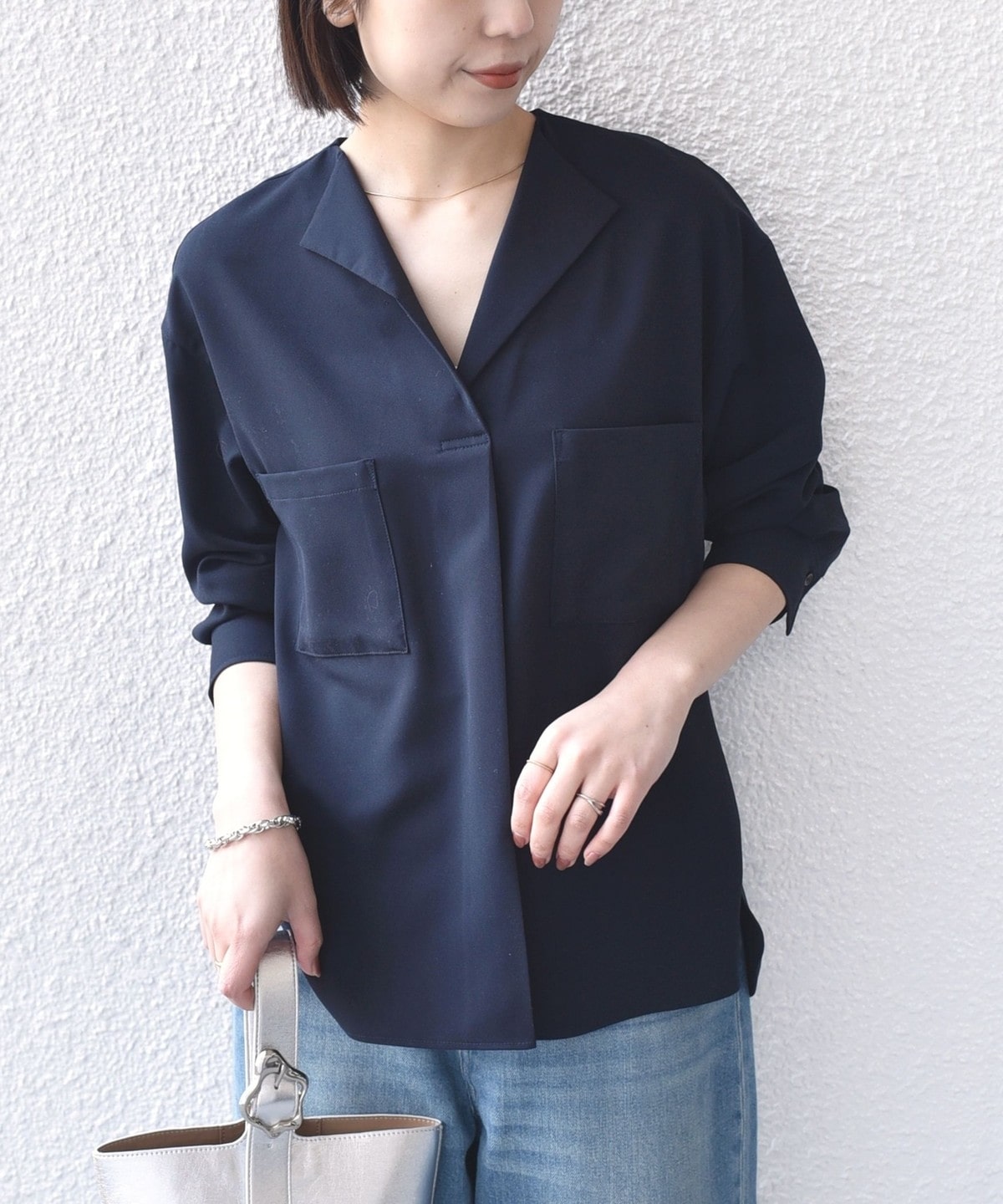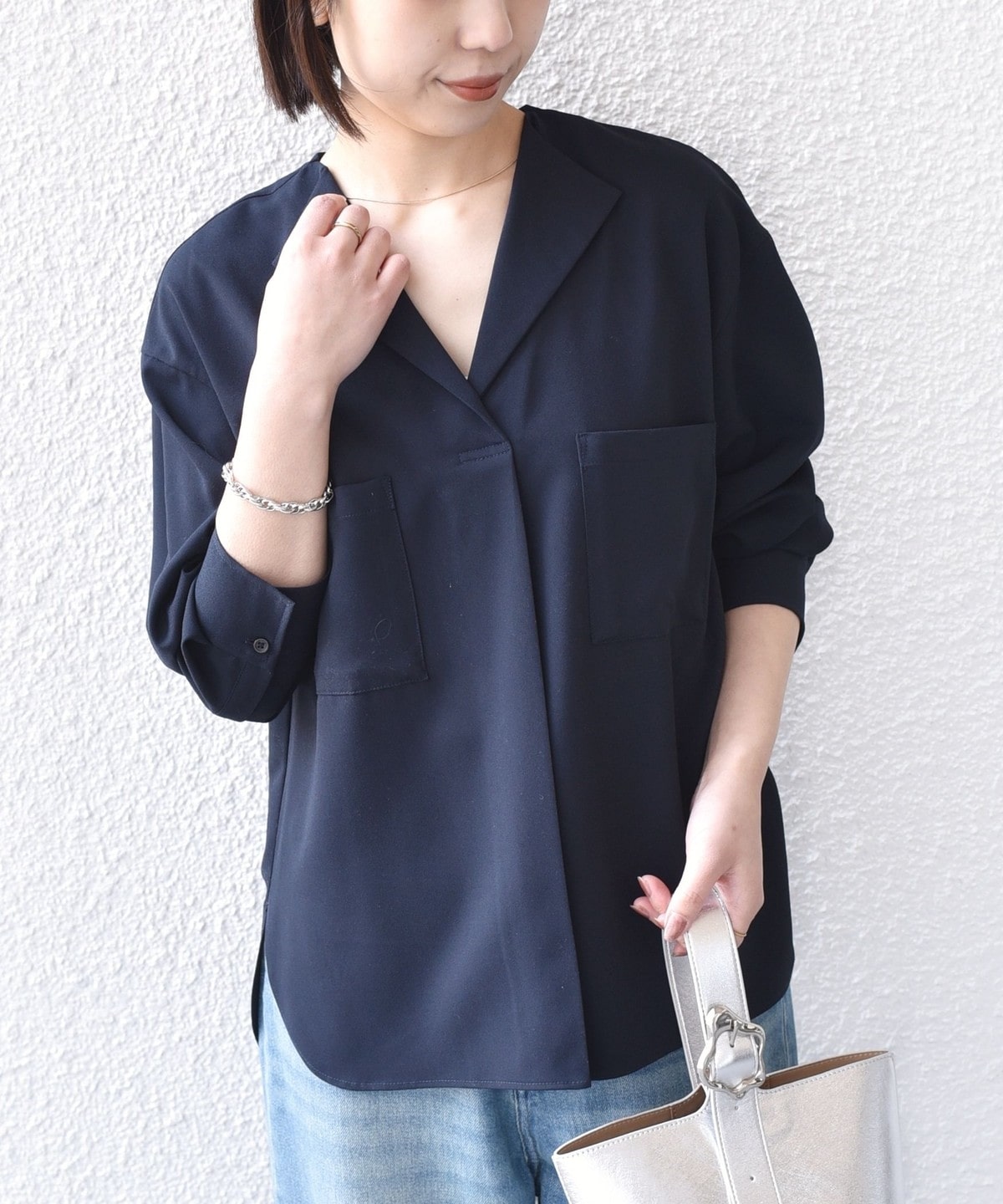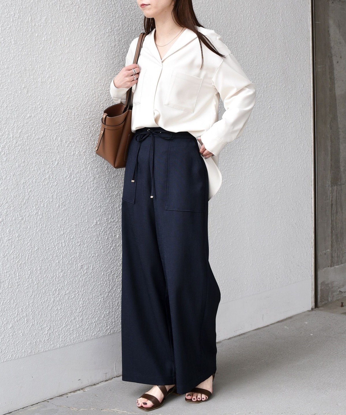 Vネックがすっきりとした印象を引き立てつつ、落ち感のある素材が女性らしさを引き立ててくれます。